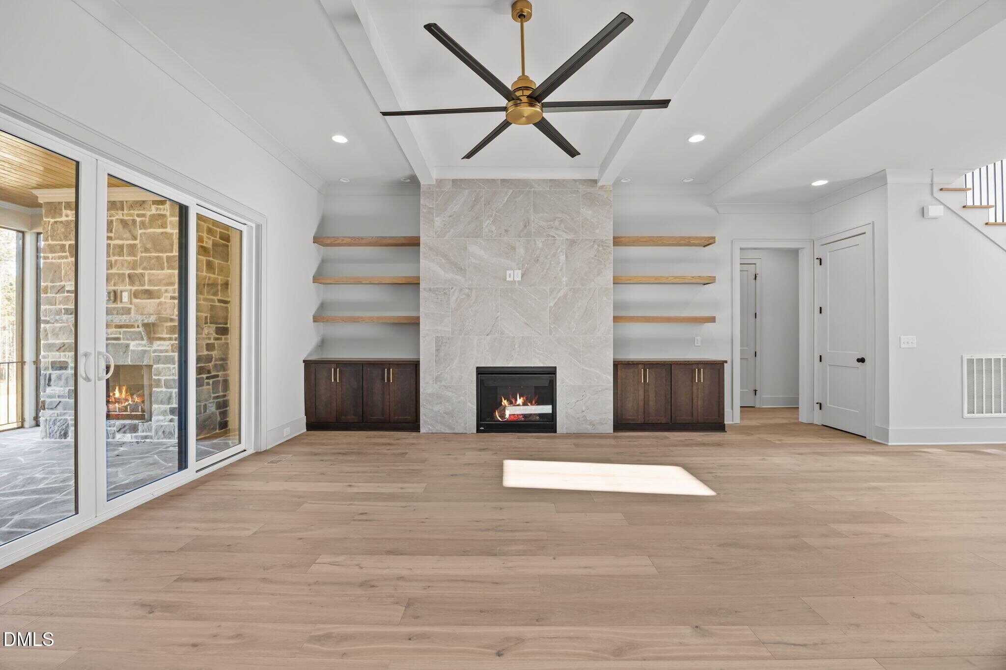 The family room features painted ceiling beams, gas fireplace with tile to ceiling surround and flanking built-in cabinets topped with floating shelves and a multi-slider to the rear screened porch with flagstone flooring and stone surround fireplace overlooking a huge, flat backyard!