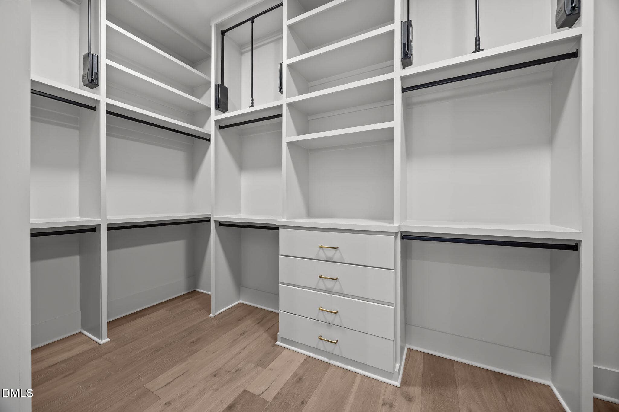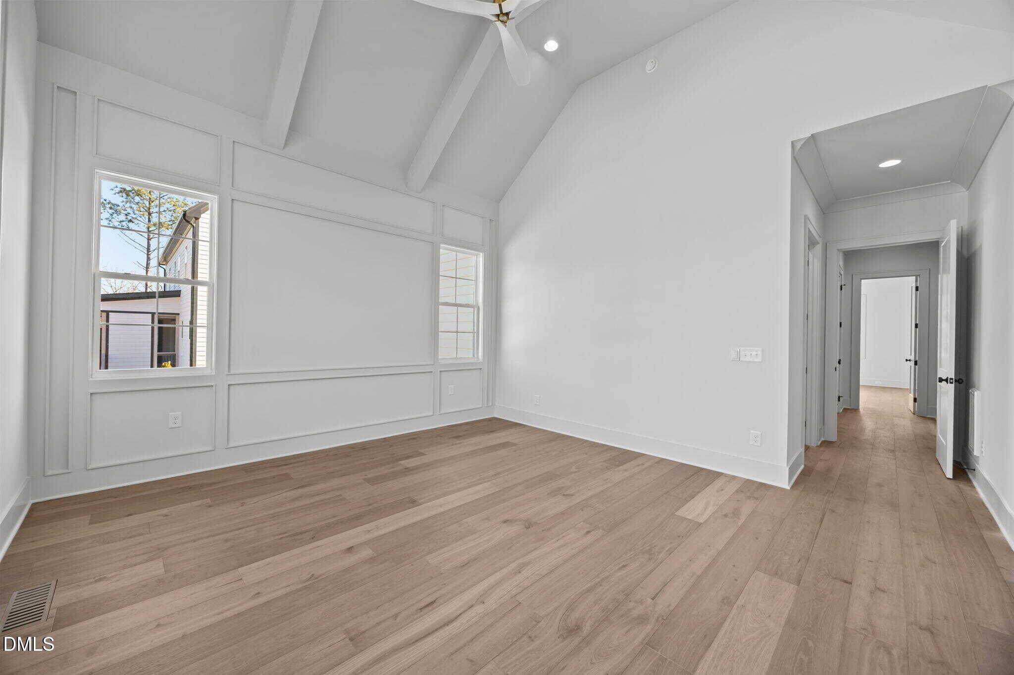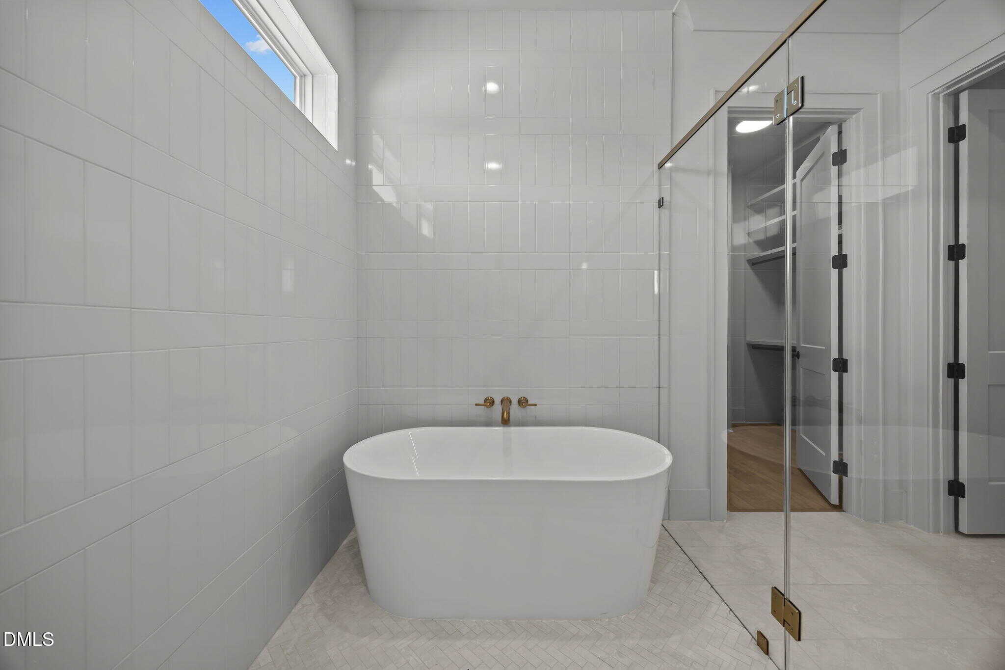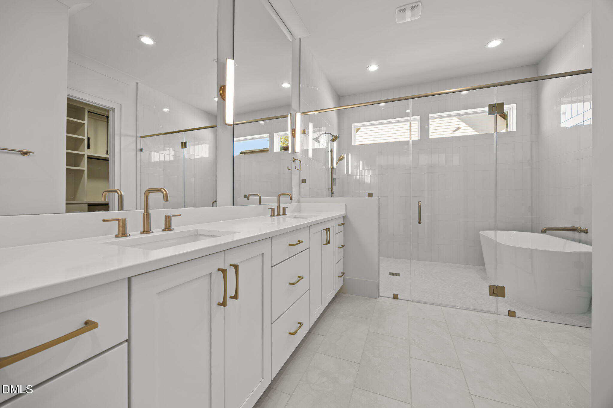 The main level primary suite with vaulted ceiling, hardwood flooring and luxurious en-suite bath with a zero-entry spa style shower wrapped with tile to ceiling, transoms and a freestanding tub, a painted dual vanity with quartz top and designer sconces and walk-in closet with custom built-ins.