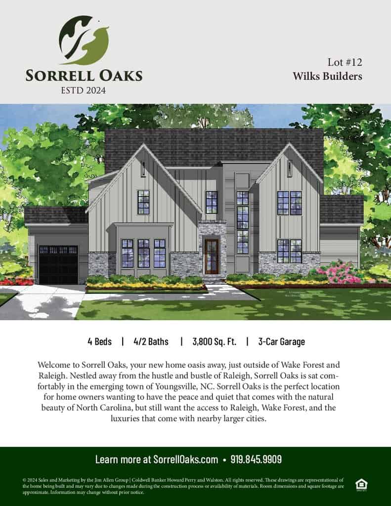 Custom built by Wilks Builders in the exclusive Sorrell Oaks community of Youngsville. Offering 3800 square feet with a soaring two-strory foyer entry and wide plank hardwoods throughout the main living areas. Designer lighting, upgraded trimwork and elegant finishes span throughout!