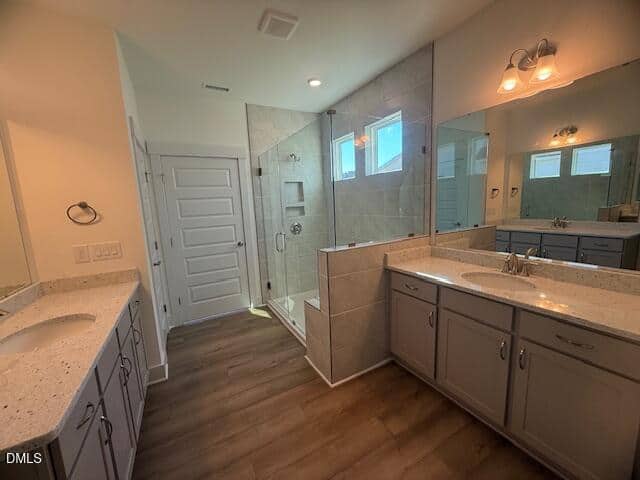 Retreat to the private primary suite, featuring a luxury bath with a huge tiled walk-in shower with built-in seat — the perfect place to unwind.
