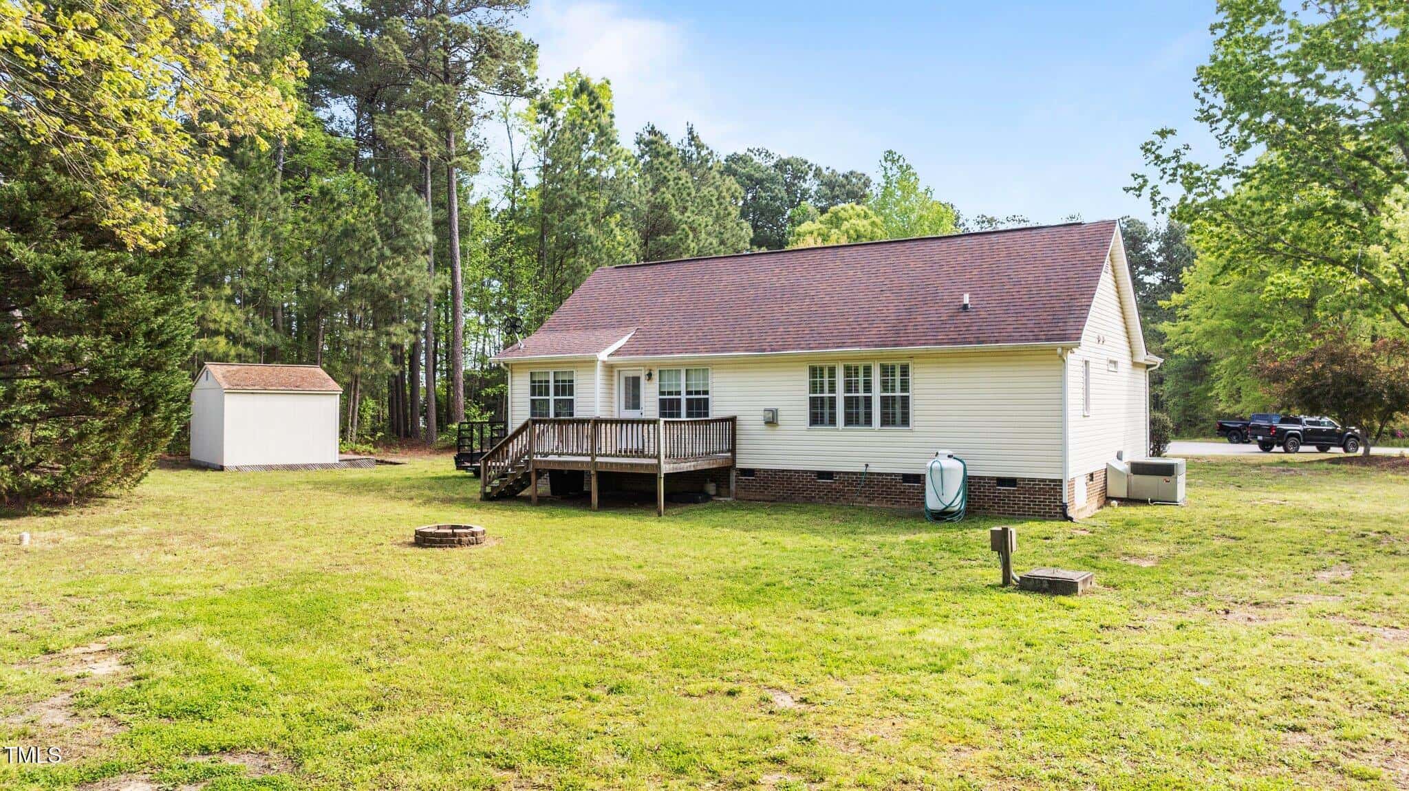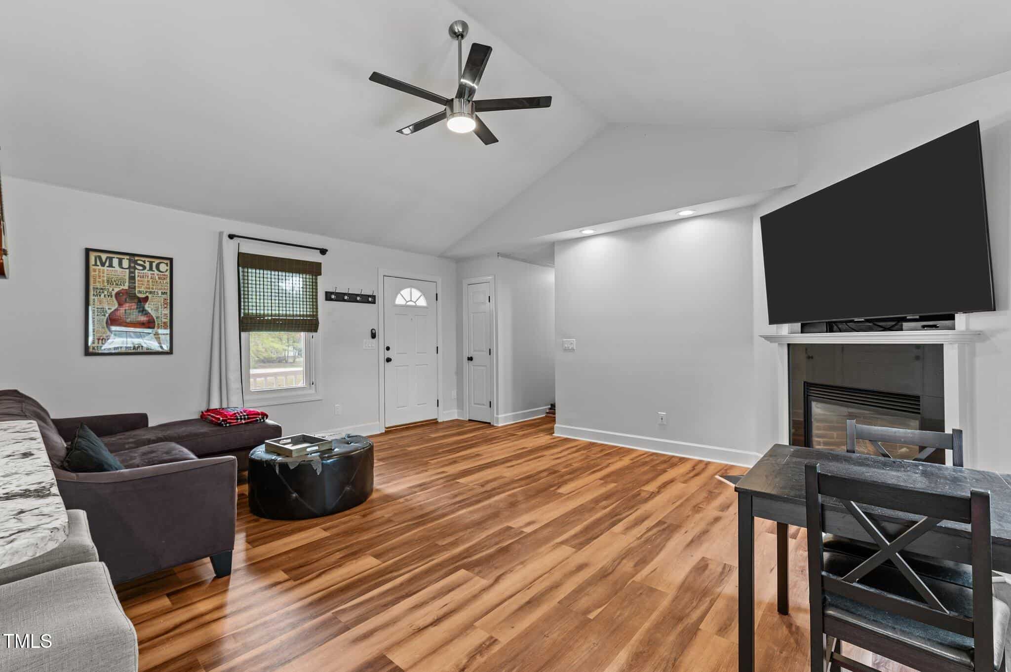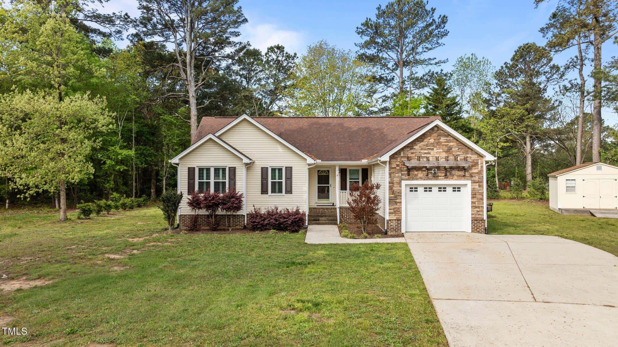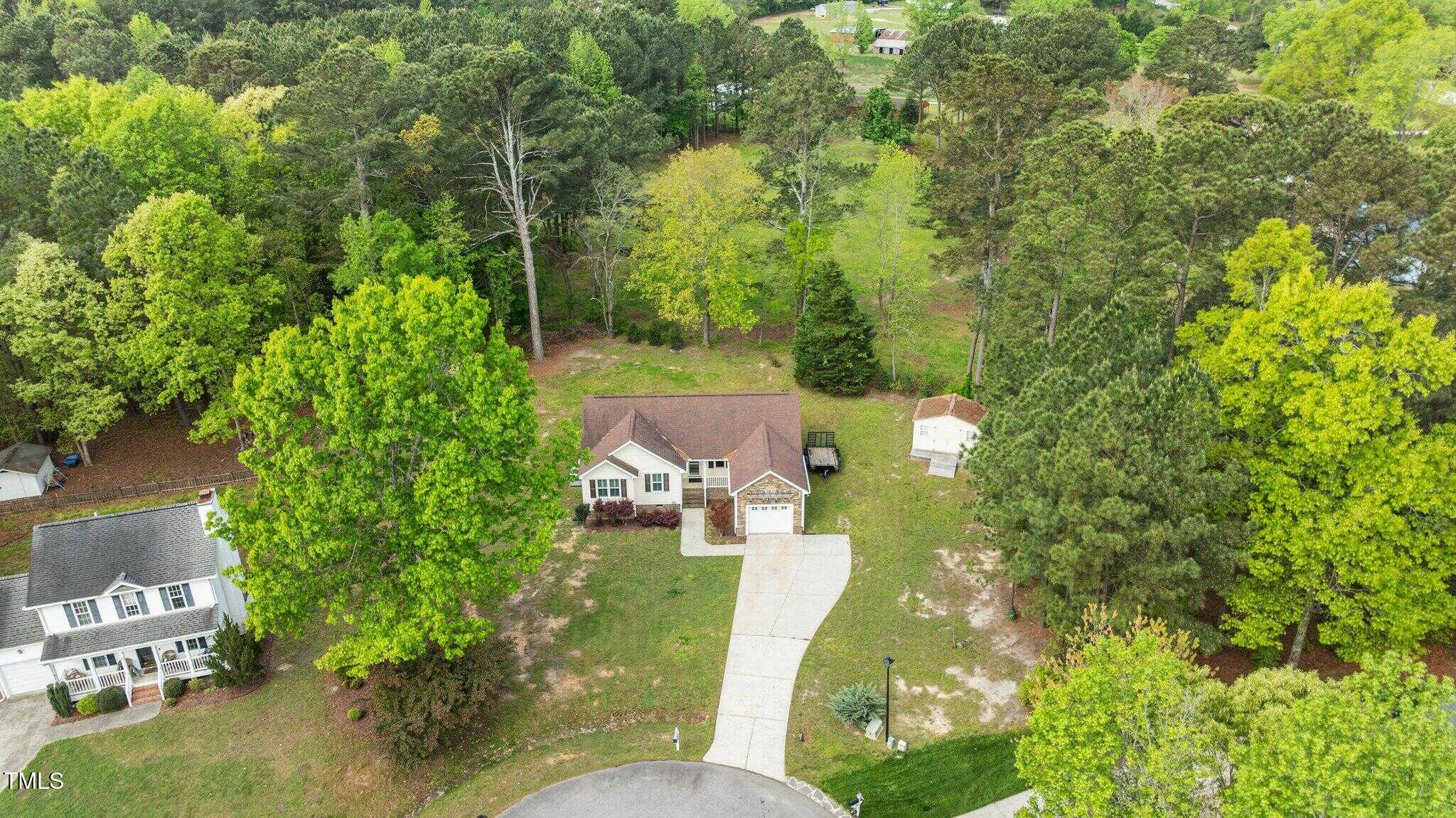Tucked away in a quiet cul-de-sac, this 3-bedroom, 2-bath ranch-style home offers comfortable living on a .59-acre lot with thoughtful updates throughout. Vaulted ceilings and natural light create an open feel, complemented by brand-new LVP flooring and upgraded LED lighting. The hall bathroom has been fully renovated, and both bathrooms feature solid wood vanities. Additional updates include custom closets, new outlets, whisper-quiet exhaust fans, and a thermostatically controlled gas fireplace. Plantation shutters in the bedrooms and primary bath add charm, while woven wood window treatments with privacy screens in the living room and kitchen enhance both style and function. The kitchen features granite countertops and counter-depth appliances. Outside, enjoy a spacious deck, landscaped yard, and a 16×12 storage shed. Major systems are in great shape with a Trane HVAC (approx. 5 years old) and a roof replaced around 2017. Located in a community with no city taxes and convenient access to Wake Forest, Rolesville, and Raleigh—plus neighborhood amenities including a pool, ball fields, and more.