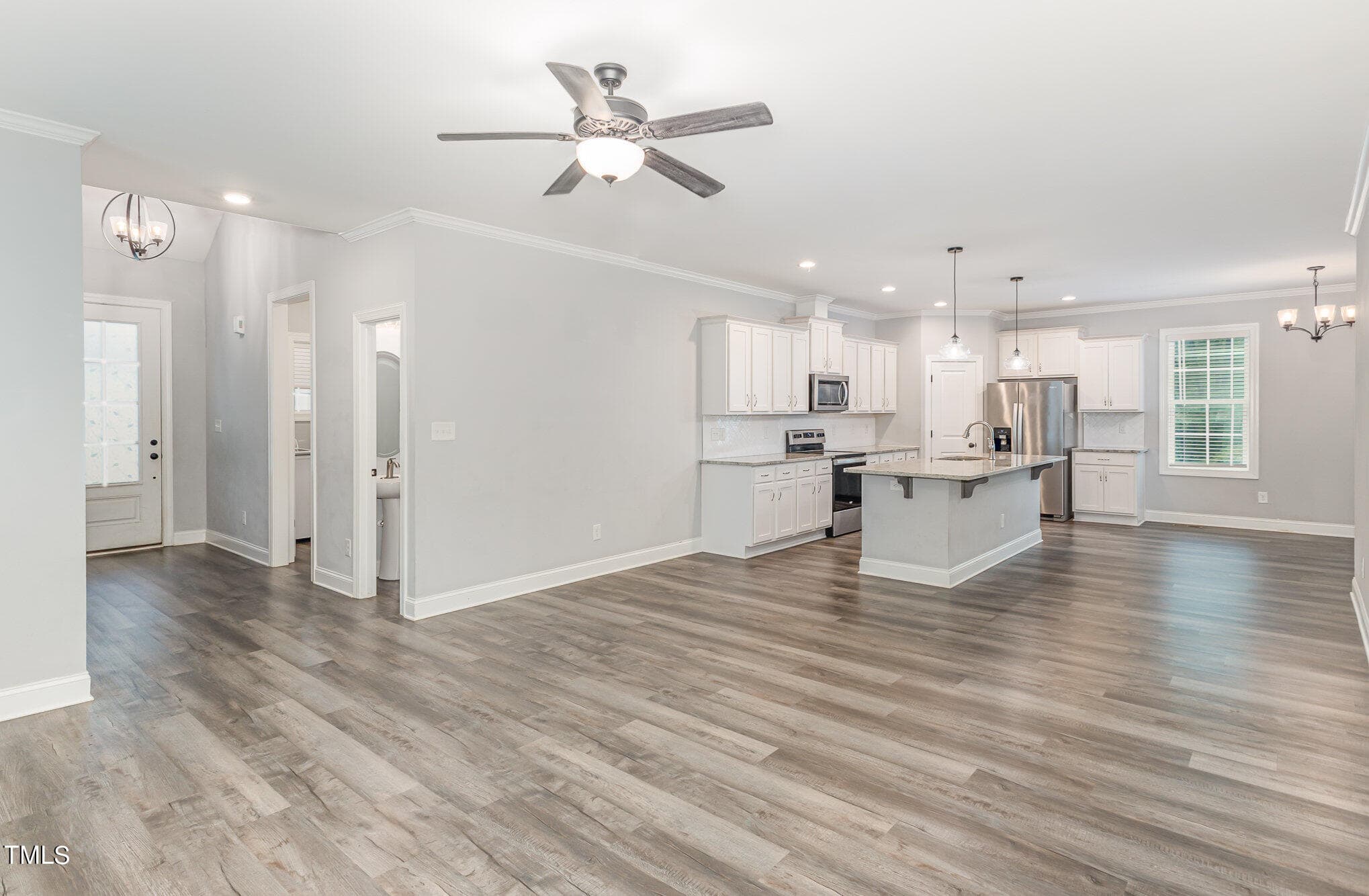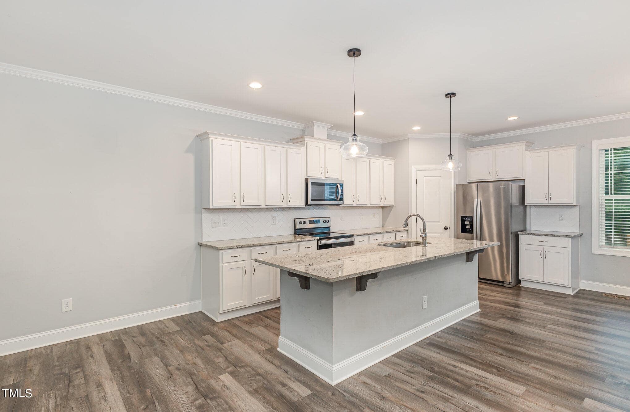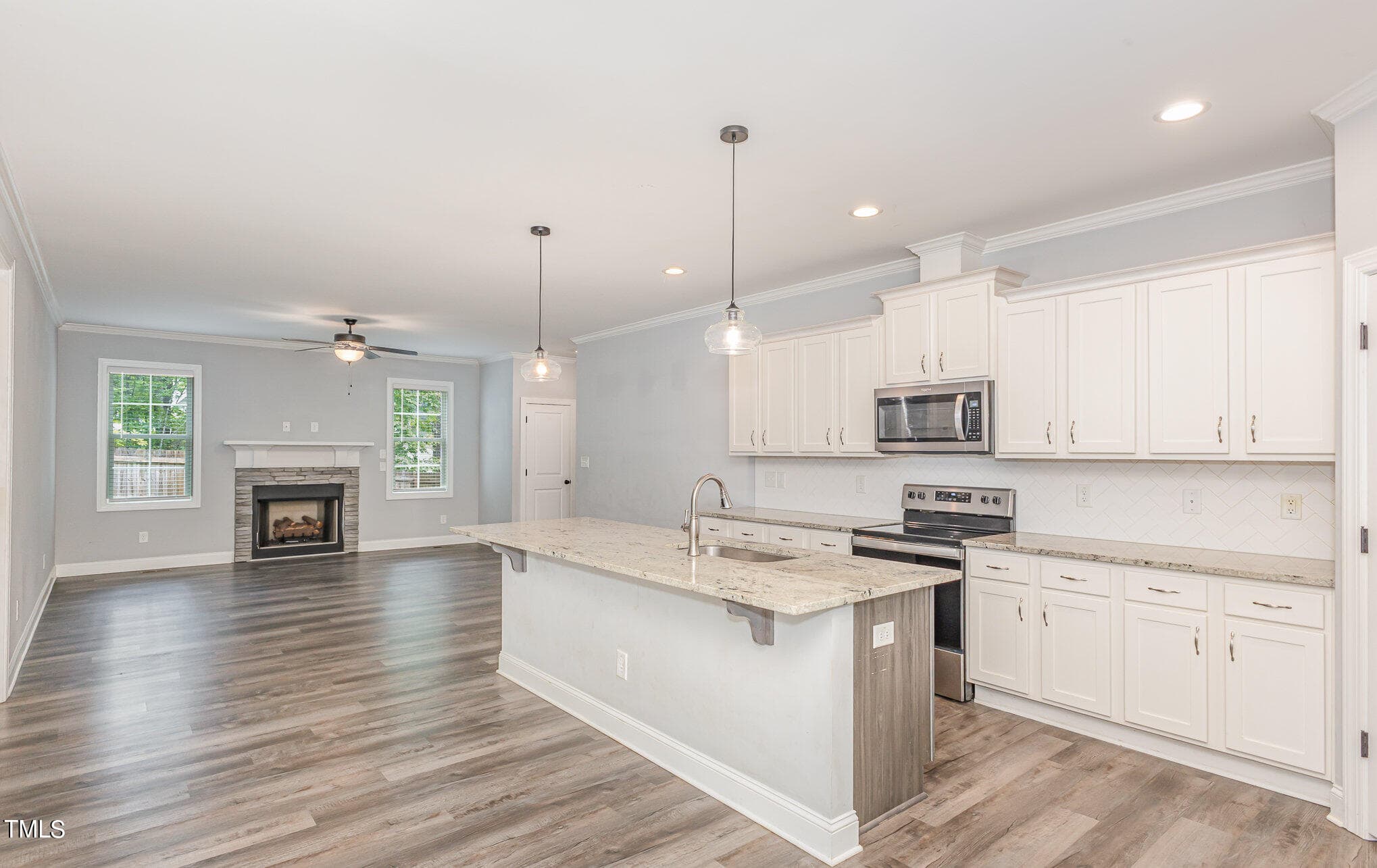 The kitchen is open with a huge granite island, all stainless appliances and walk in pantry. The open kitchen and family room are just perfect for gathering space!