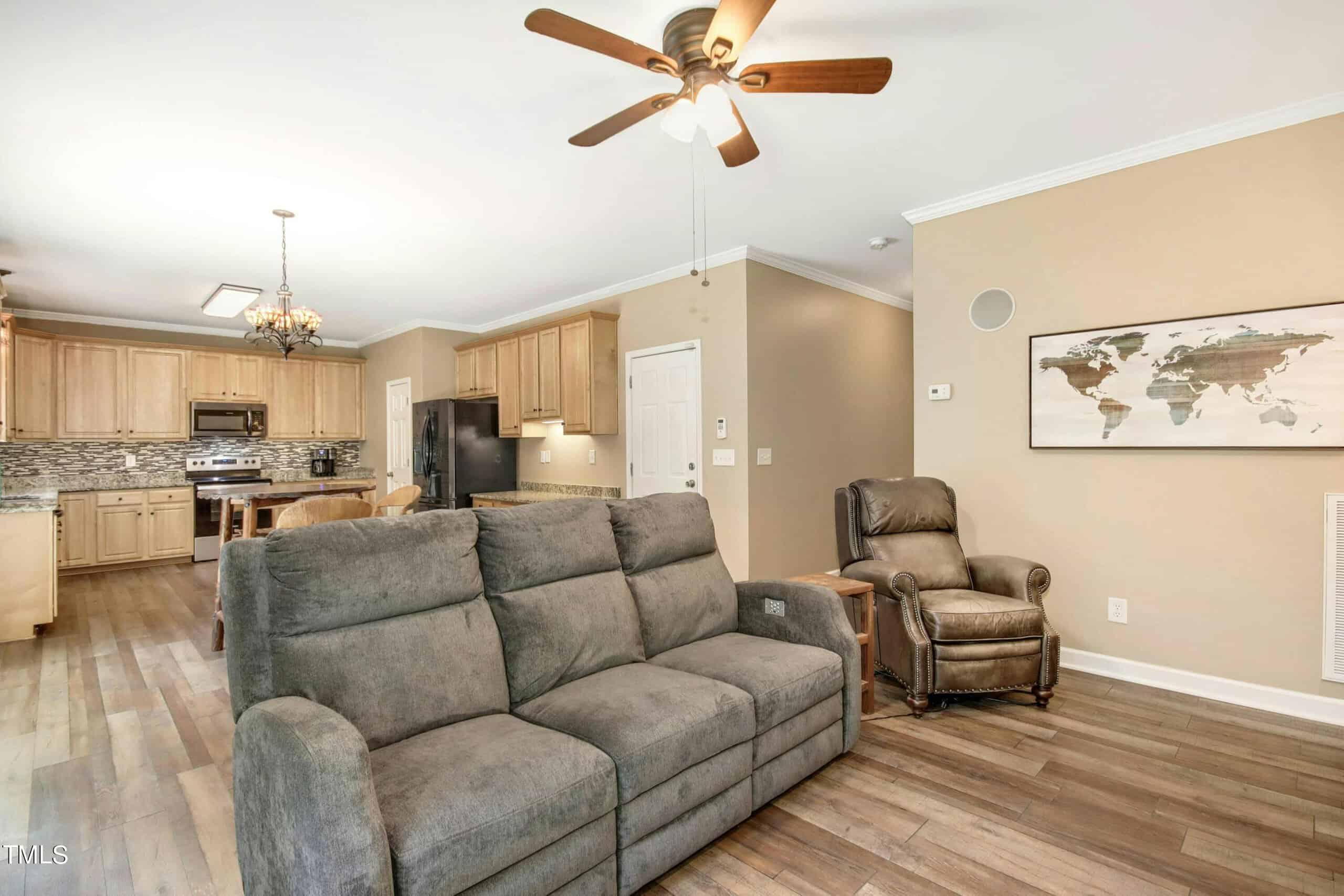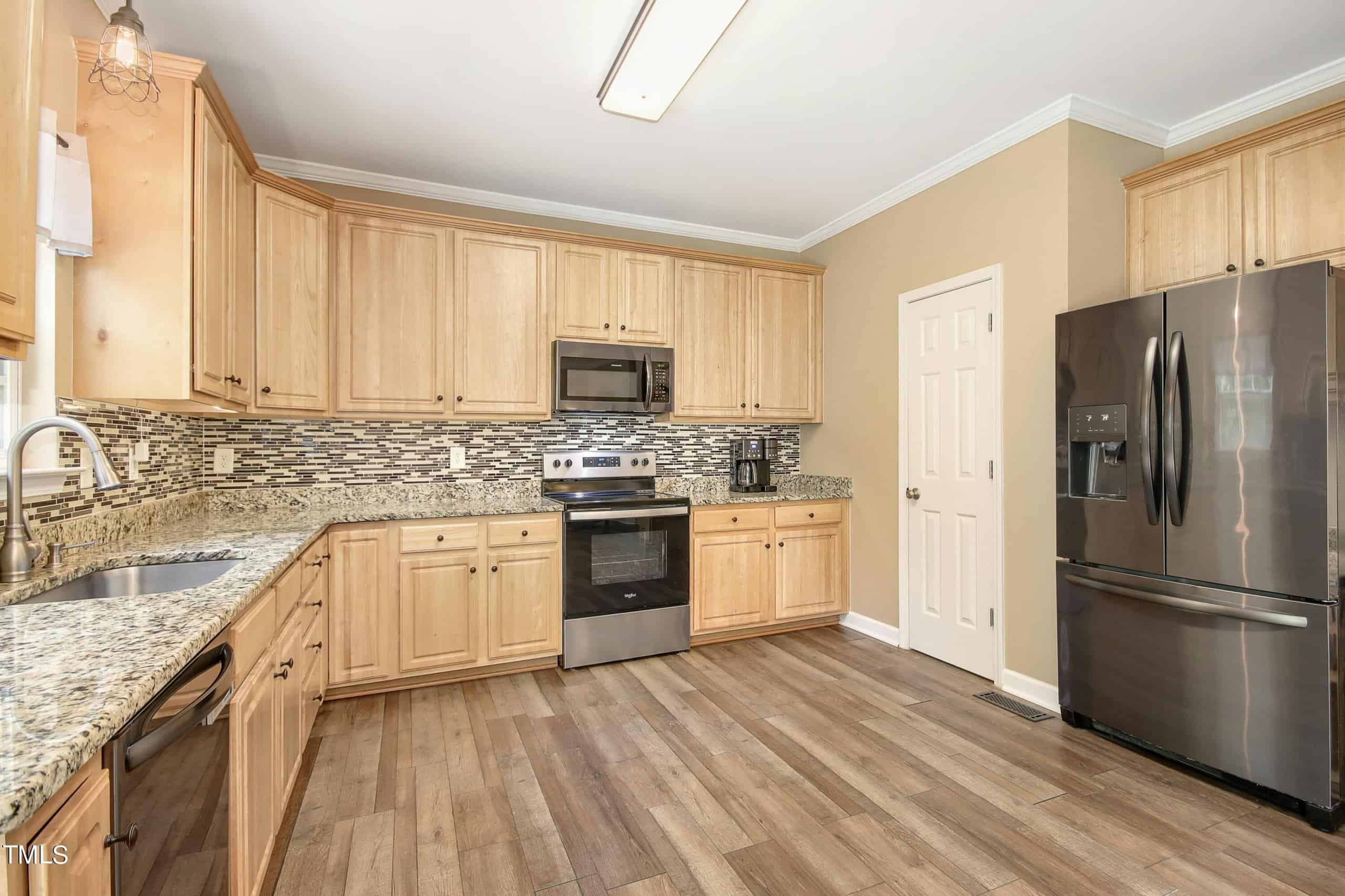 As you step inside this charming 3 bedroom 2.5 bathroom home, you’re greeted by a cozy living space with a gas log fireplace, vinyl plank hardwood floors throughout & an abundance of natural light. The spacious kitchen boasts solid surface countertops, tile backsplash with a pantry, perfect for all your storage needs. The kitchen seamlessly flows into the dining area, making it ideal for entertaining.