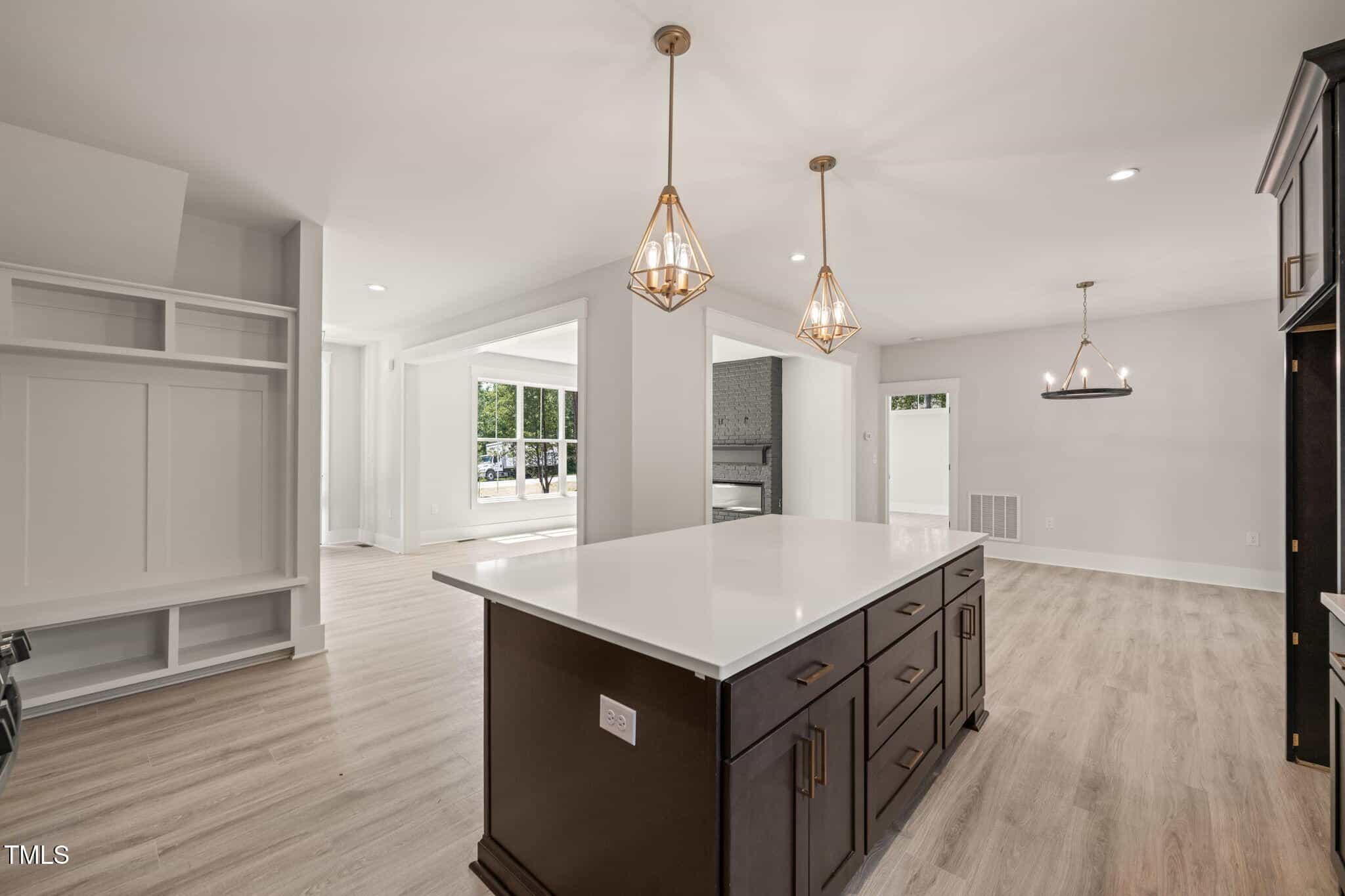 A welcoming covered front entry leads into an open-concept layout designed for comfort and functionality. The family room features a cozy fireplace, while the kitchen boasts a spacious prep island, walk-in pantry with a convenient grocery pass from the garage, and seamless flow into the dining area. A screened rear porch extends the living space outdoors.
