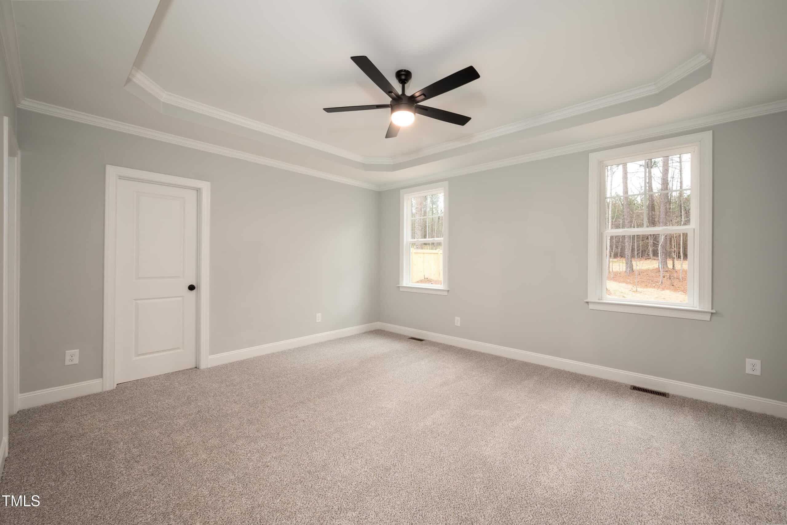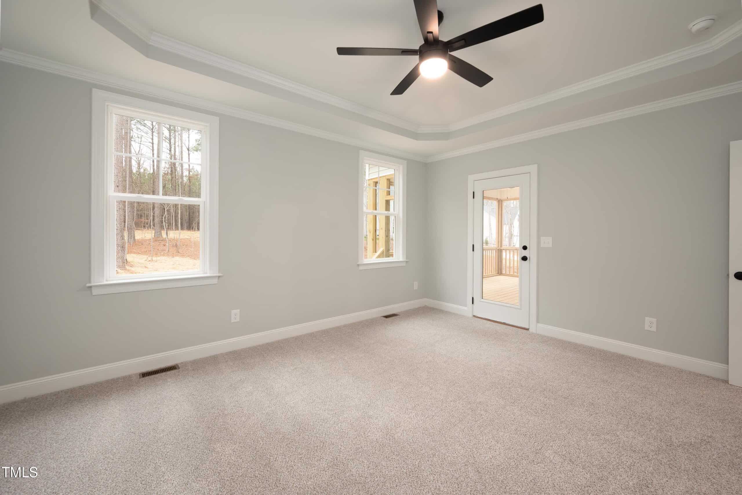 Master bedroom with Tray Ceiling and access door to covered porch, walk-in closet/wood shelving! Master bath with shower!