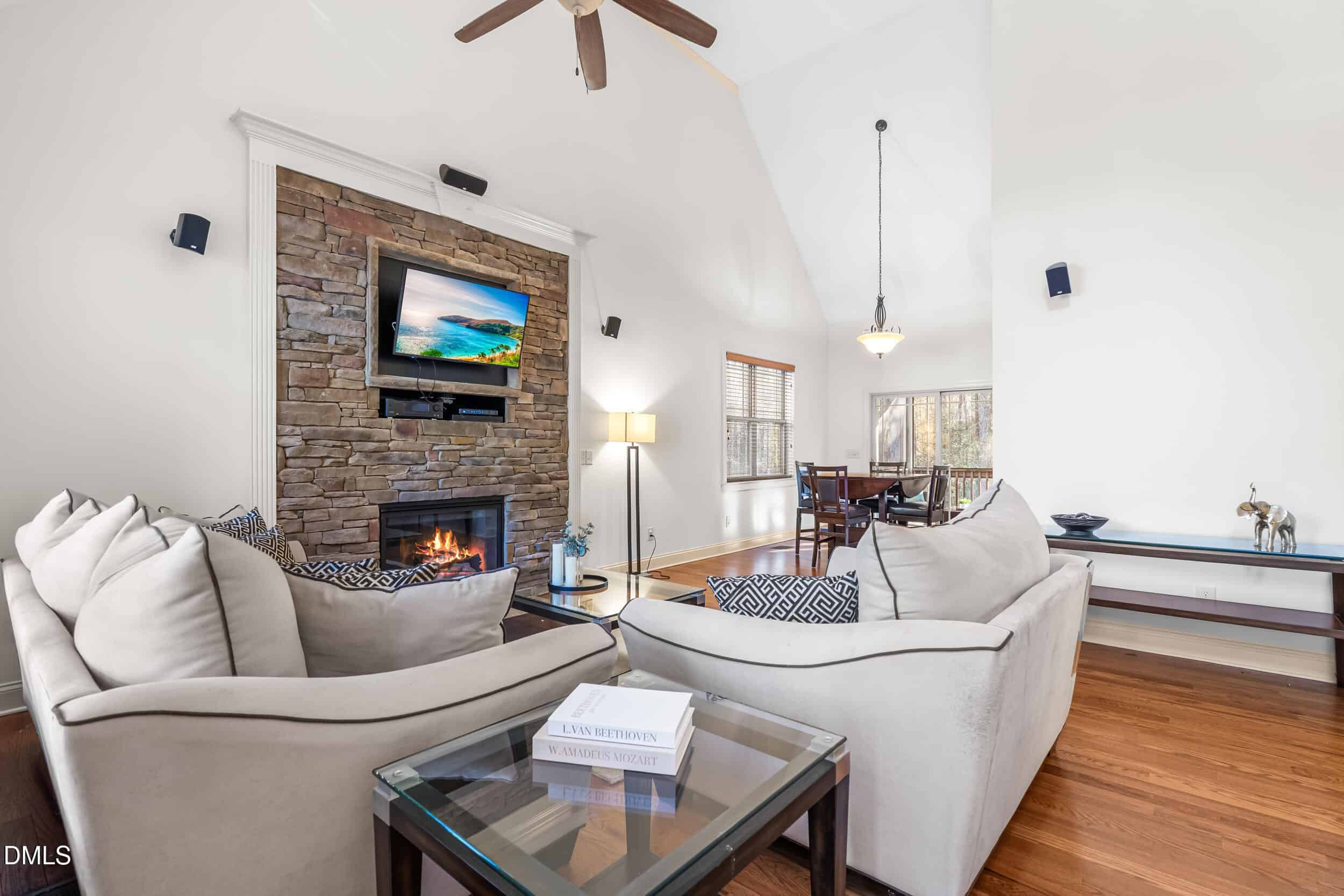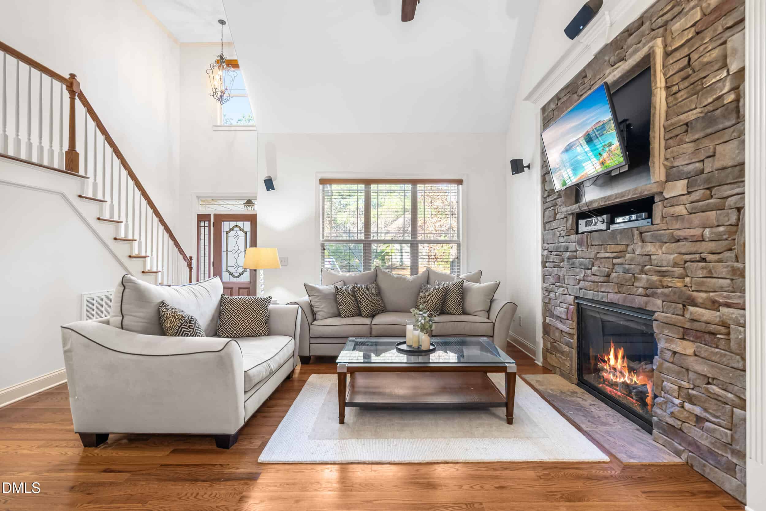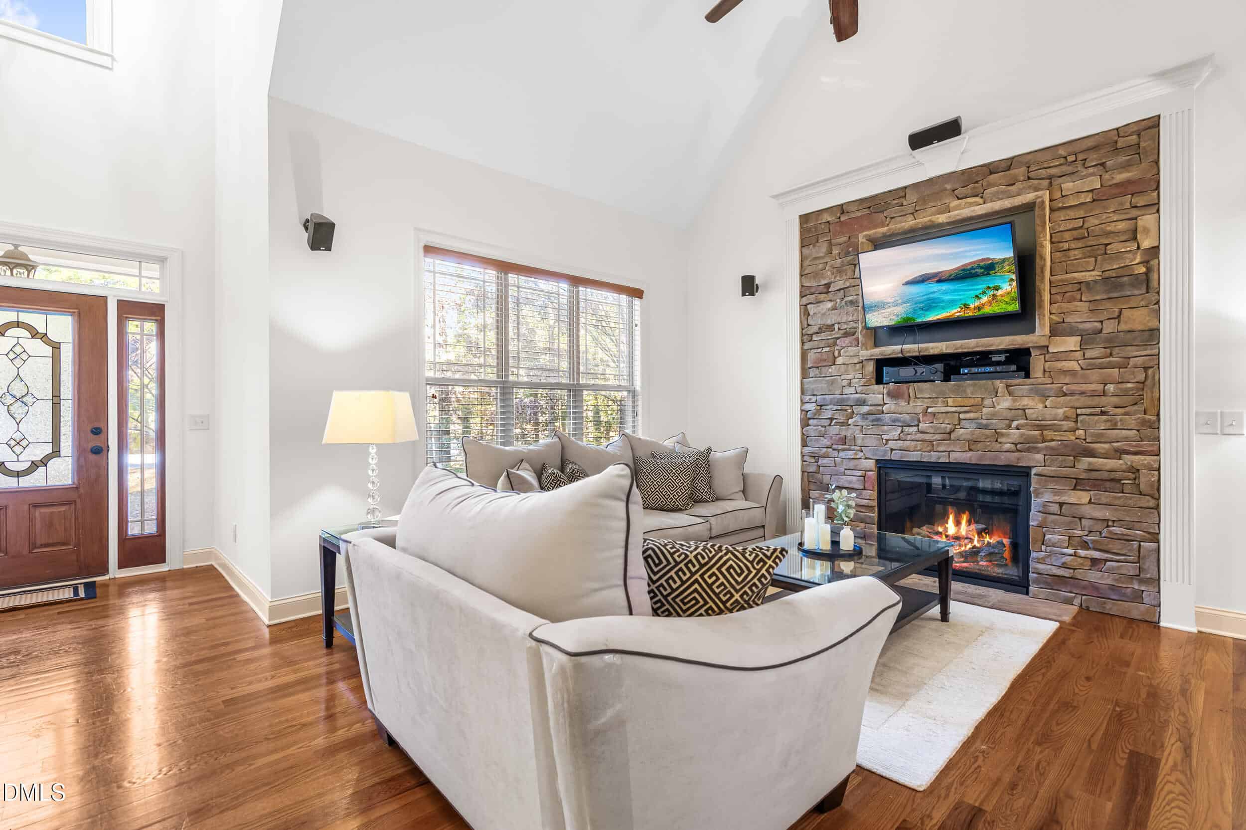 A former Parade of Homes winner, this stunning 4-bedroom, 4-bath transitional home sits on over an acre of fully fenced privacy in the sought-after Braeburn community—just minutes from Wake Forest. Built with no expense spared, this 2,209 square foot residence showcases exceptional craftsmanship throughout: extensive crown molding, tall baseboards, vaulted and tray ceilings, and a dramatic floor-to-ceiling stone gas fireplace anchoring the open-concept living area. Hardwood floors flow through the main level living spaces, kitchen, and foyer, while fresh neutral paint and brand-new carpet (2025) complete the move-in-ready presentation.