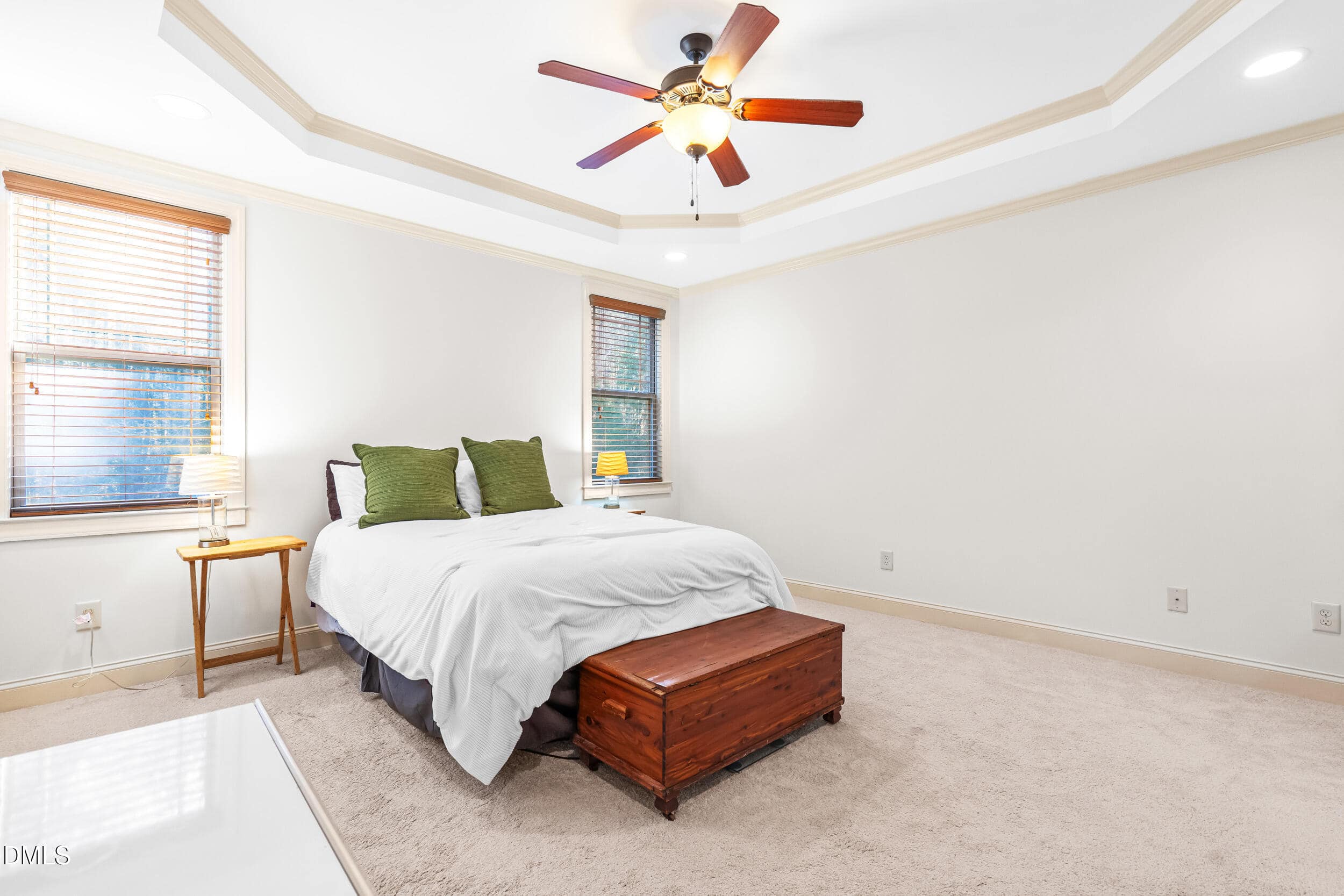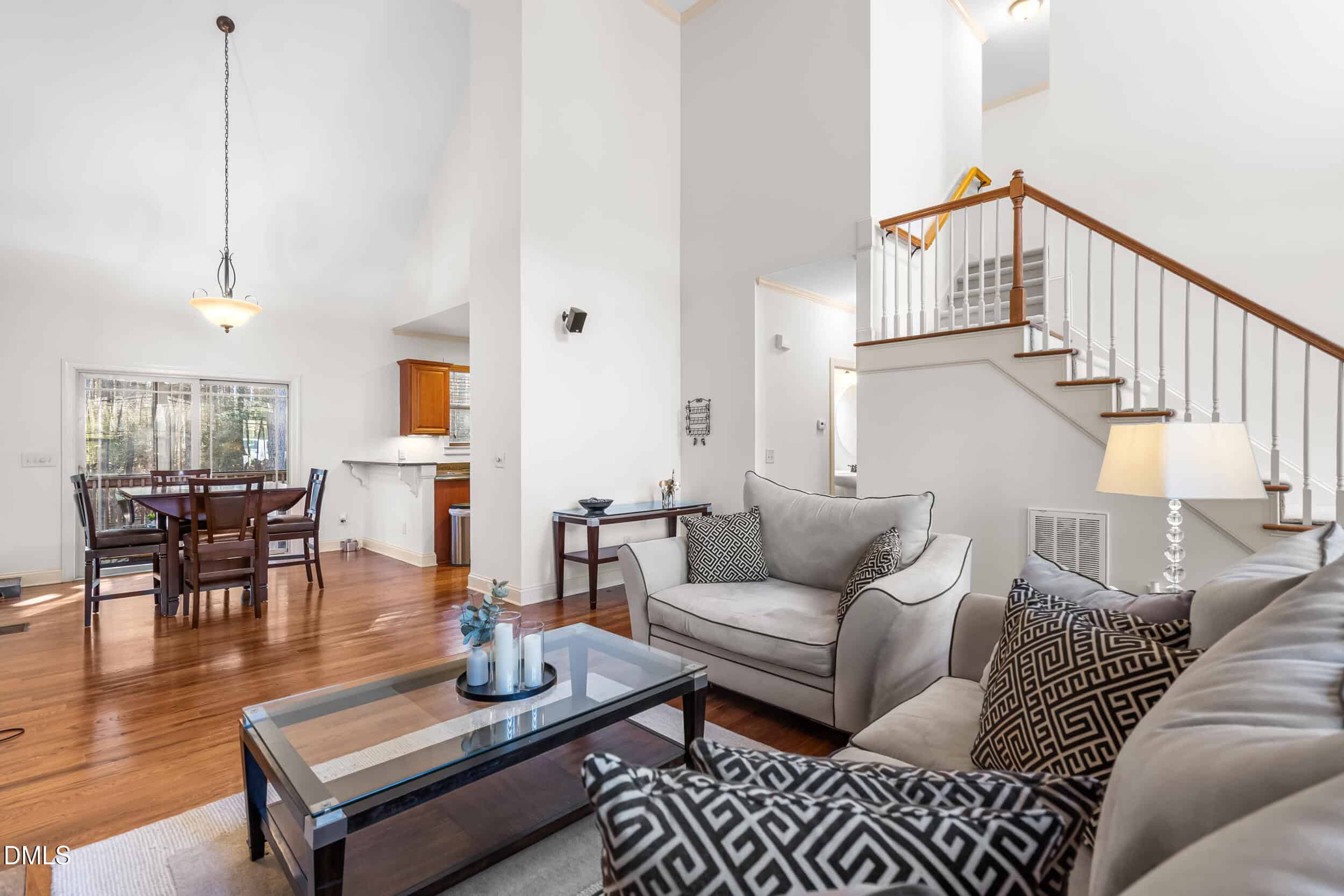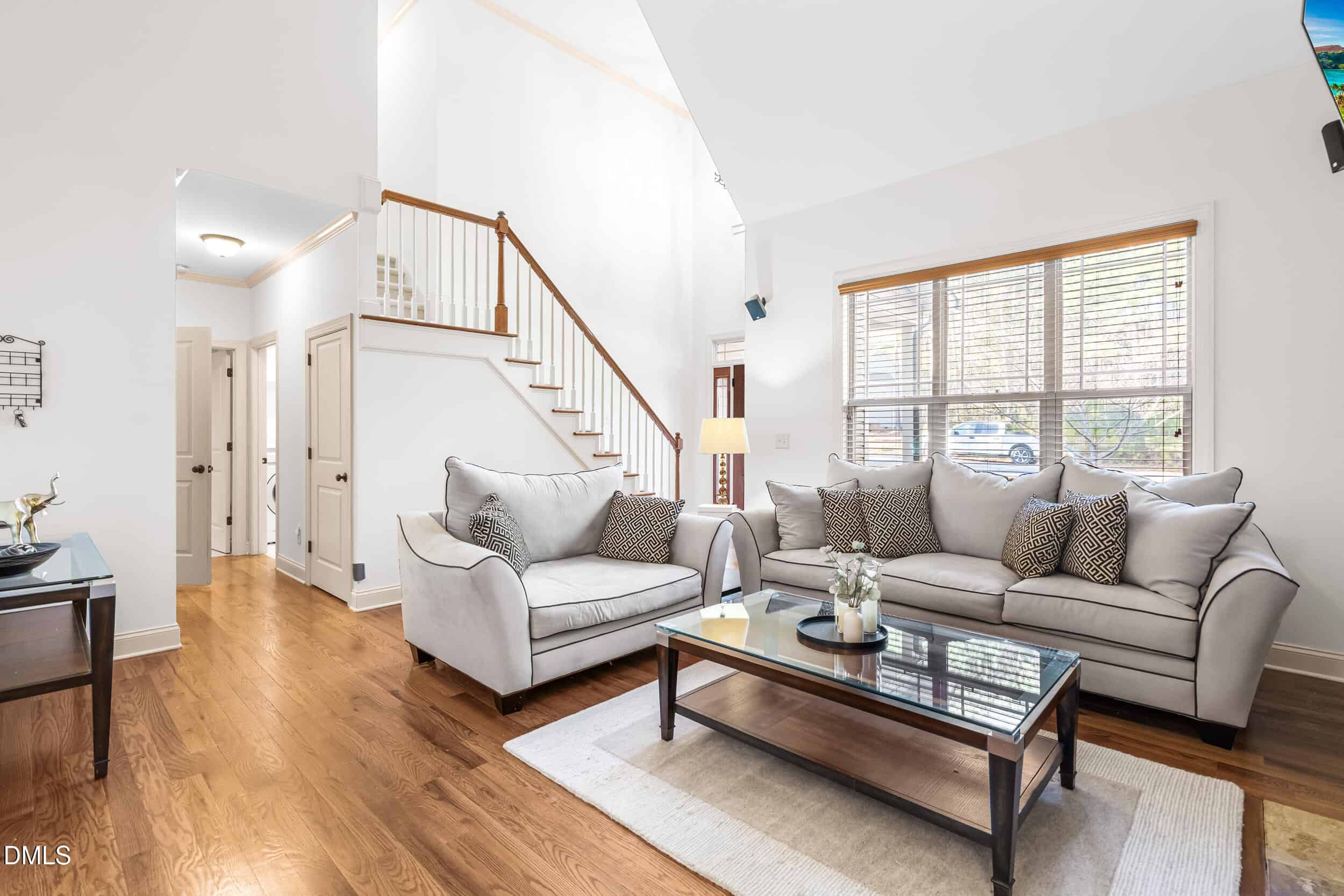 A former Parade of Homes winner, this stunning 4-bedroom, 4-bath transitional home sits on over an acre of fully fenced privacy in the sought-after Braeburn community—just minutes from Wake Forest. Built with no expense spared, this 2,209 square foot residence showcases exceptional craftsmanship throughout: extensive crown molding, tall baseboards, vaulted and tray ceilings, and a dramatic floor-to-ceiling stone gas fireplace anchoring the open-concept living area. Hardwood floors flow through the main level living spaces, kitchen, and foyer, while fresh neutral paint and brand-new carpet (2025) complete the move-in-ready presentation.
