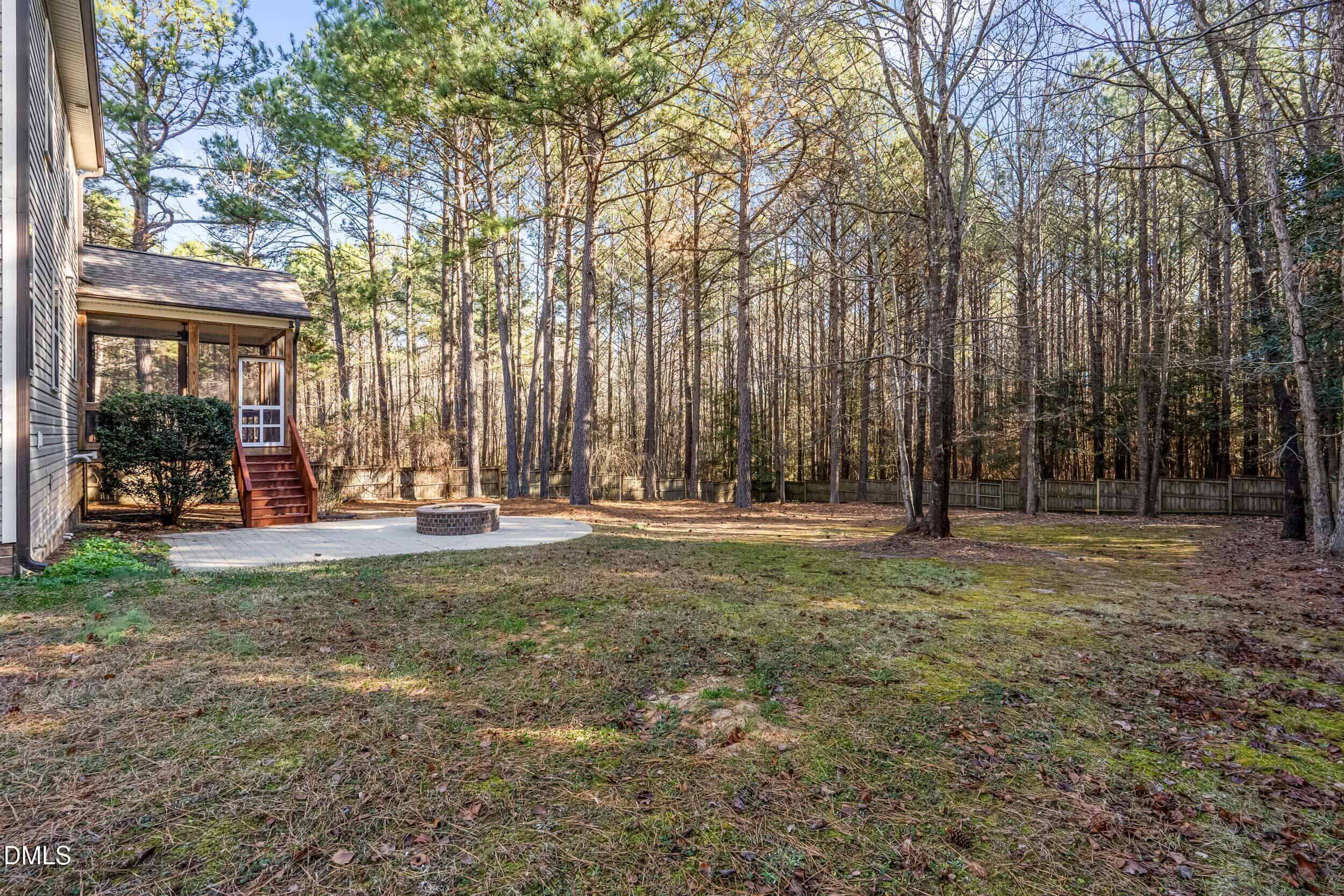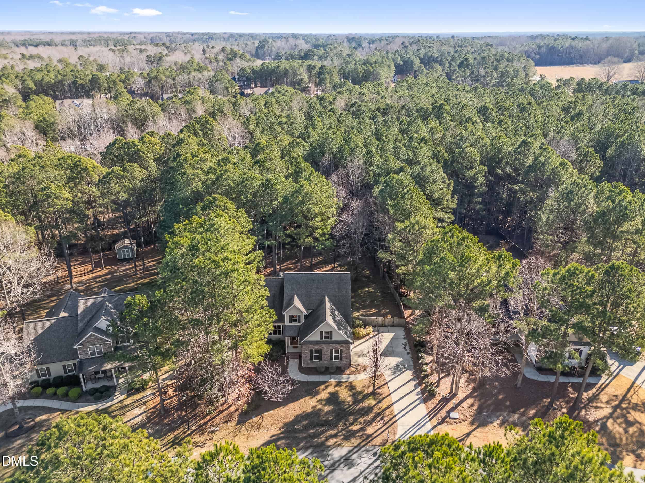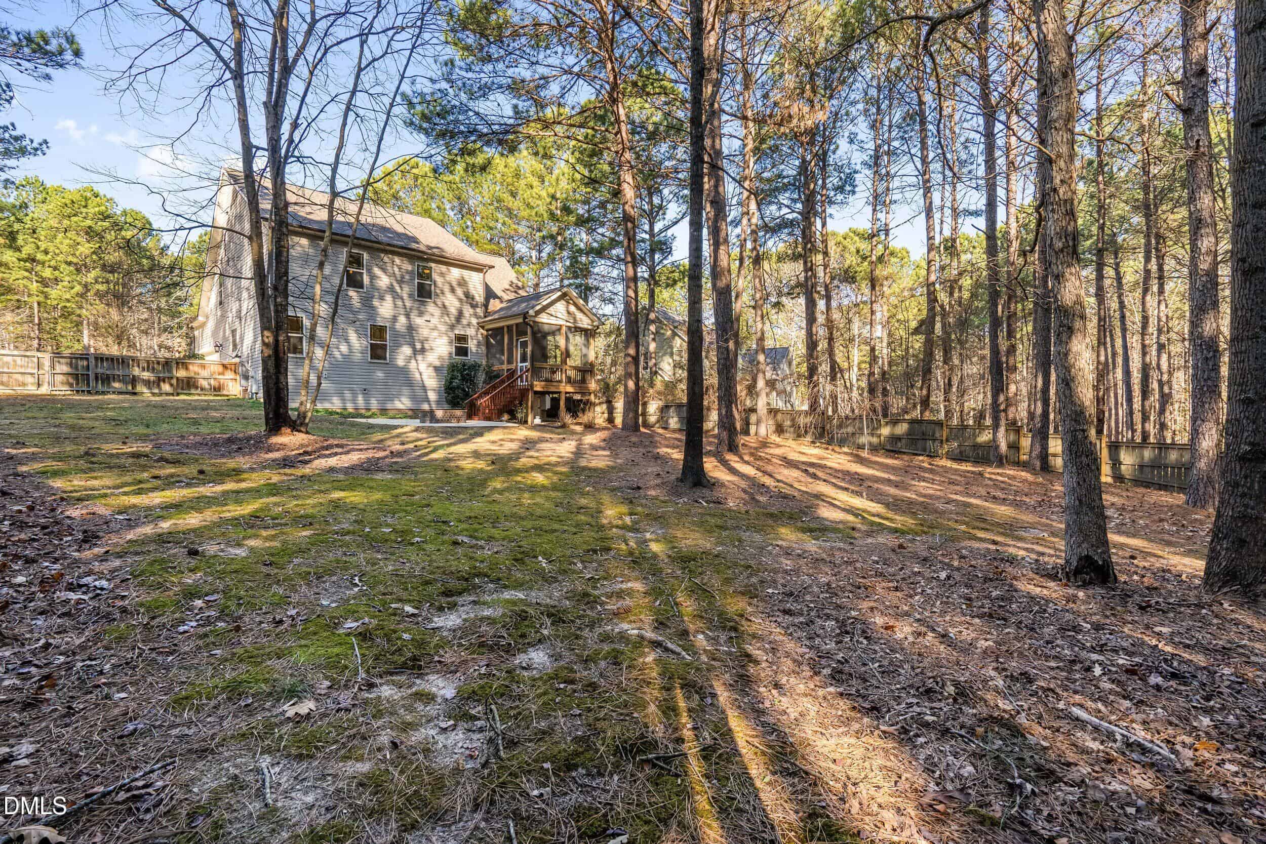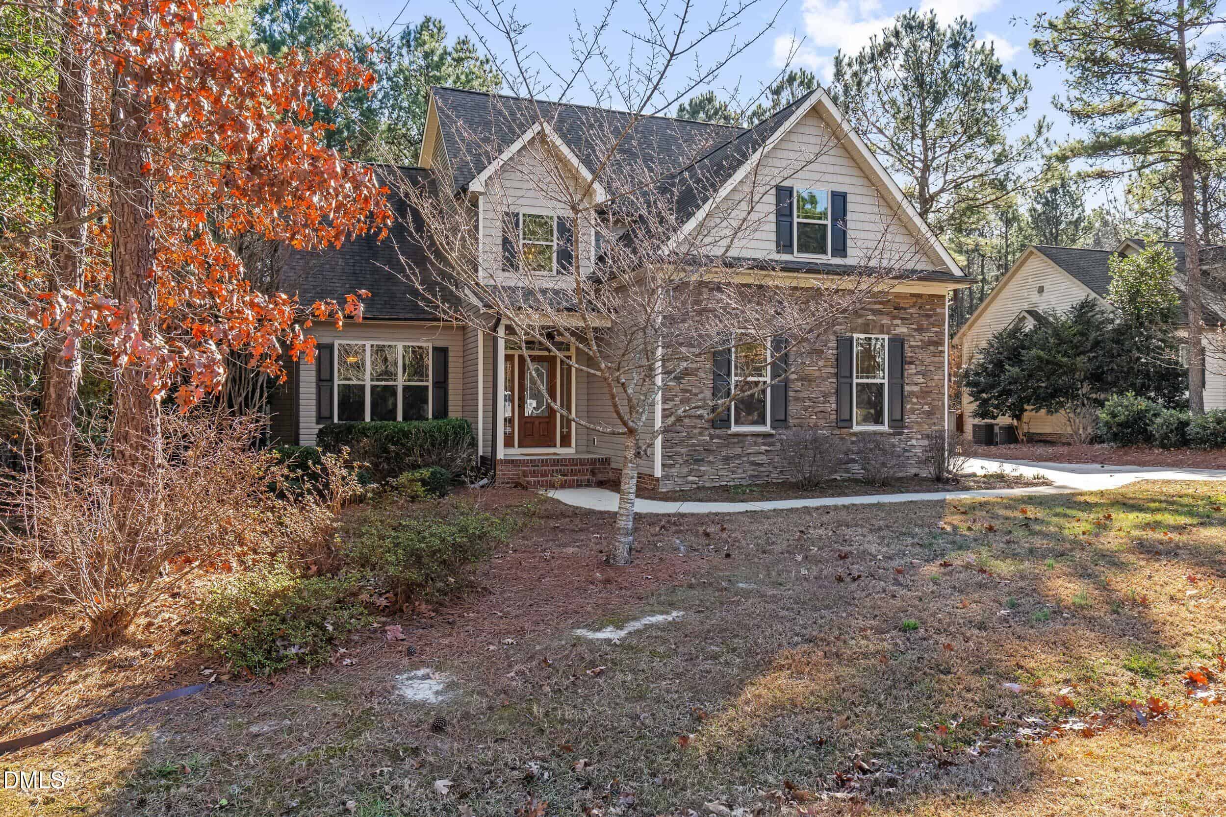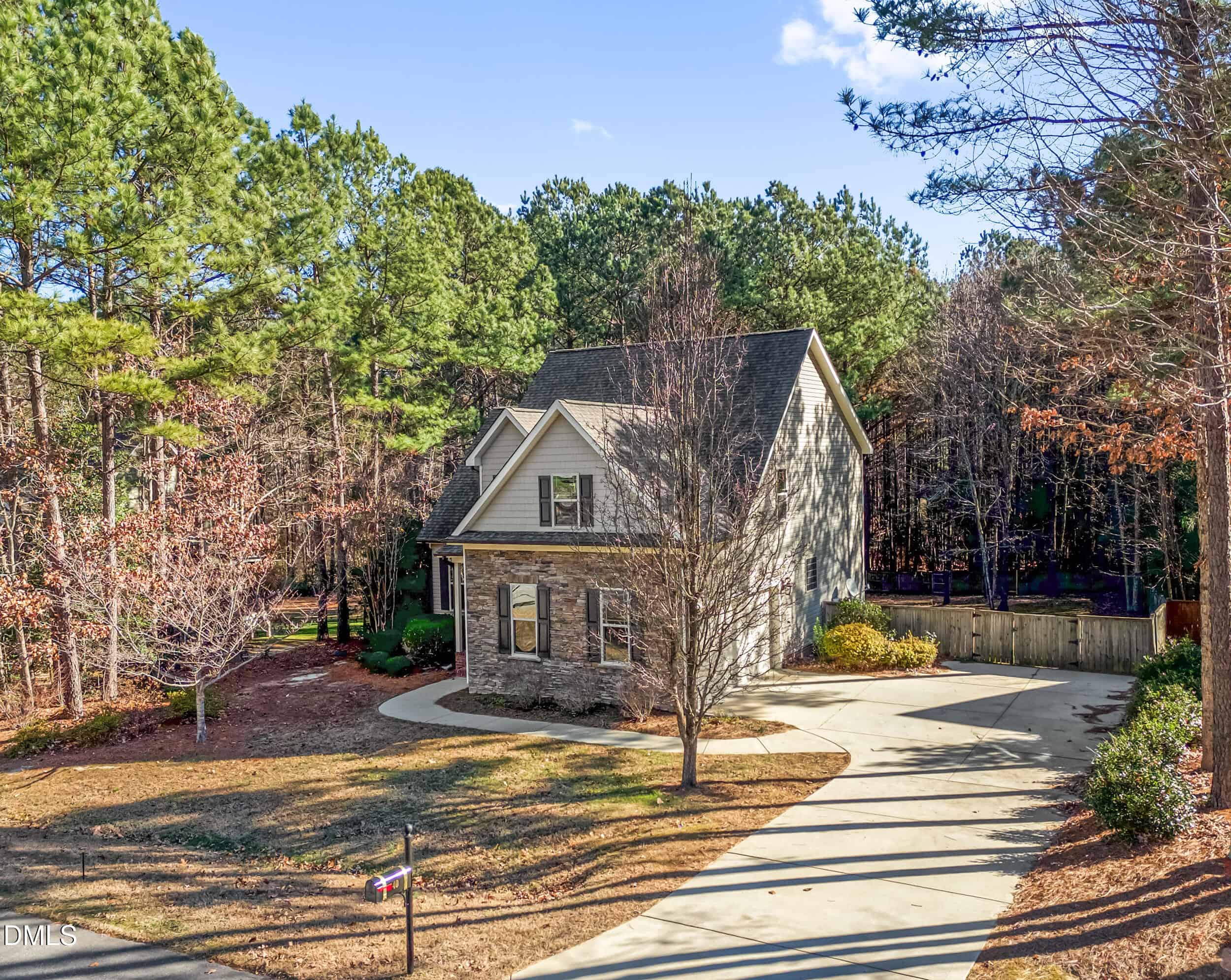 A former Parade of Homes winner, this stunning 4-bedroom, 4-bath transitional home sits on over an acre of fully fenced privacy in the sought-after Braeburn community—just minutes from Wake Forest. Built with no expense spared, this 2,209 square foot residence showcases exceptional craftsmanship throughout: extensive crown molding, tall baseboards, vaulted and tray ceilings, and a dramatic floor-to-ceiling stone gas fireplace anchoring the open-concept living area. Hardwood floors flow through the main level living spaces, kitchen, and foyer, while fresh neutral paint and brand-new carpet (2025) complete the move-in-ready presentation. The main-level primary suite is a true owner’s retreat, featuring a generous walk-in closet with custom wood shelving, soaking tub, dual vanity, and separate walk-in shower. The kitchen delivers both beauty and function with rich wood cabinetry accented by crown molding, granite countertops, stainless steel appliances, and a breakfast bar—perfect for casual dining. Upstairs, three spacious bedrooms include one with a walk-in closet and access to a Jack-and-Jill bath, plus an expansive bonus room ideal for a home office, media room, or playroom. Four additional storage closets—one up, two down—keep everything organized. Outdoor living shines on the screened porch overlooking the private backyard, stone patio, and fire pit—an entertainer’s dream. The property backs up to a natural wood line, providing an added layer of privacy and serene tranquility that’s hard to find.