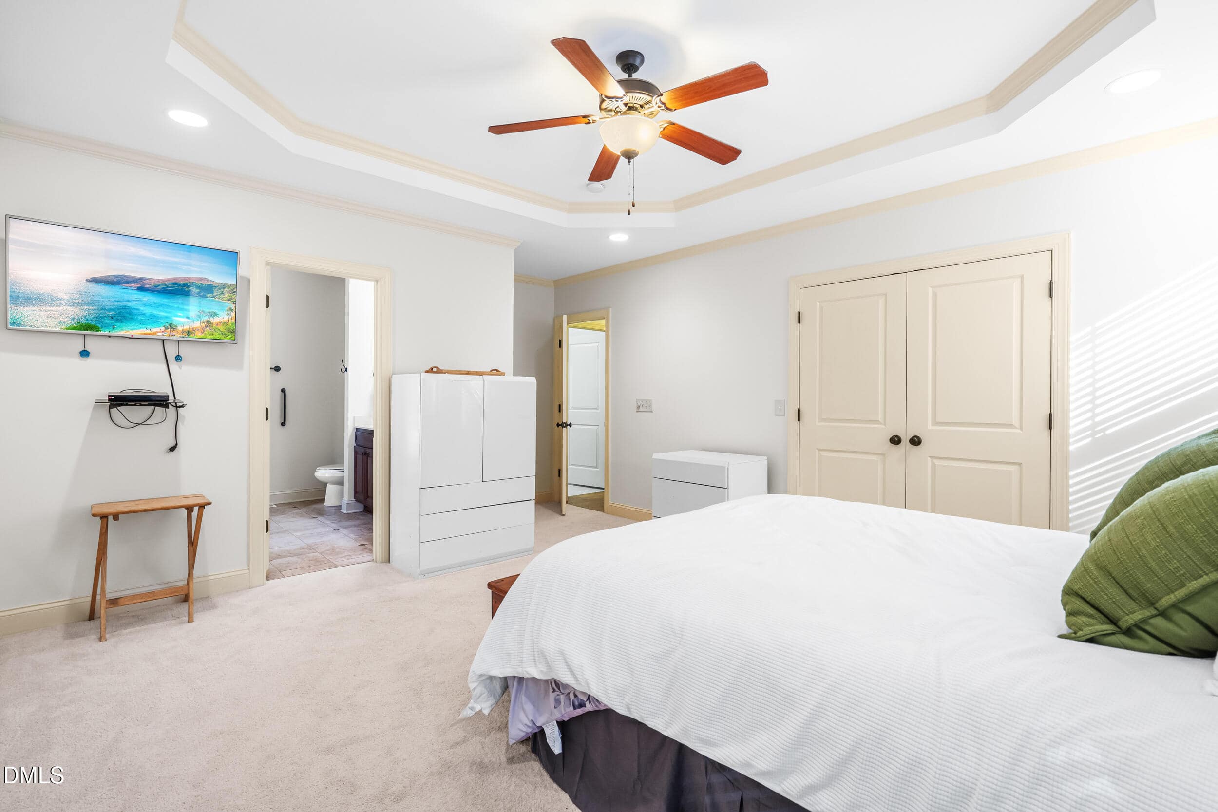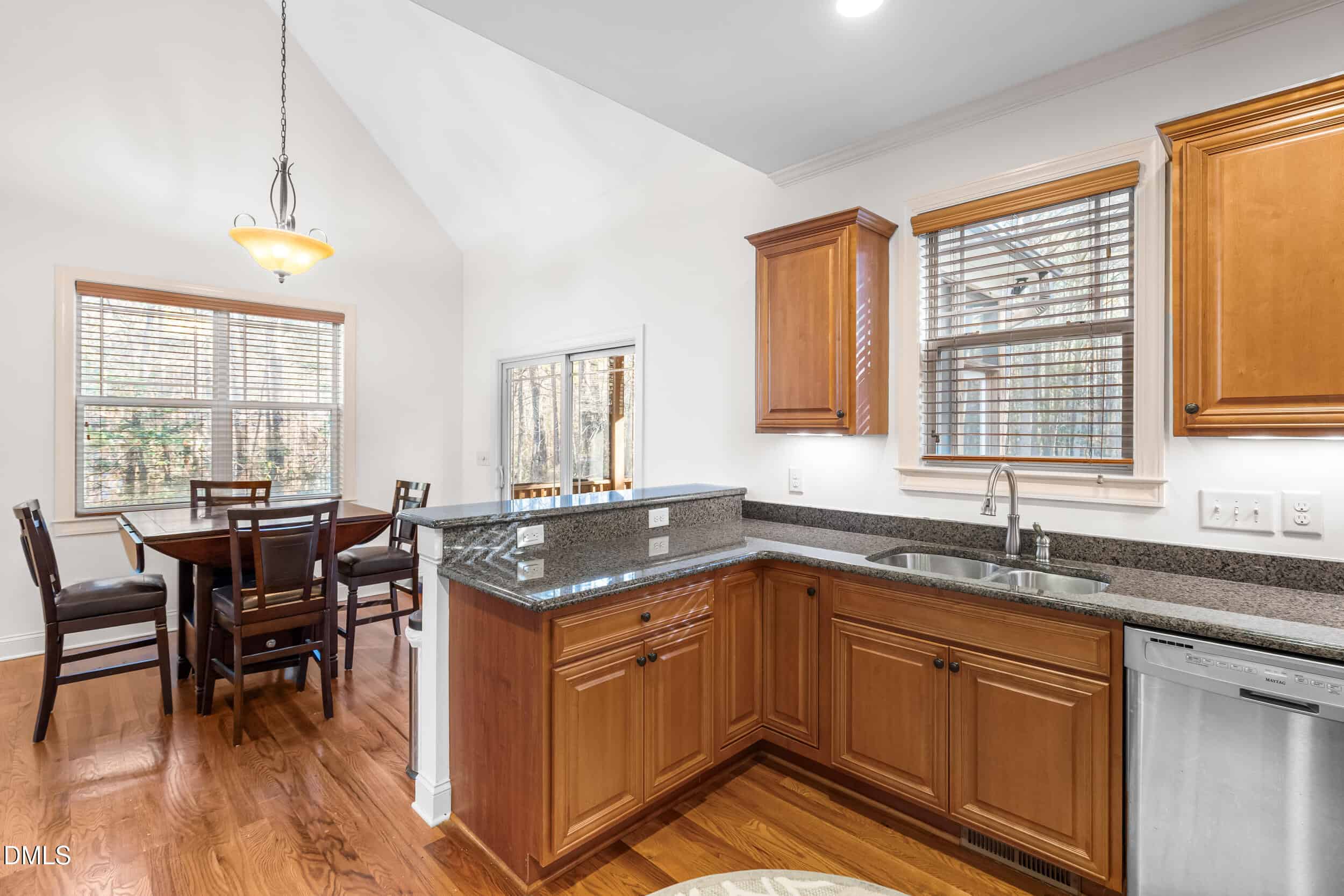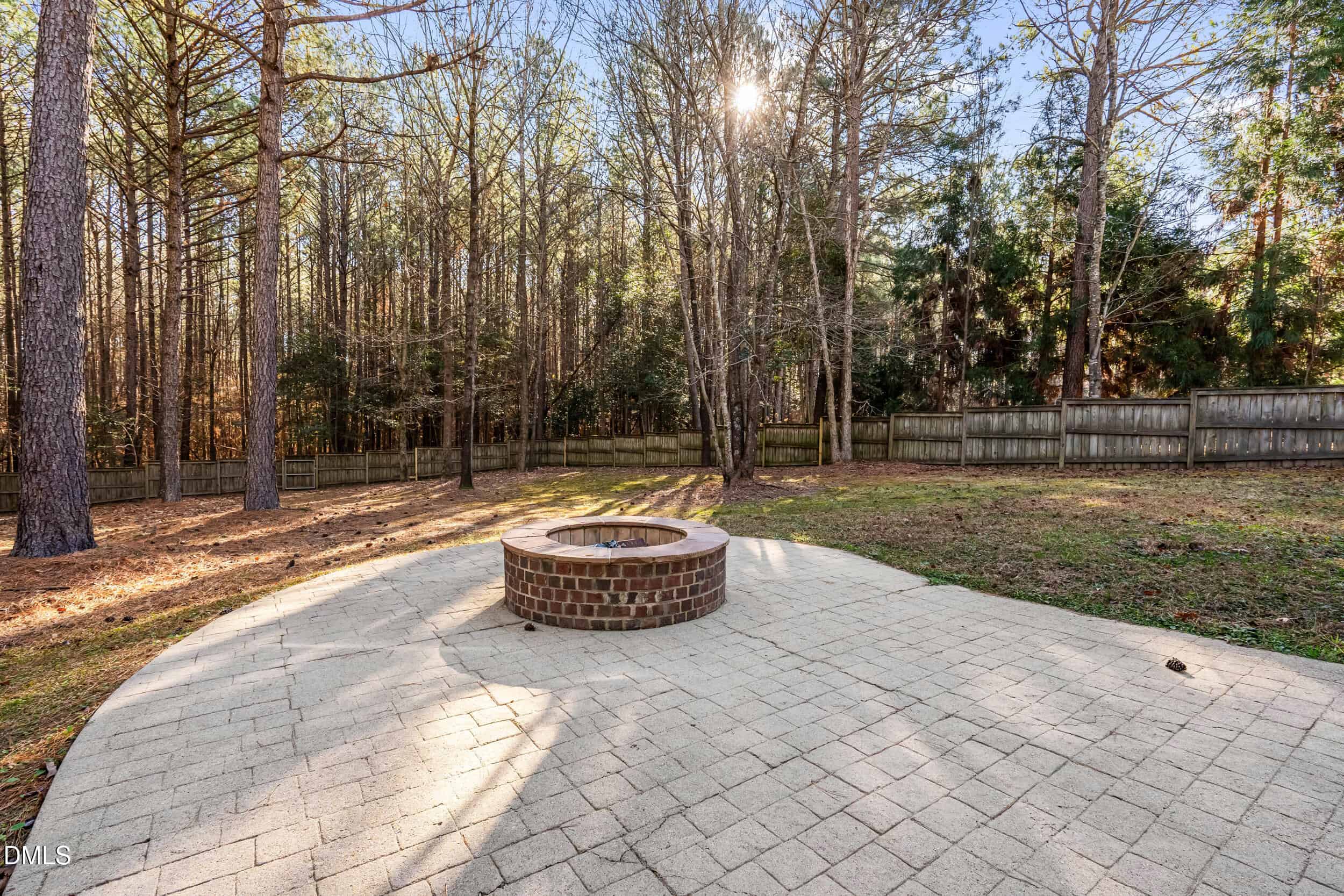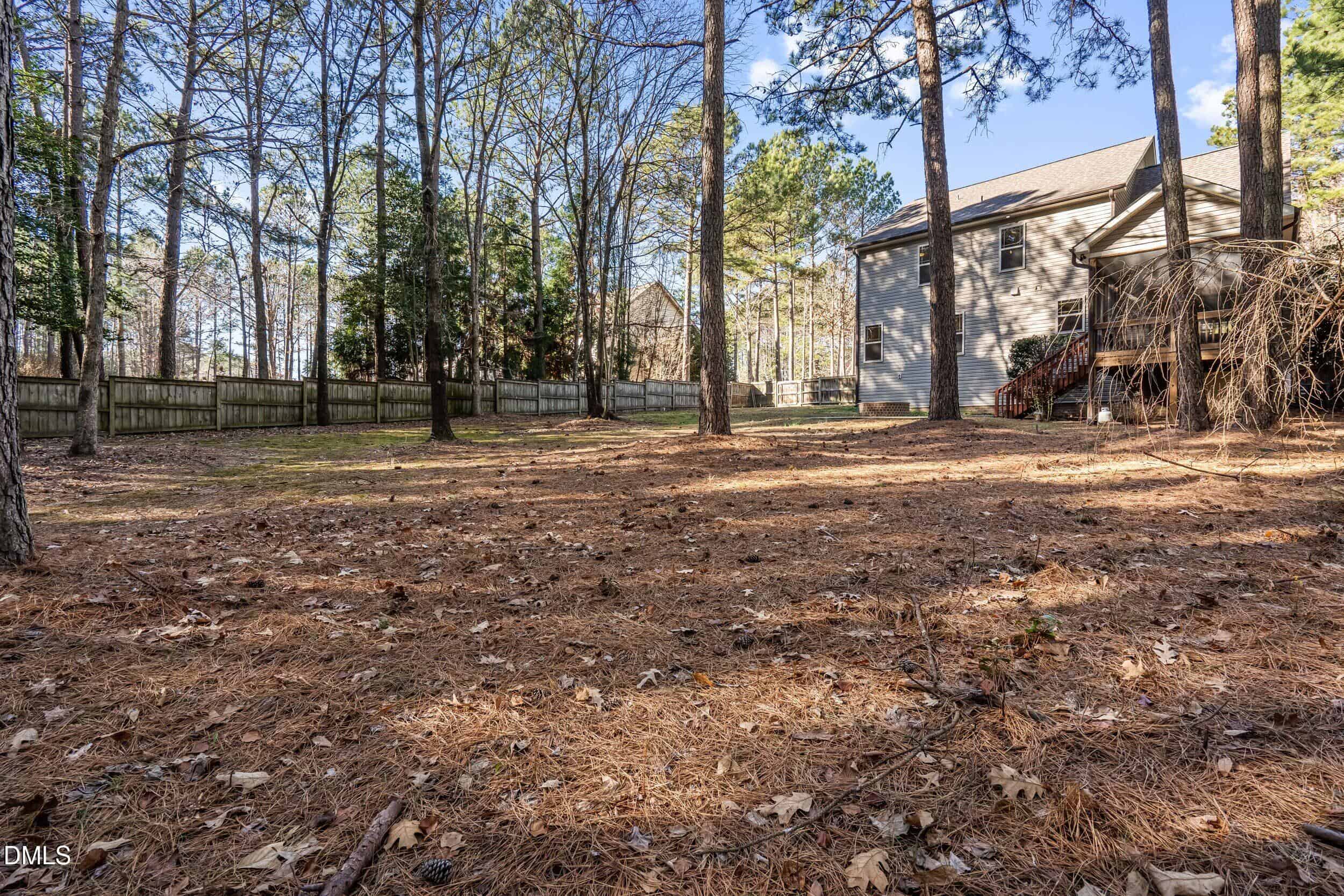 A former Parade of Homes winner, this stunning 4-bedroom, 4-bath transitional home sits on over an acre of fully fenced privacy in the sought-after Braeburn community—just minutes from Wake Forest. Built with no expense spared, this 2,209 square foot residence showcases exceptional craftsmanship throughout: extensive crown molding, tall baseboards, vaulted and tray ceilings, and a dramatic floor-to-ceiling stone gas fireplace anchoring the open-concept living area. Hardwood floors flow through the main level living spaces, kitchen, and foyer, while fresh neutral paint and brand-new carpet (2025) complete the move-in-ready presentation. The main-level primary suite is a true owner’s retreat, featuring a generous walk-in closet with custom wood shelving, soaking tub, dual vanity, and separate walk-in shower. The kitchen delivers both beauty and function with rich wood cabinetry accented by crown molding, granite countertops, stainless steel appliances, and a breakfast bar—perfect for casual dining. Upstairs, three spacious bedrooms include one with a walk-in closet and access to a Jack-and-Jill bath, plus an expansive bonus room ideal for a home office, media room, or playroom. Four additional storage closets—one up, two down—keep everything organized. Outdoor living shines on the screened porch overlooking the private backyard, stone patio, and fire pit—an entertainer’s dream. The property backs up to a natural wood line, providing an added layer of privacy and serene tranquility that’s hard to find.