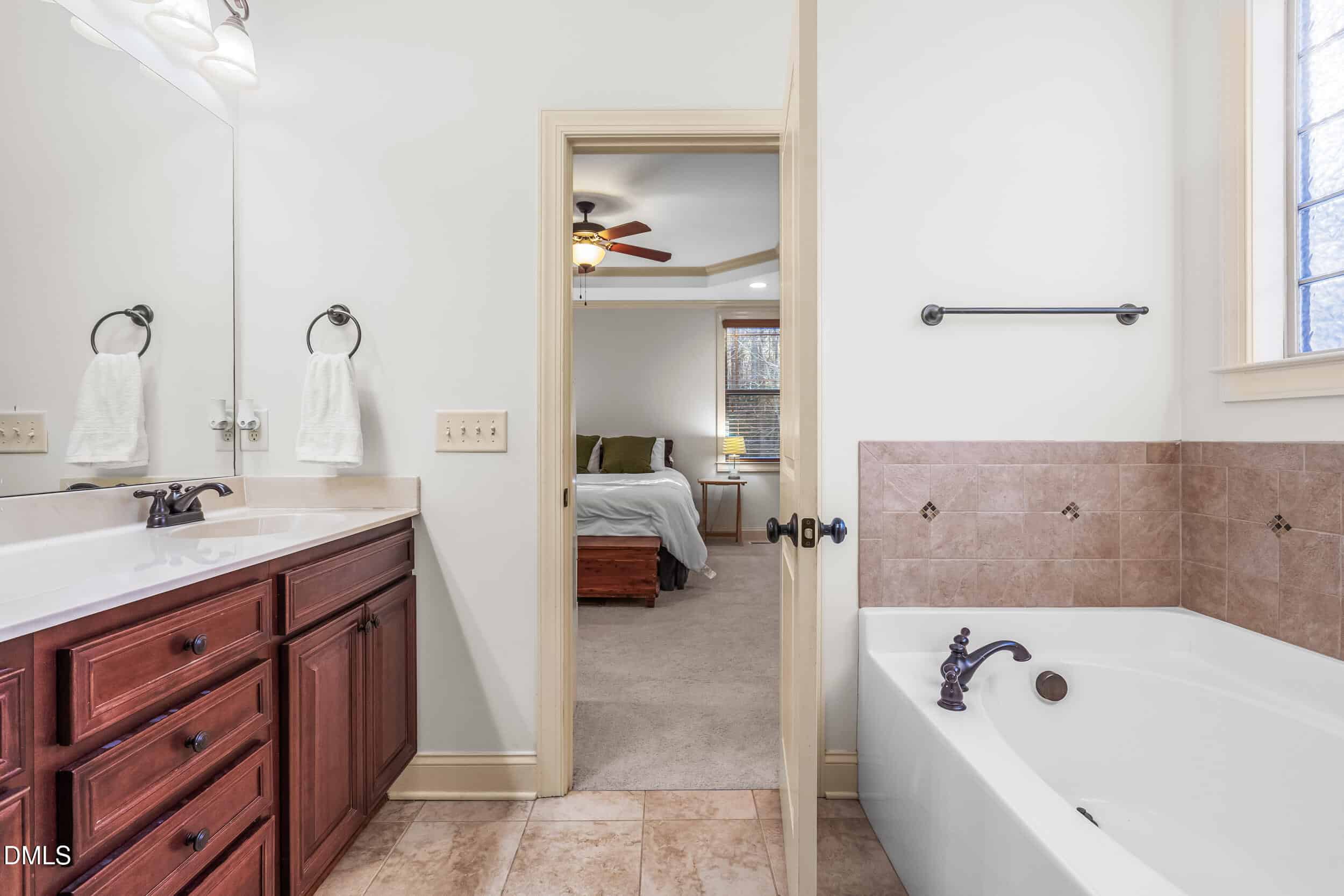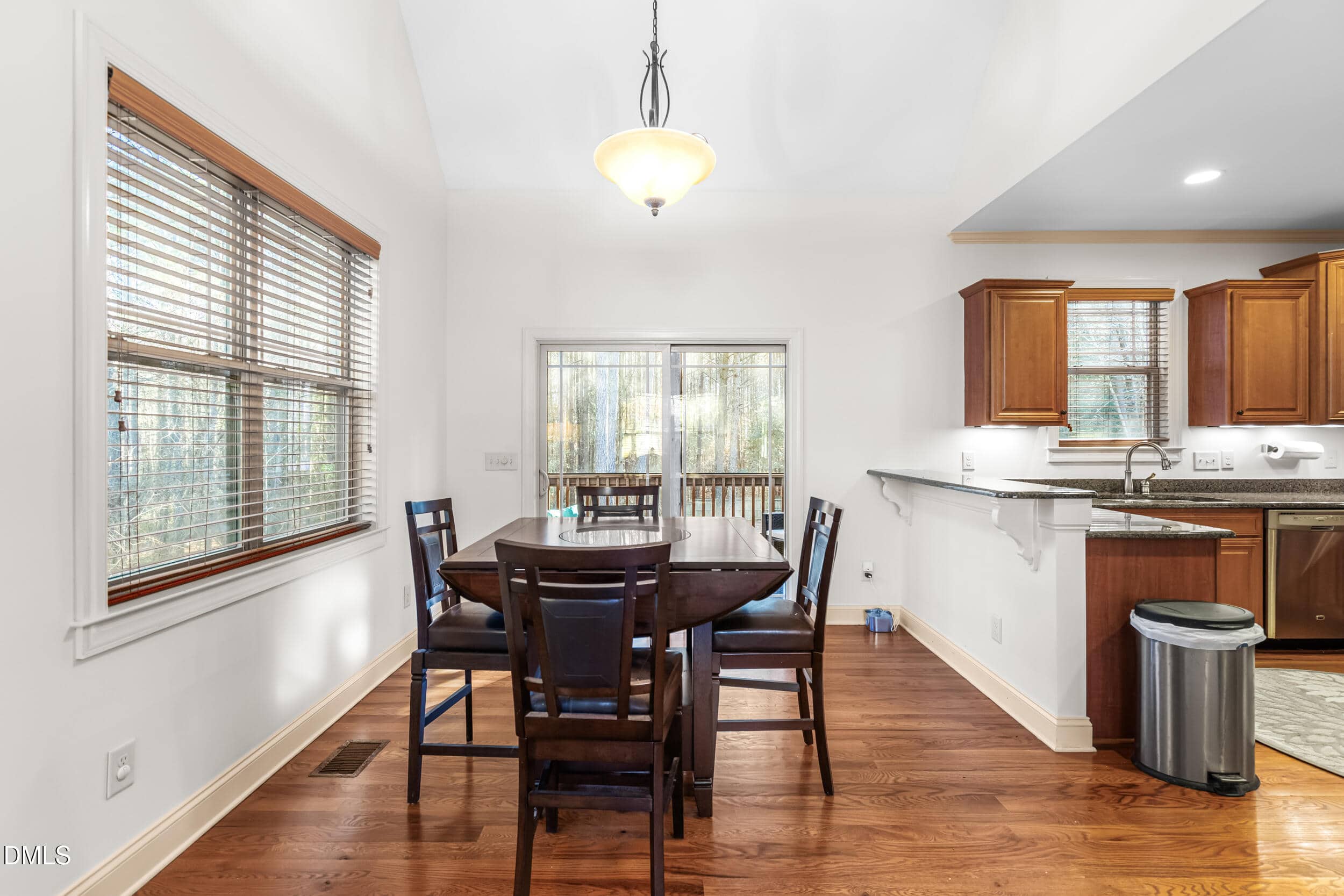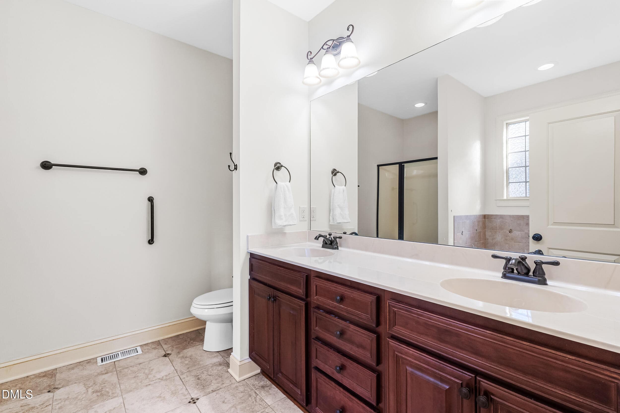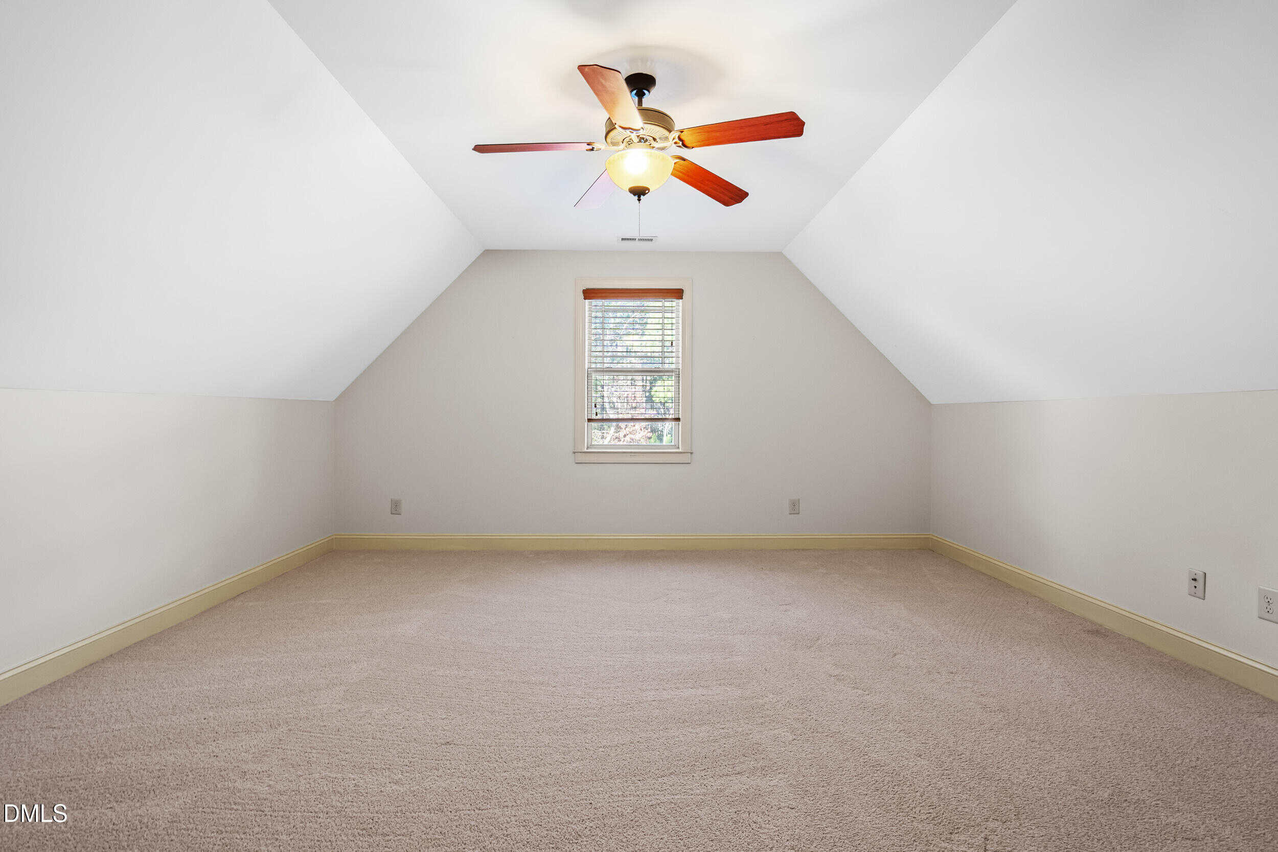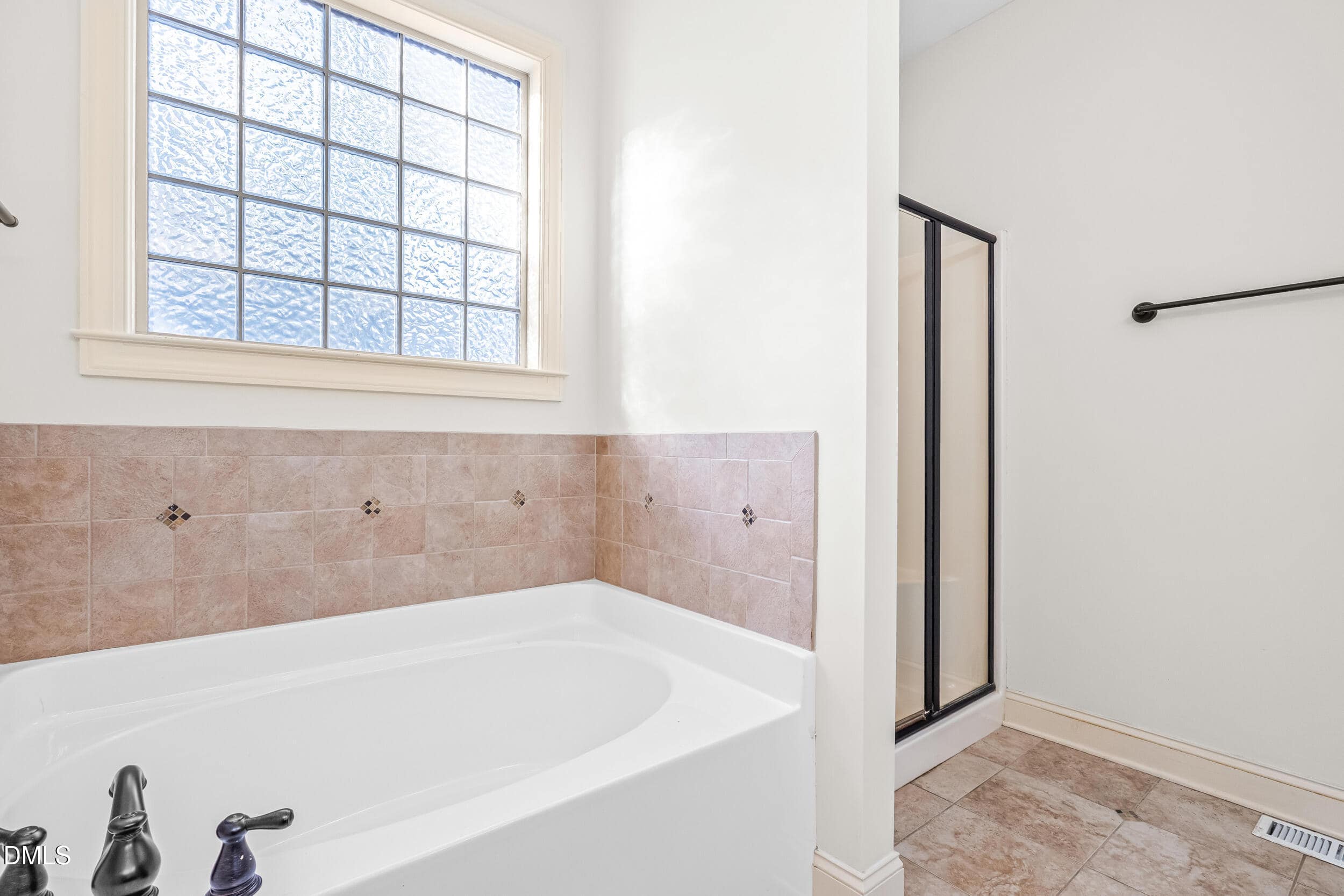 A former Parade of Homes winner, this stunning 4-bedroom, 4-bath transitional home sits on over an acre of fully fenced privacy in the sought-after Braeburn community—just minutes from Wake Forest. Built with no expense spared, this 2,209 square foot residence showcases exceptional craftsmanship throughout: extensive crown molding, tall baseboards, vaulted and tray ceilings, and a dramatic floor-to-ceiling stone gas fireplace anchoring the open-concept living area. Hardwood floors flow through the main level living spaces, kitchen, and foyer, while fresh neutral paint and brand-new carpet (2025) complete the move-in-ready presentation. The main-level primary suite is a true owner’s retreat, featuring a generous walk-in closet with custom wood shelving, soaking tub, dual vanity, and separate walk-in shower. The kitchen delivers both beauty and function with rich wood cabinetry accented by crown molding, granite countertops, stainless steel appliances, and a breakfast bar—perfect for casual dining. Upstairs, three spacious bedrooms include one with a walk-in closet and access to a Jack-and-Jill bath, plus an expansive bonus room ideal for a home office, media room, or playroom. Four additional storage closets—one up, two down—keep everything organized. Outdoor living shines on the screened porch overlooking the private backyard, stone patio, and fire pit—an entertainer’s dream. The property backs up to a natural wood line, providing an added layer of privacy and serene tranquility that’s hard to find.