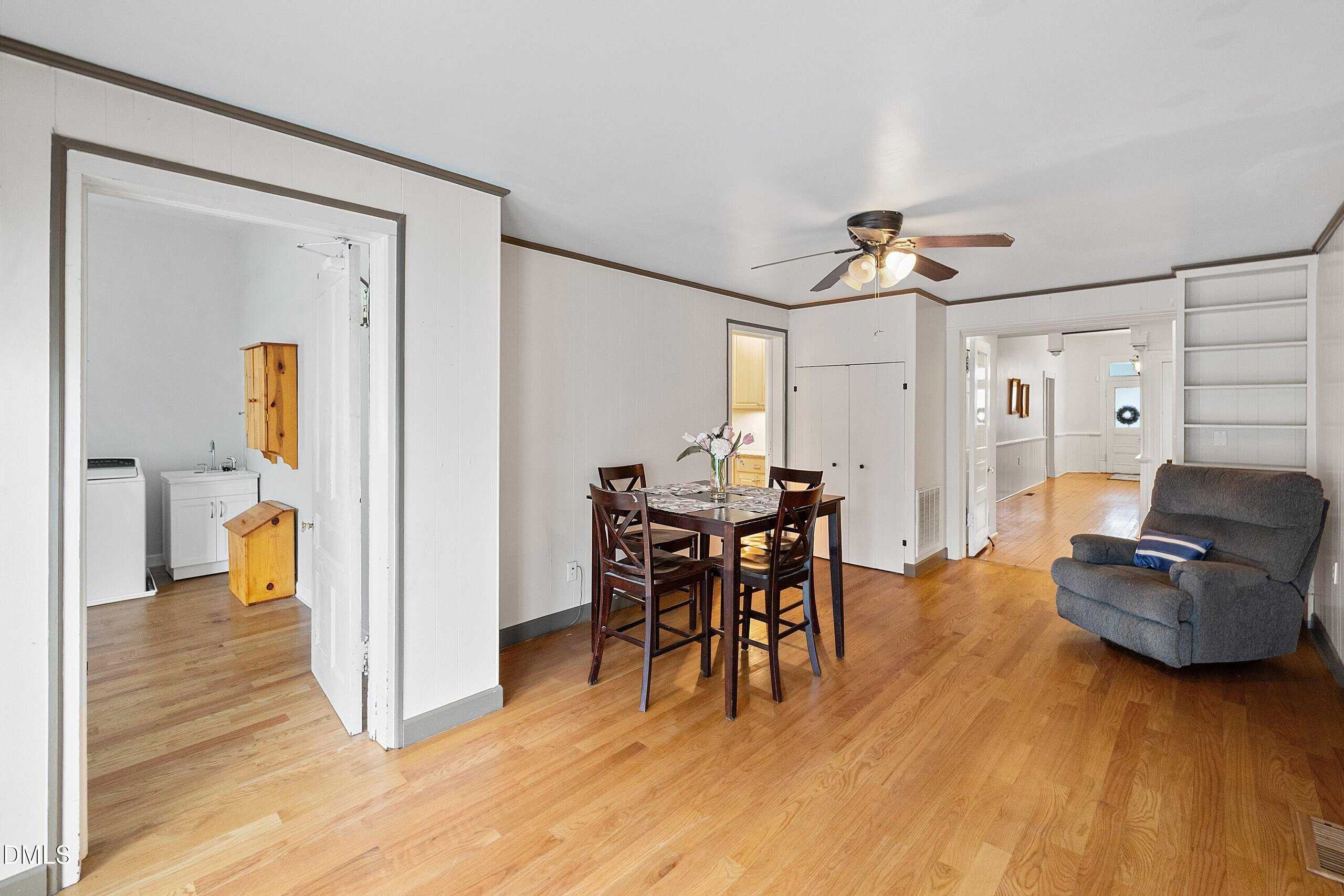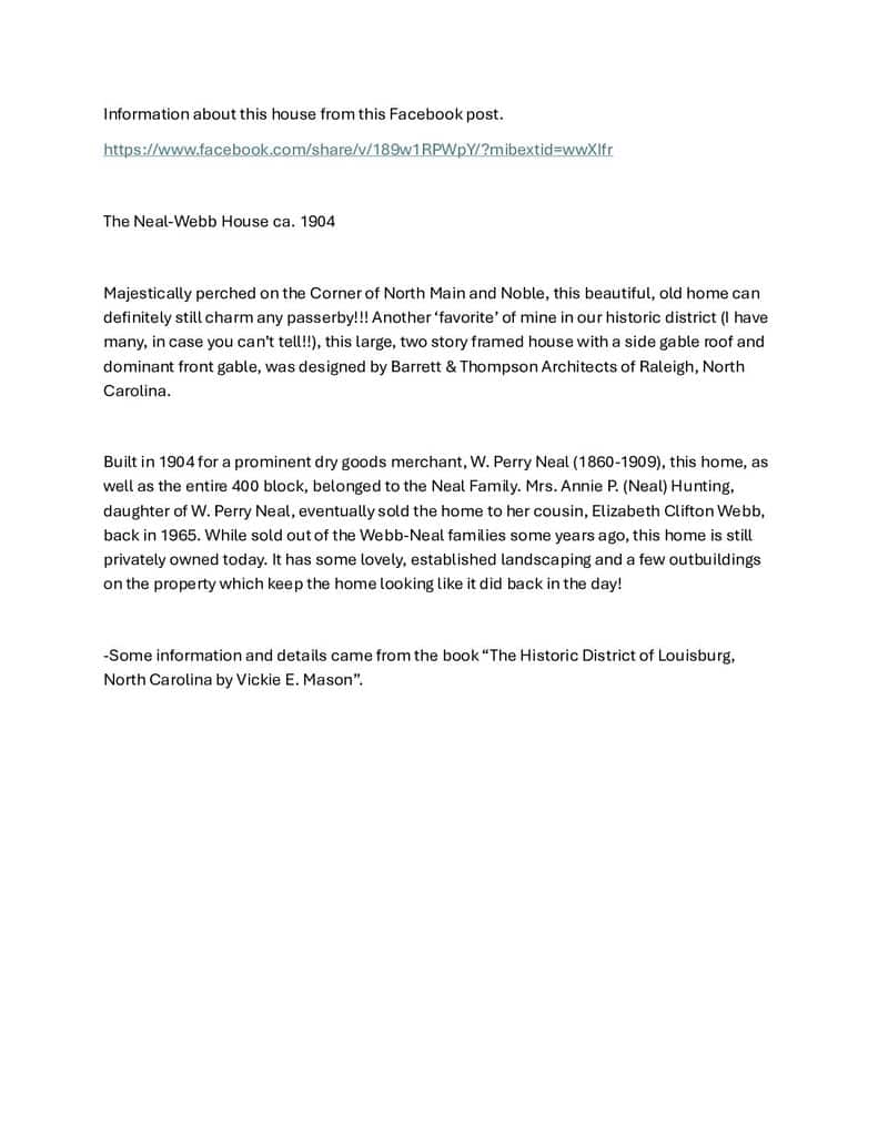 HISTORIC DISTRICT. NEAL-WEBB Historic N Main ST in Louisburg, this home is so spacious, Captivating, Wide entry foyer, Beautiful Front Porch. Central heat and air, Natural gas heat Elec for air, dual systems. Kitchen has been updated to all of the modern convinces’, tons of beautiful cabinets, breakfast bar, Granit counters, Gas range, stainless steel appliances, refrigerator remains, wood floors. enormous laundry room, washer and dryer remain; There’s is room to add Freezer cupboards, game table. THIS home has it all, Formal Living Room, Formal Dining, Dining room would accommodate extra-large banquet table, buffet, China hutch, also with the original hardwood floors, Step back in time and be a part of this small-town living. walk to churches, walk to downtown restaurant’s, you will fall in love with the tree lined streets, wonderful lifetime residents live in the neighborhood. Live the good life in this wonderful small town. Beautiful tree lined street. SEALED CRAWL SPACE, INFORMATION ON THIS HISTORIC HOME IS UNDER DOCUMENTS IN MLS Claw foot tub is original CLAY tub, not cast iron. You will love it. Worth $1000.00 plus. Possible to be an Airbnb, Make your dream come true, This home would be perfect Use your imagination, and view this home. Just add gas logs to fireplaces for a cozy feel throughout.