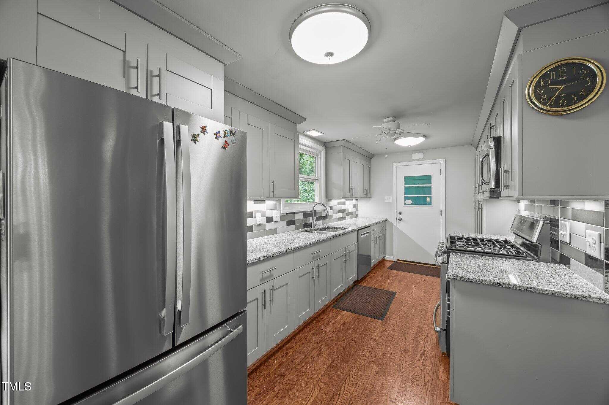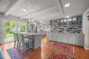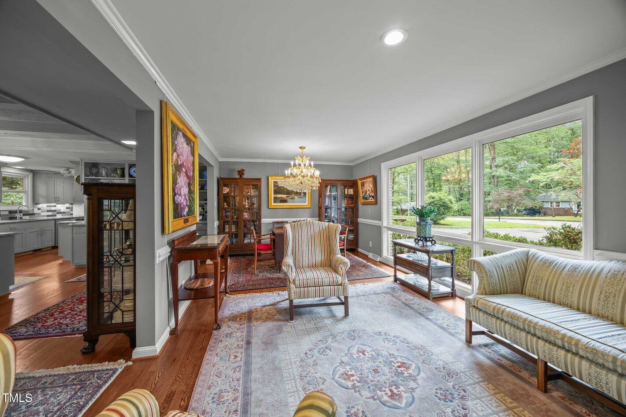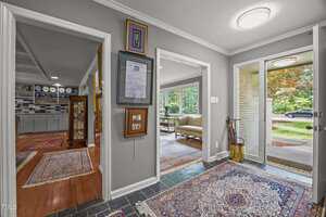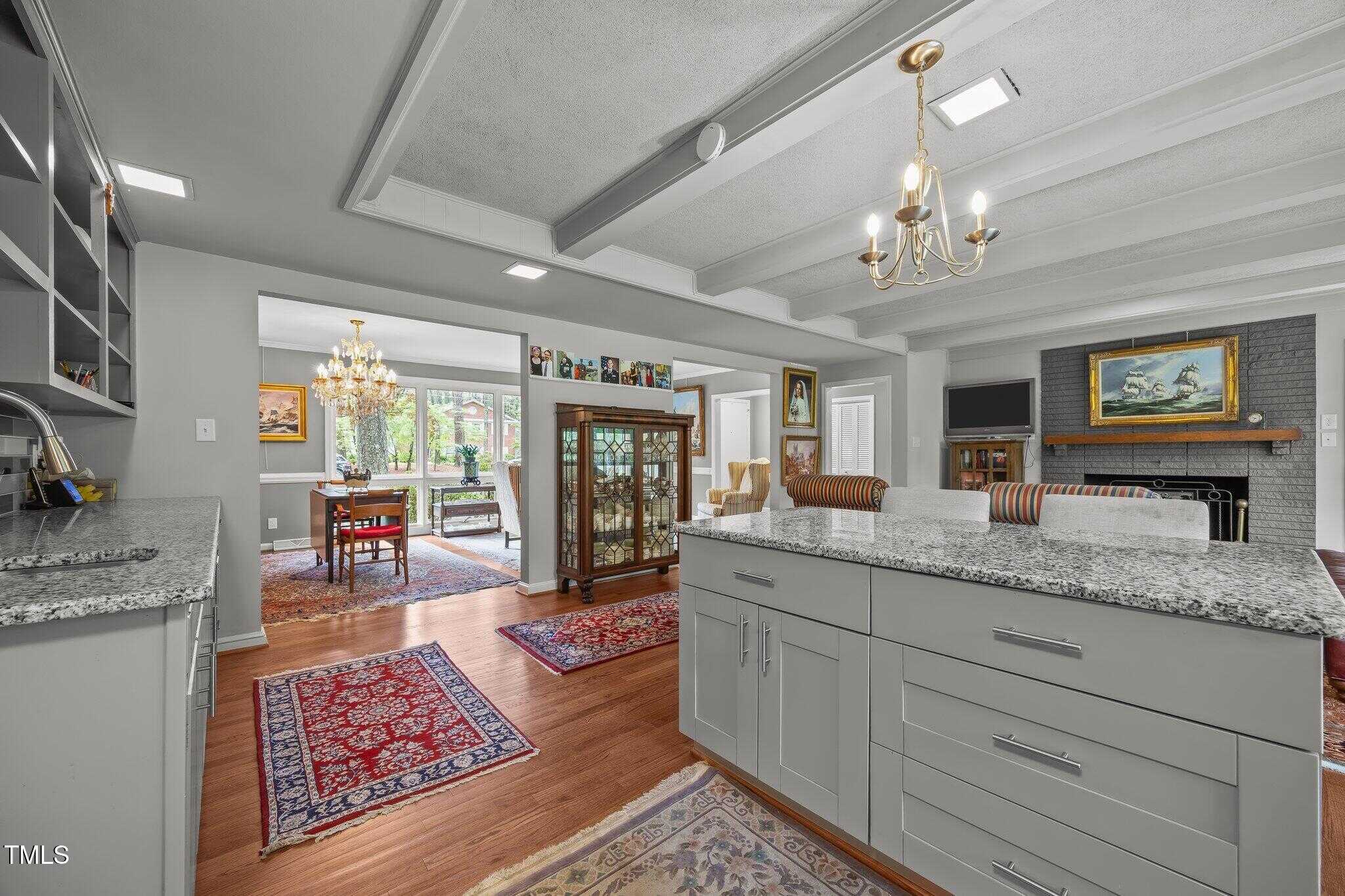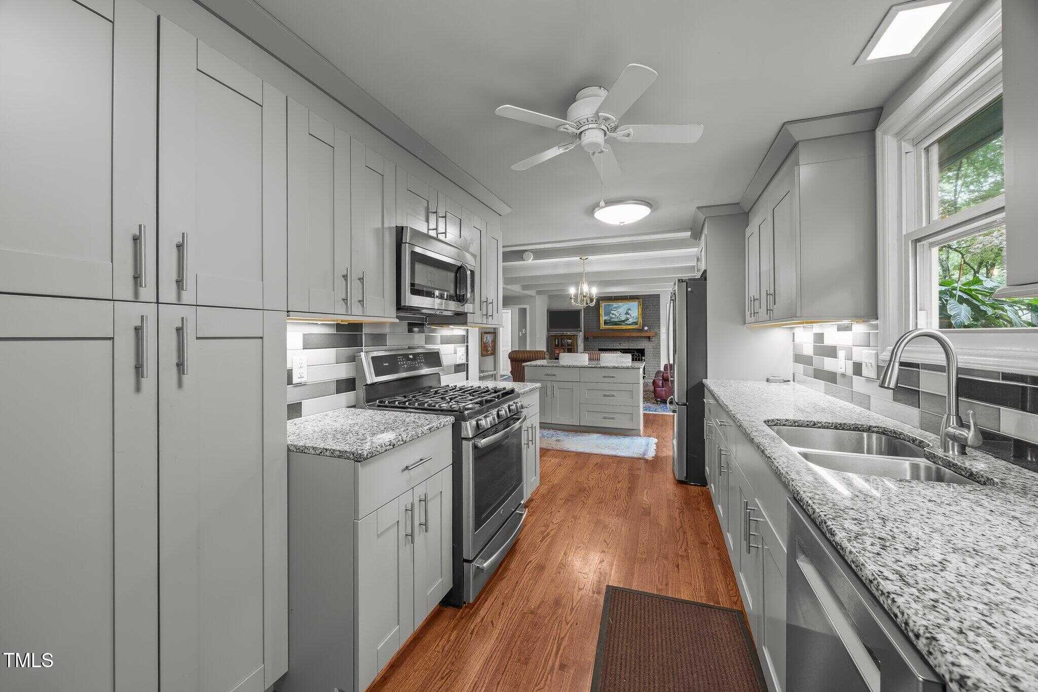 Opens to Gallery Kitchen w/ Granite Counters, 2024 Bosch DW, ’23 Refrigerator + Dual-Fuel Gas/Electric 5 Burner Range. Walls taken out & added three 10′ openings allowing Foyer, LR, DR, GR & Kitchen areas to flow together.