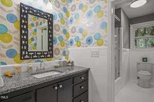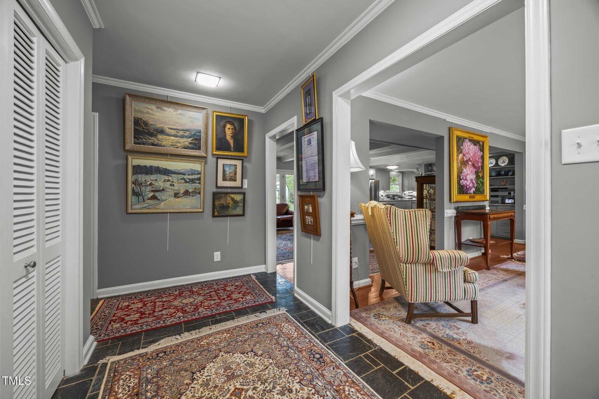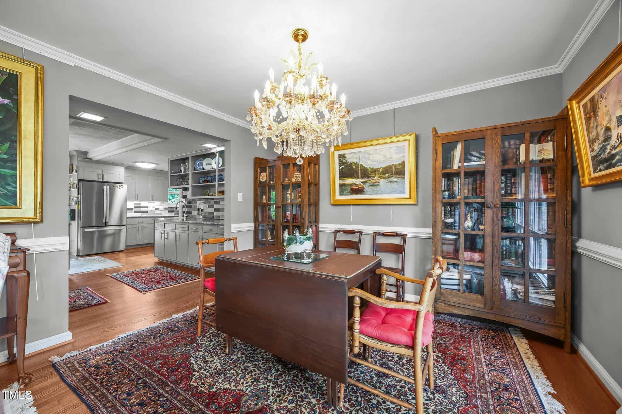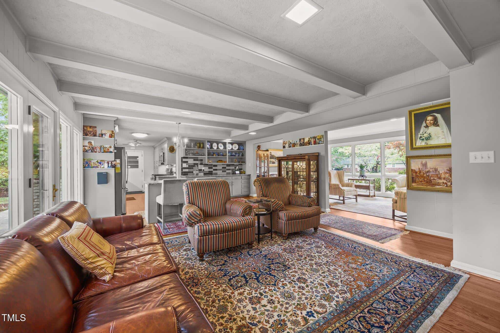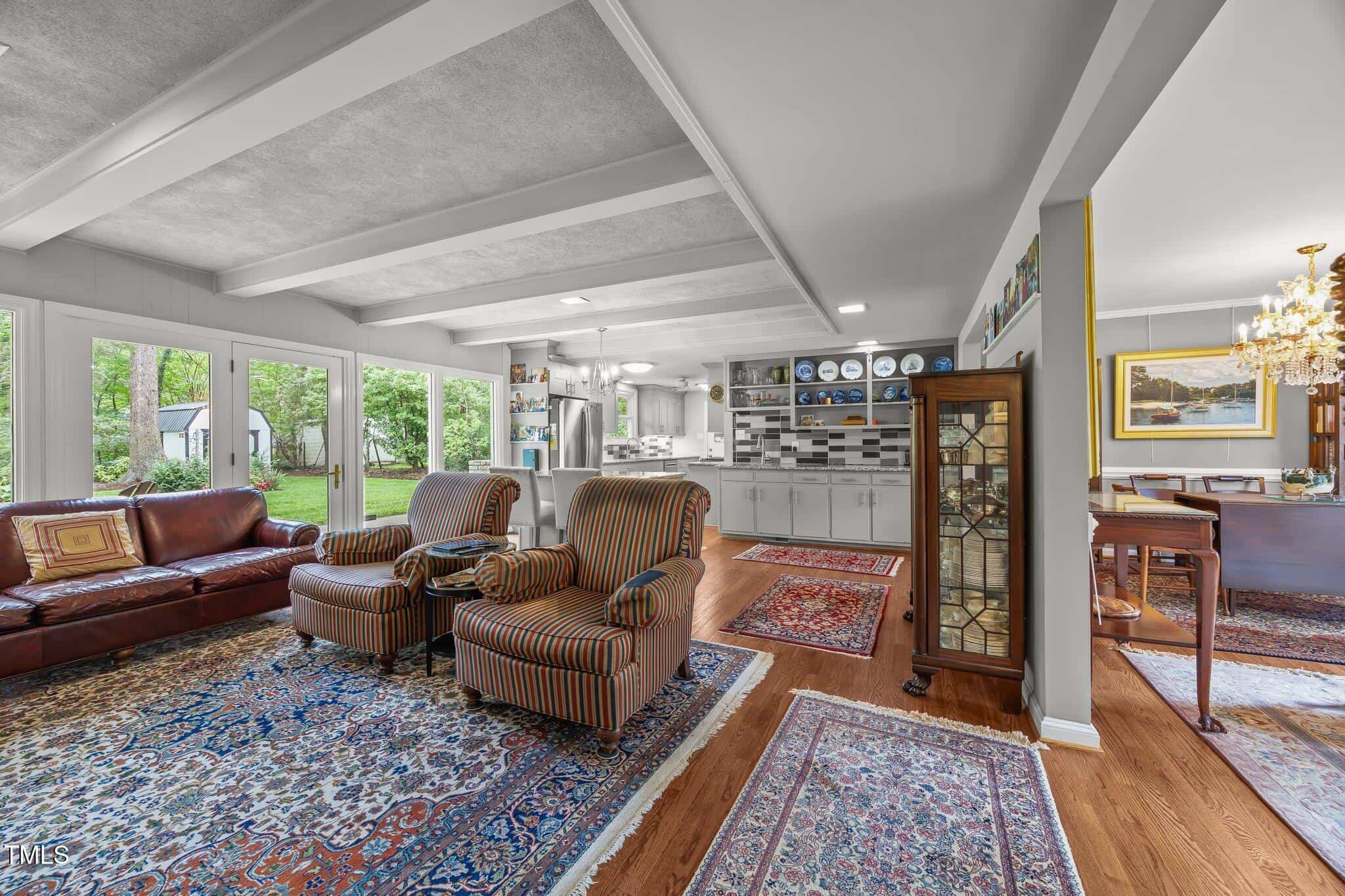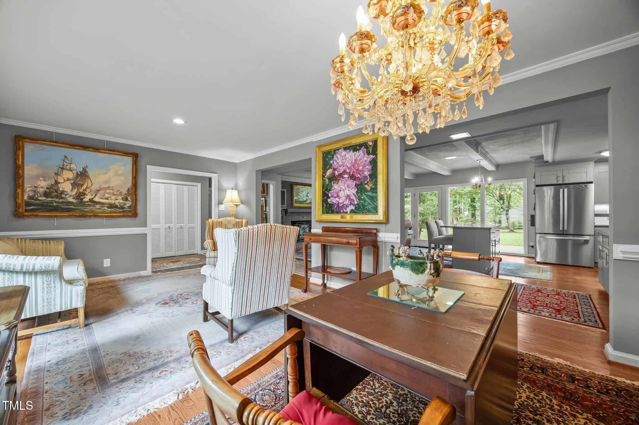Opens to Gallery Kitchen w/ Granite Counters, 2024 Bosch DW, ’23 Refrigerator + Dual-Fuel Gas/Electric 5 Burner Range. Walls taken out & added three 10′ openings allowing Foyer, LR, DR, GR & Kitchen areas to flow together.