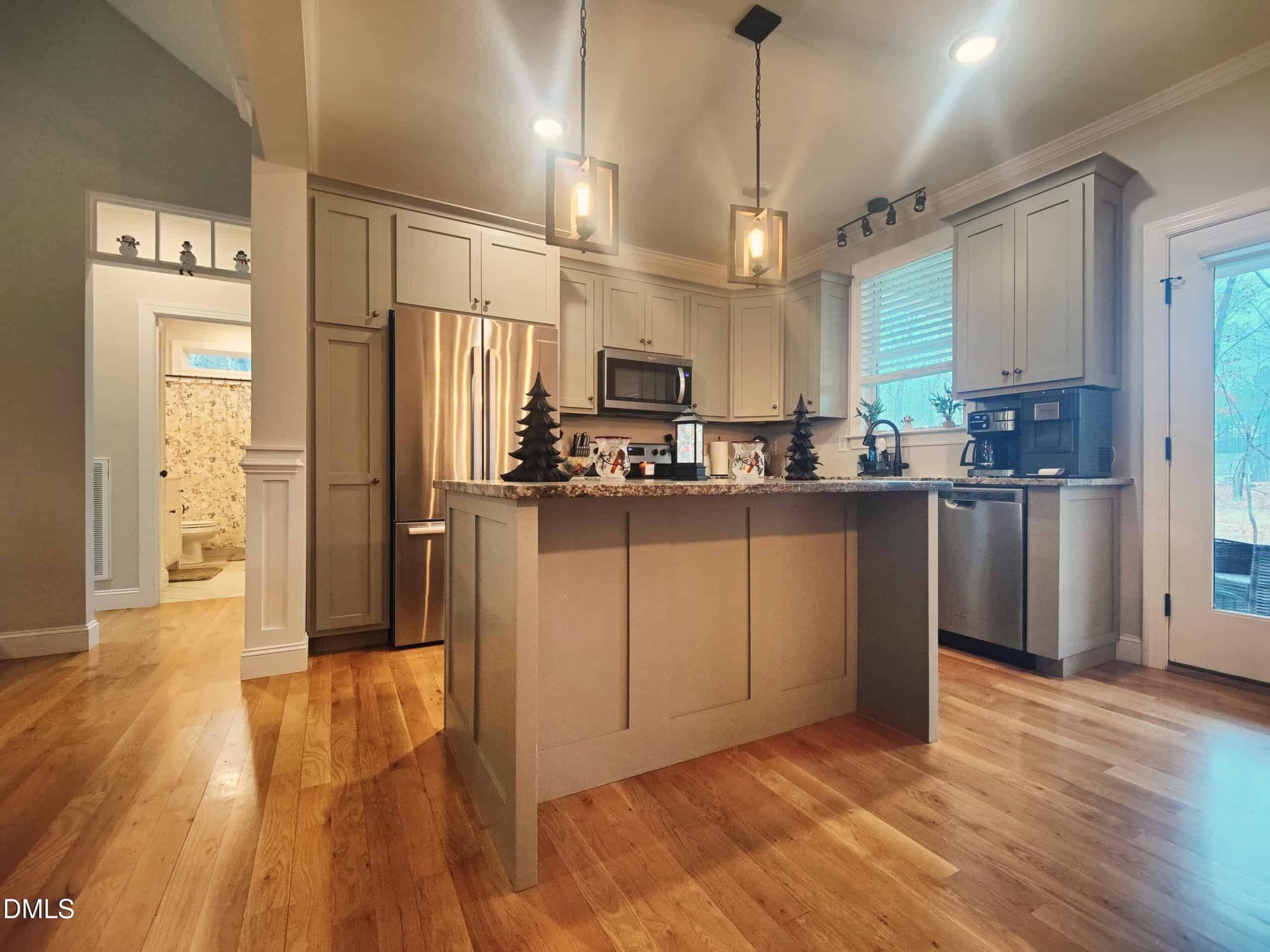The Kitchen boasts striking Granite Countertops, Custom Cabinets, and Stainless-Steel Appliances, all illuminated by Designer Lighting, as well as a Center Island with Seating that adjoins the Dining Area. In the center of both is a door to the Covered Rear Porch to continue the Living Area Outside.