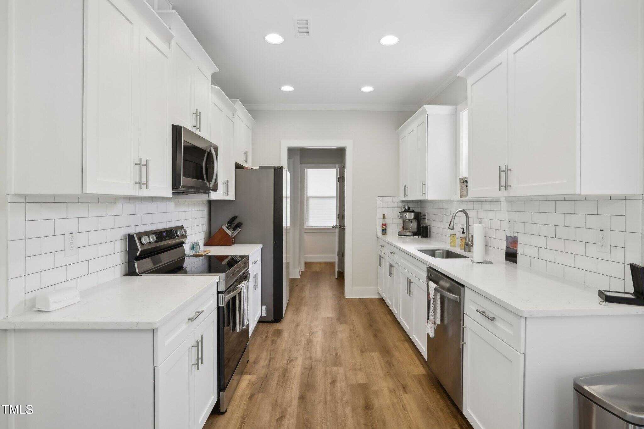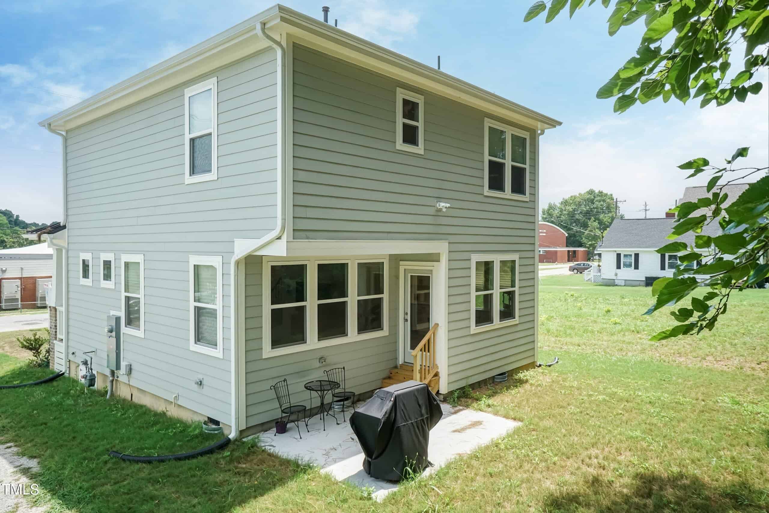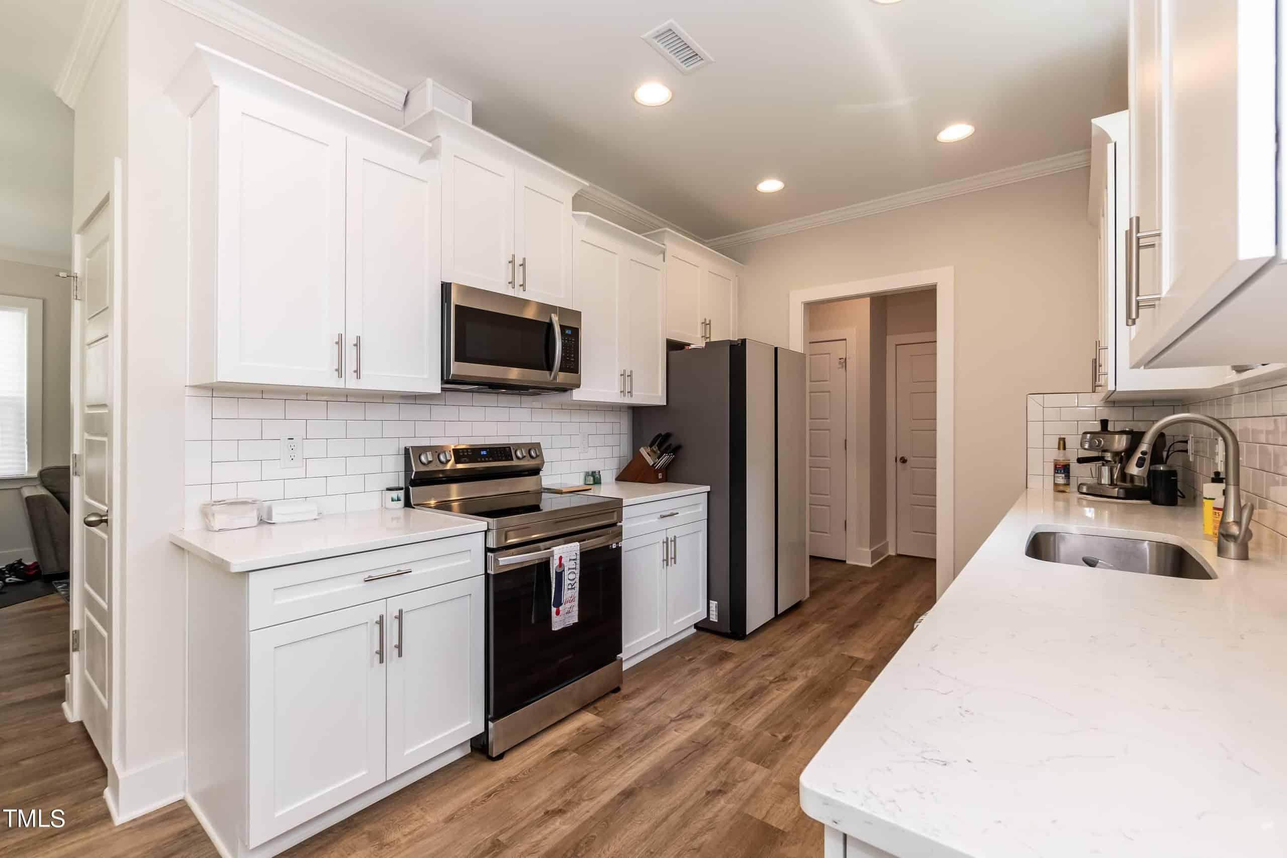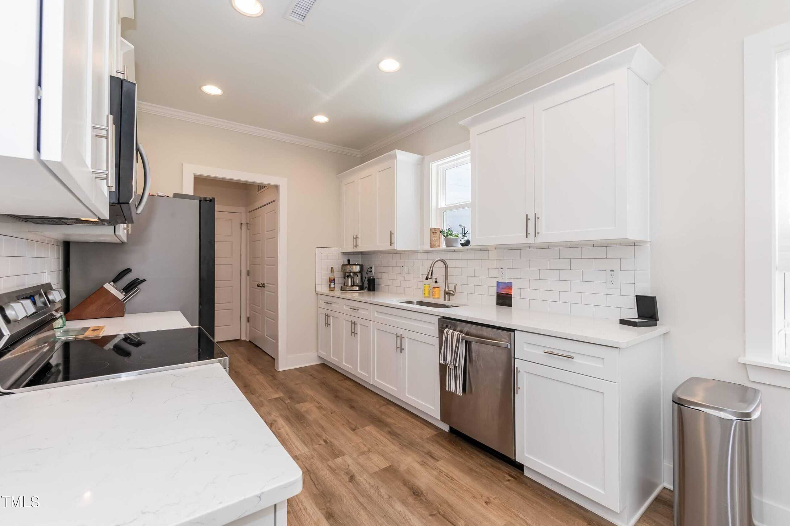 Welcome to this beautifully crafted 2023-built Craftsman-style home, designed with modern elegance and superb curb appeal. Nestled just minutes from dining and shopping in one of the northern Triangle’s most vibrant up-and-coming downtown districts, this home offers both style and convenience. The full rocking chair front porch invites you in, where warm luxury vinyl plank floors and sophisticated crown molding greet you on the main level. The kitchen boasts white shaker panel cabinets with cove crown molding, stunning quartz countertops, a subway tile backsplash, and stainless steel appliances. Recessed lighting and ample windows fill the space with natural light, while a window above the sink adds a charming spot for plants or herbs. The adjacent dining area features a sleek 3-bulb chandelier, and the family room is bright and inviting, complete with a brushed nickel ceiling fan. Upstairs, the primary suite is a serene retreat with plush carpeting, a large en-suite bathroom offering tile flooring, dual vanities, white cabinets with quartz countertops, a walk-in shower, and separate water closet. Enjoy the outdoors in the flat backyard with a concrete patio—ideal for relaxing or entertaining. Don’t miss this opportunity to live in a home that combines modern amenities with Craftsman charm in an unbeatable location!