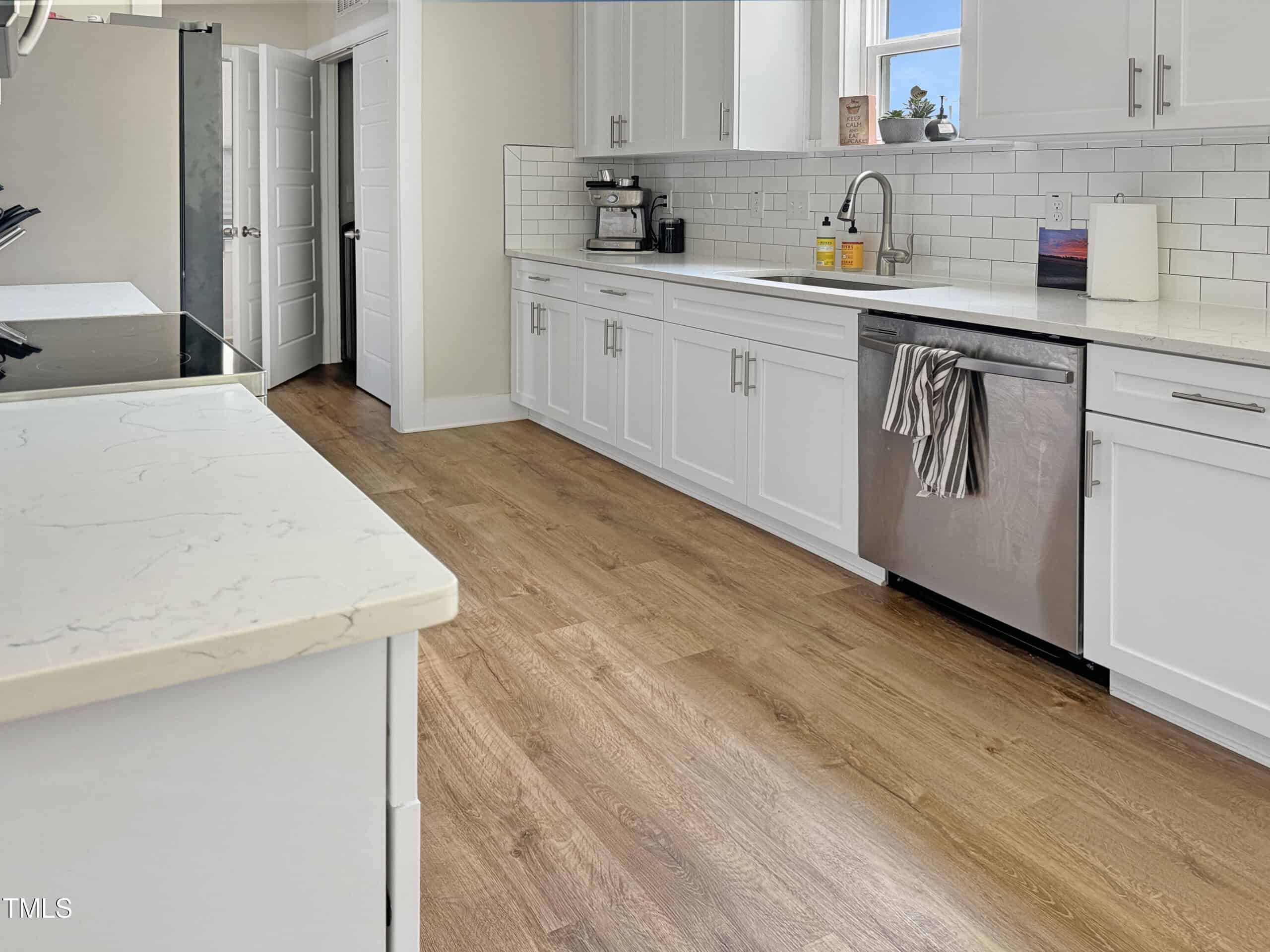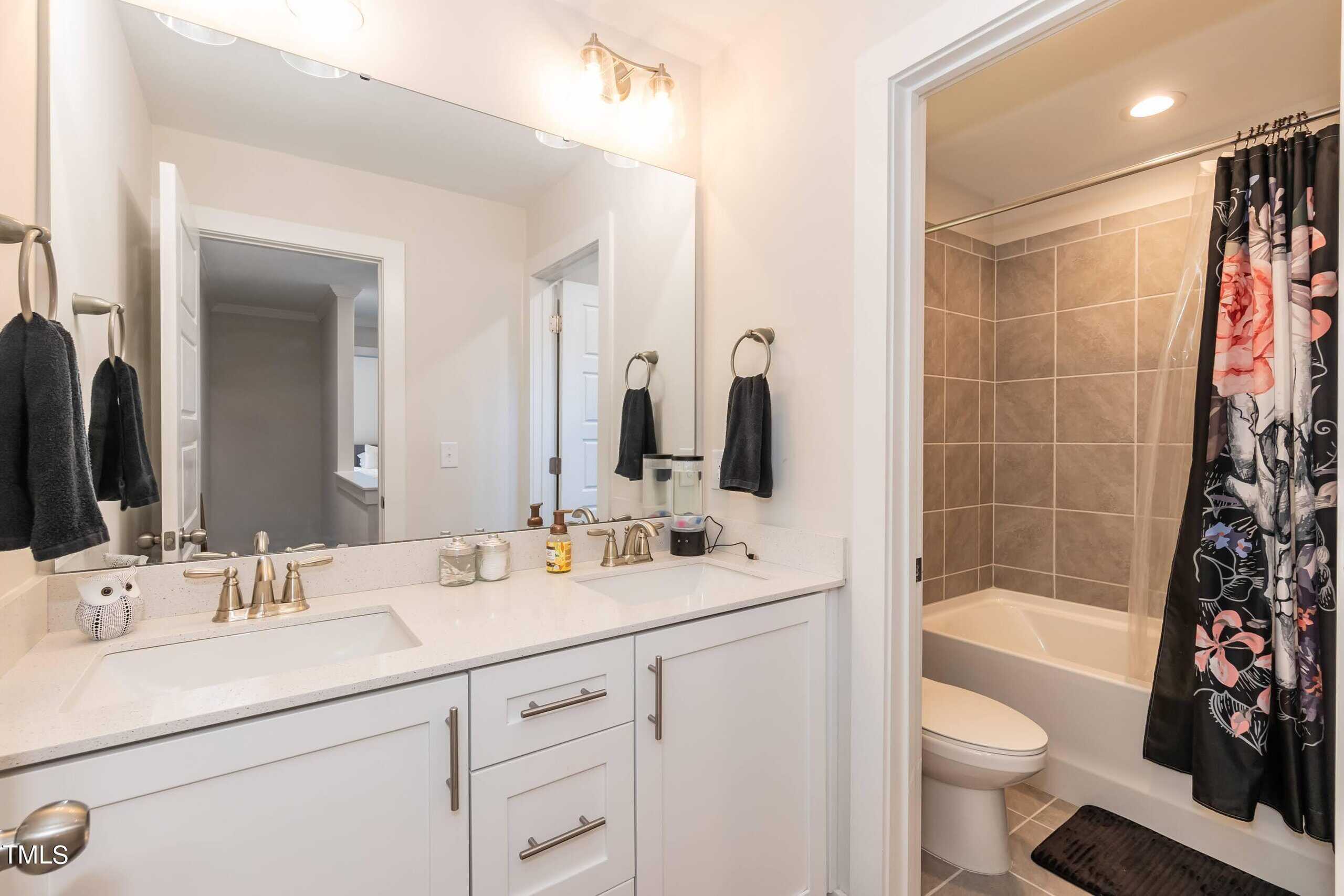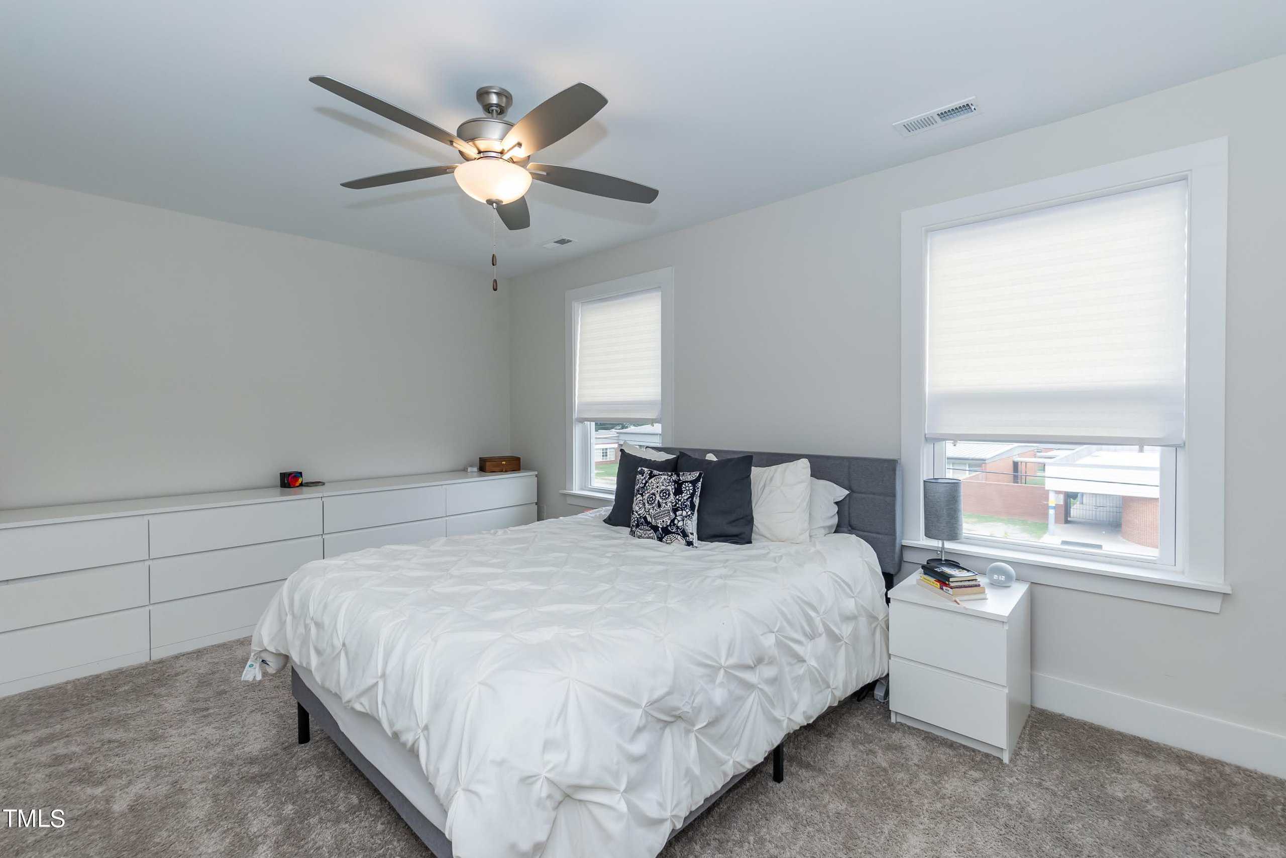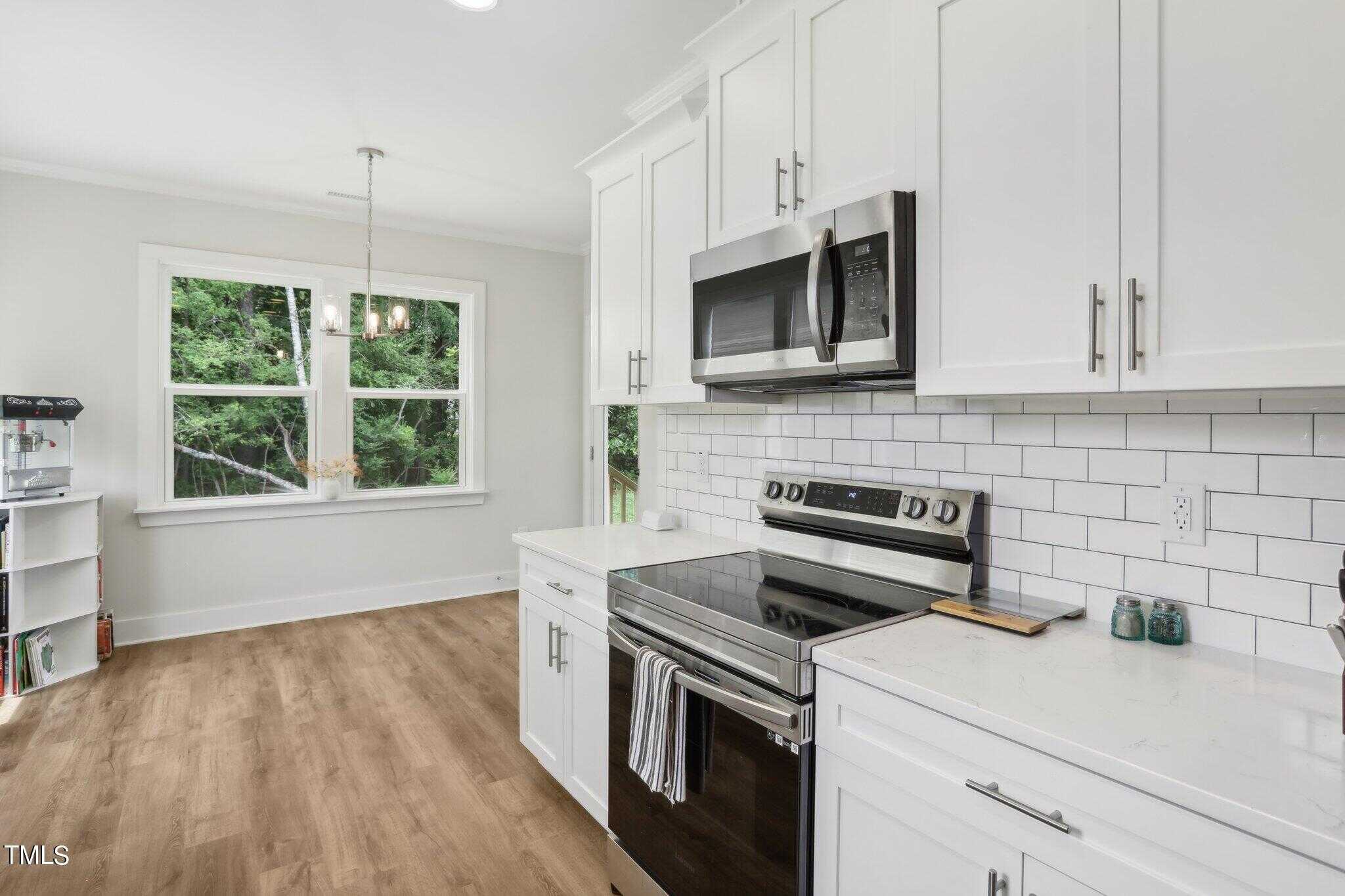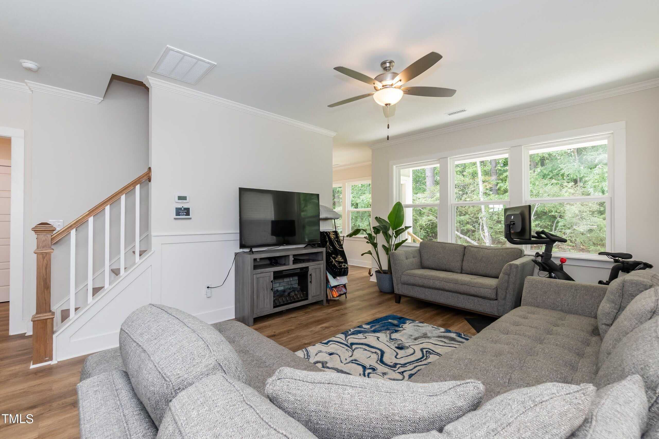 Welcome to this beautifully crafted 2023-built Craftsman-style home, designed with modern elegance and superb curb appeal. Nestled just minutes from dining and shopping in one of the northern Triangle’s most vibrant up-and-coming downtown districts, this home offers both style and convenience. The full rocking chair front porch invites you in, where warm luxury vinyl plank floors and sophisticated crown molding greet you on the main level. The kitchen boasts white shaker panel cabinets with cove crown molding, stunning quartz countertops, a subway tile backsplash, and stainless steel appliances. Recessed lighting and ample windows fill the space with natural light, while a window above the sink adds a charming spot for plants or herbs. The adjacent dining area features a sleek 3-bulb chandelier, and the family room is bright and inviting, complete with a brushed nickel ceiling fan. Upstairs, the primary suite is a serene retreat with plush carpeting, a large en-suite bathroom offering tile flooring, dual vanities, white cabinets with quartz countertops, a walk-in shower, and separate water closet. Enjoy the outdoors in the flat backyard with a concrete patio—ideal for relaxing or entertaining. Don’t miss this opportunity to live in a home that combines modern amenities with Craftsman charm in an unbeatable location!