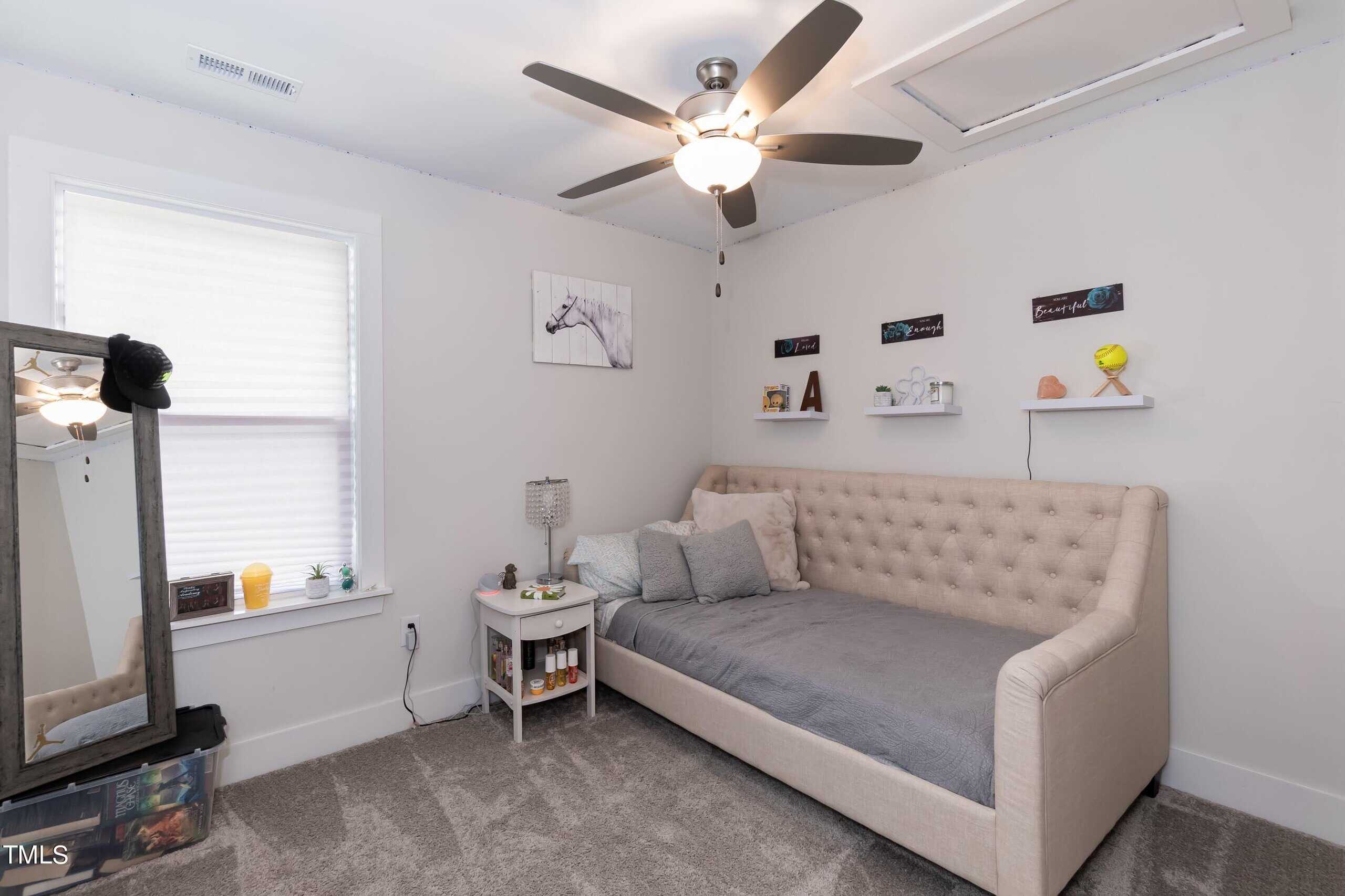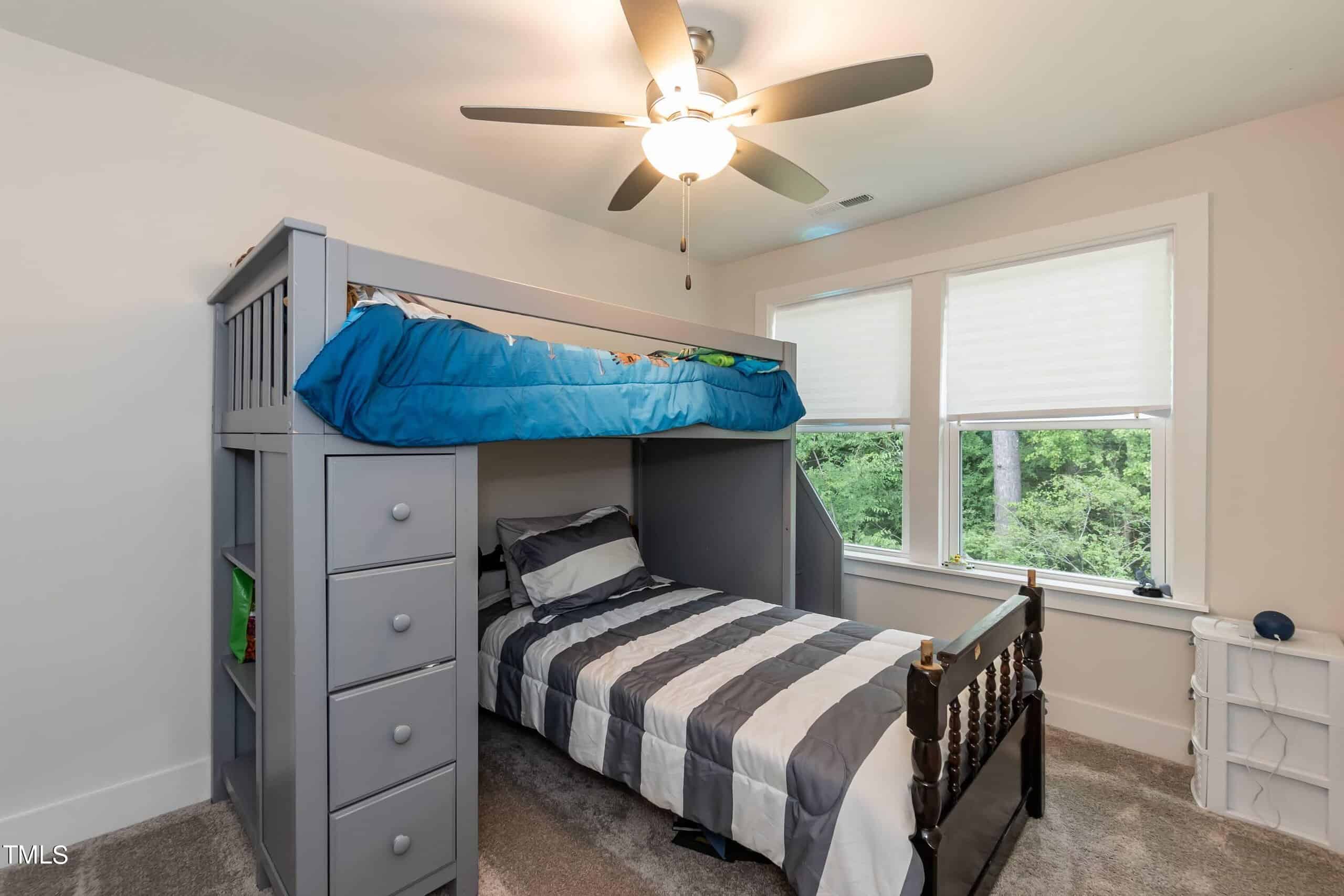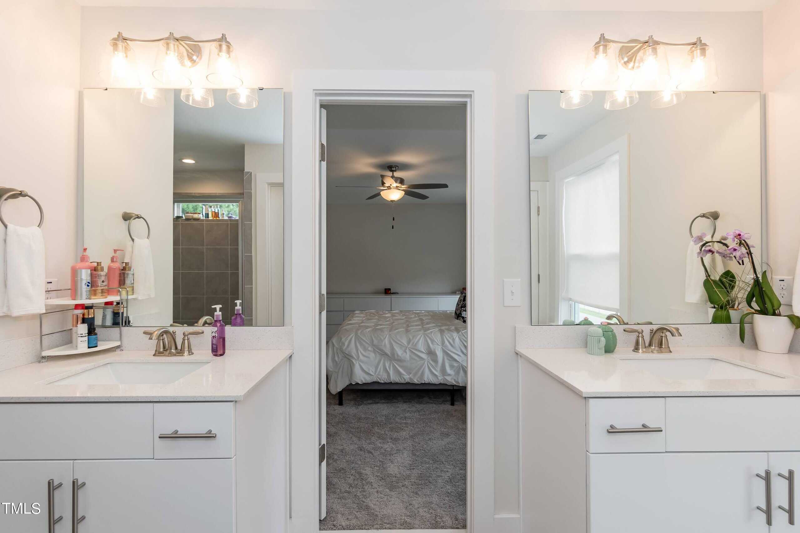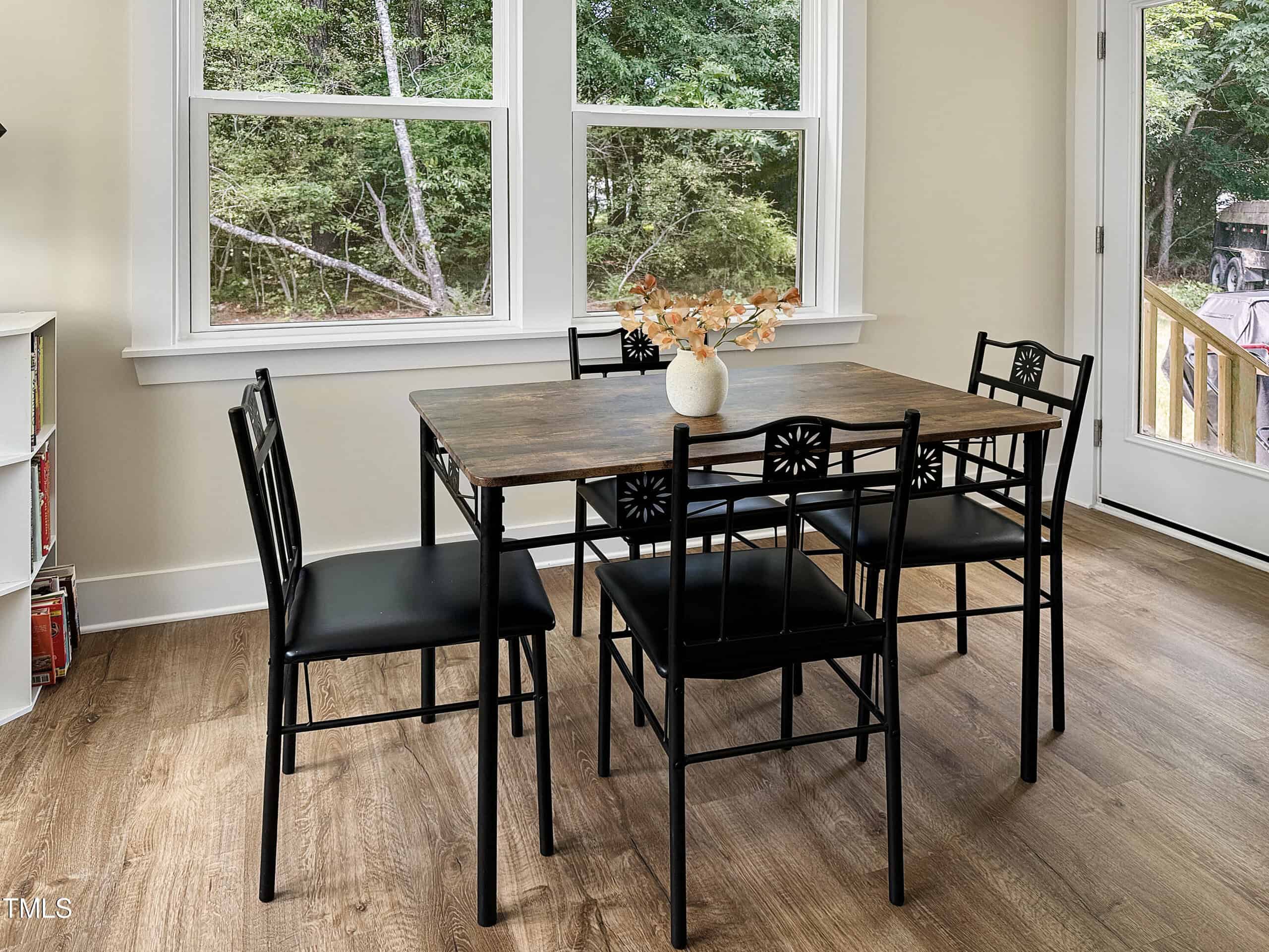 Welcome to this beautifully crafted 2023-built Craftsman-style home, designed with modern elegance and superb curb appeal. Nestled just minutes from dining and shopping in one of the northern Triangle’s most vibrant up-and-coming downtown districts, this home offers both style and convenience. The full rocking chair front porch invites you in, where warm luxury vinyl plank floors and sophisticated crown molding greet you on the main level. The kitchen boasts white shaker panel cabinets with cove crown molding, stunning quartz countertops, a subway tile backsplash, and stainless steel appliances. Recessed lighting and ample windows fill the space with natural light, while a window above the sink adds a charming spot for plants or herbs. The adjacent dining area features a sleek 3-bulb chandelier, and the family room is bright and inviting, complete with a brushed nickel ceiling fan. Upstairs, the primary suite is a serene retreat with plush carpeting, a large en-suite bathroom offering tile flooring, dual vanities, white cabinets with quartz countertops, a walk-in shower, and separate water closet. Enjoy the outdoors in the flat backyard with a concrete patio—ideal for relaxing or entertaining. Don’t miss this opportunity to live in a home that combines modern amenities with Craftsman charm in an unbeatable location!