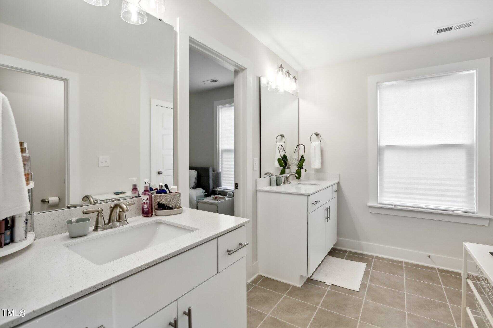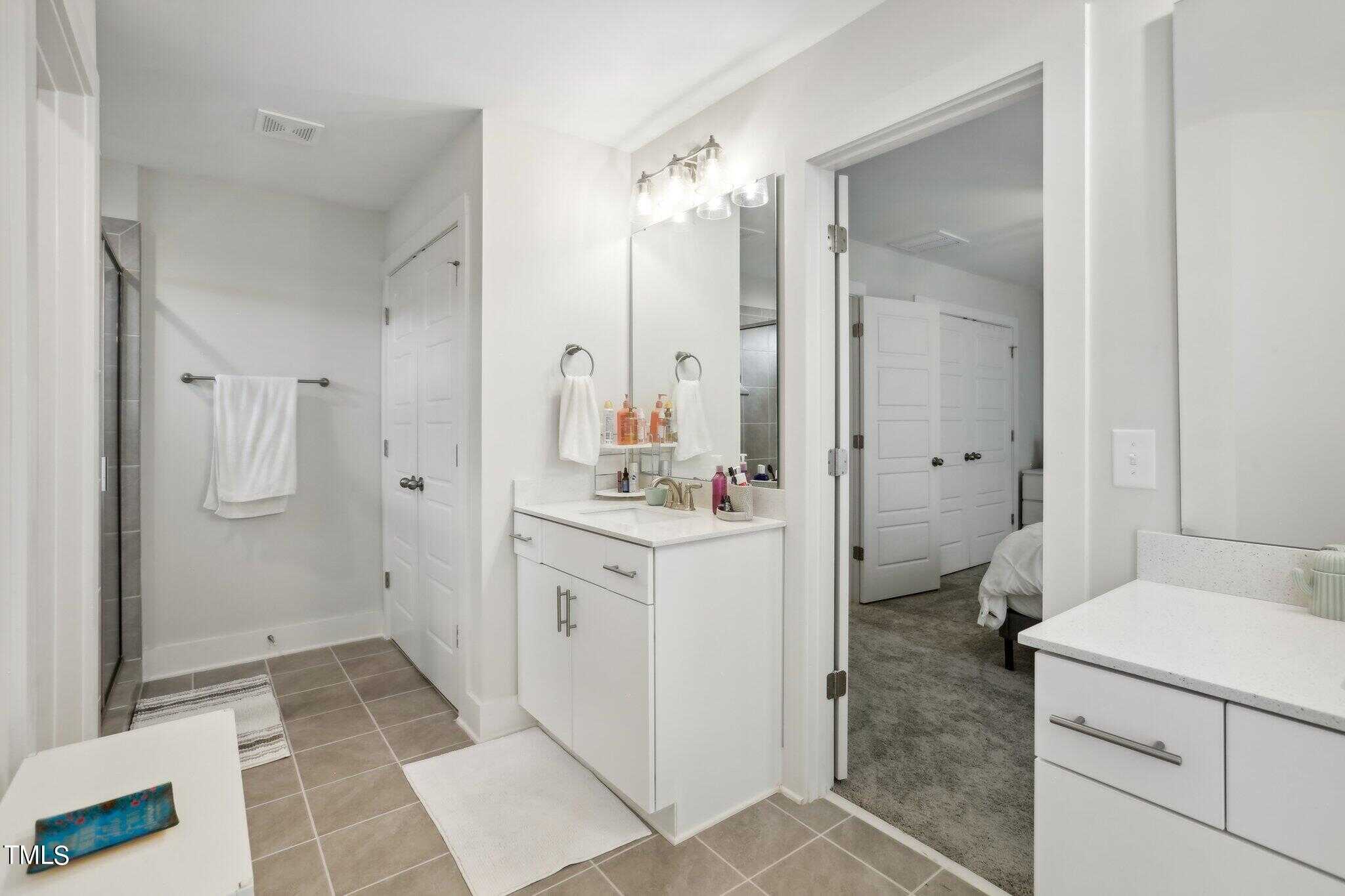 Upstairs, the primary suite is a serene retreat with plush carpeting, a large en-suite bathroom offering tile flooring, dual vanities, white cabinets with quartz countertops, a walk-in shower, and separate water closet.