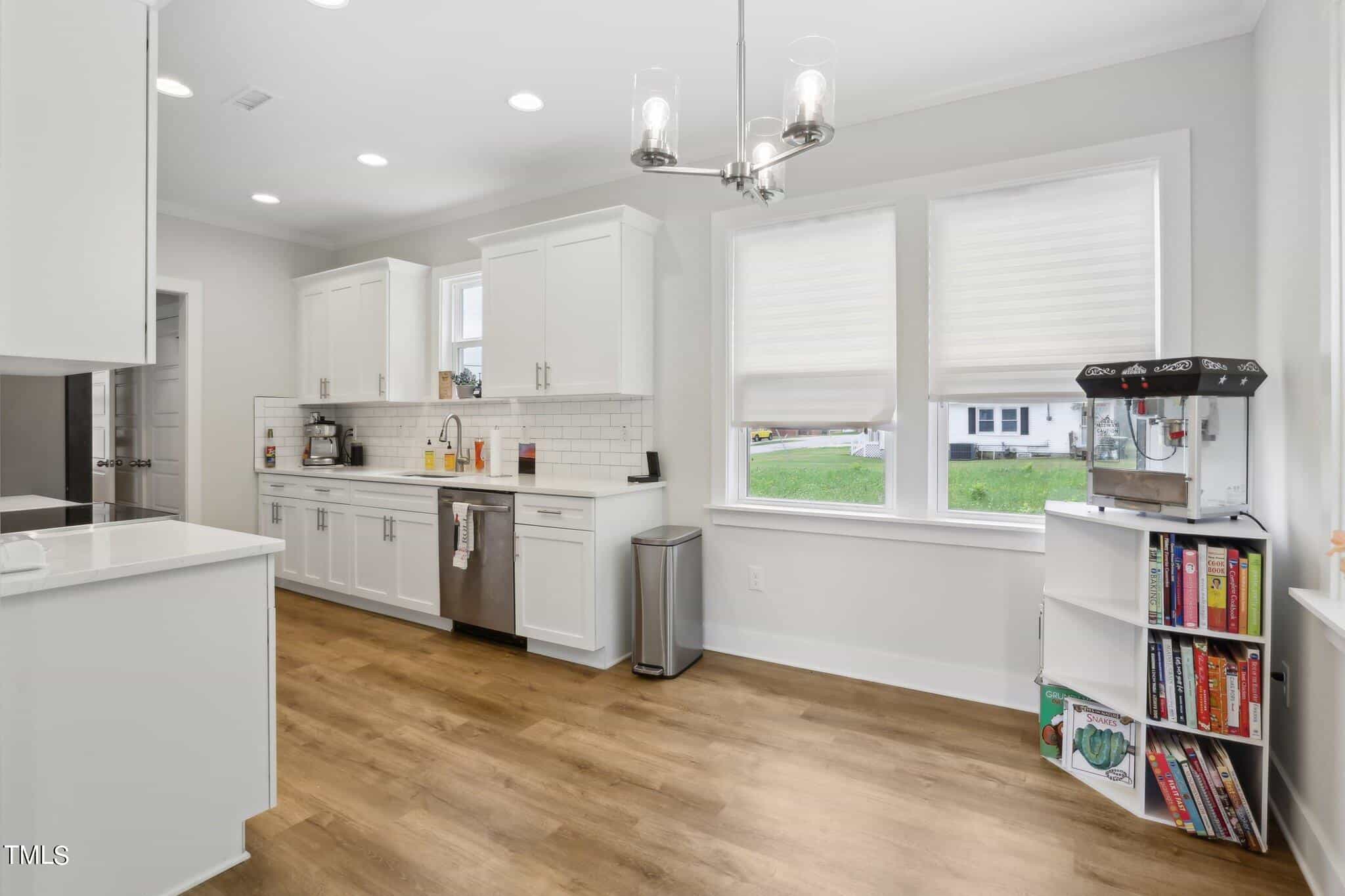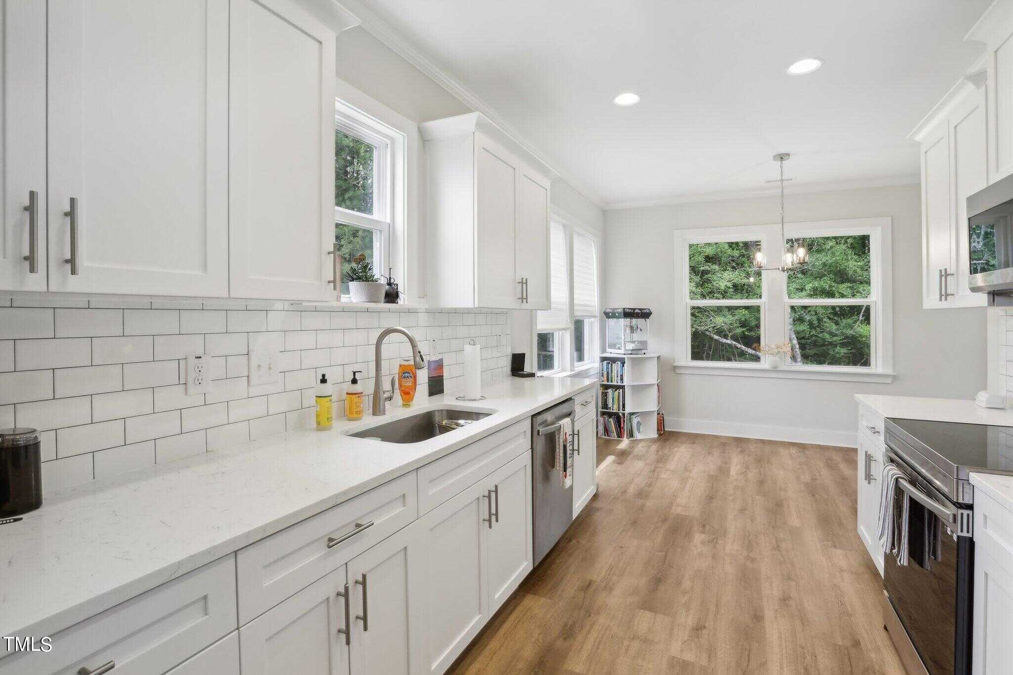 The kitchen boasts white shaker panel cabinets with cove crown molding, stunning quartz countertops, a subway tile backsplash, and stainless steel appliances. Recessed lighting and ample windows fill the space with natural light, while a window above the sink adds a charming spot for plants or herbs.