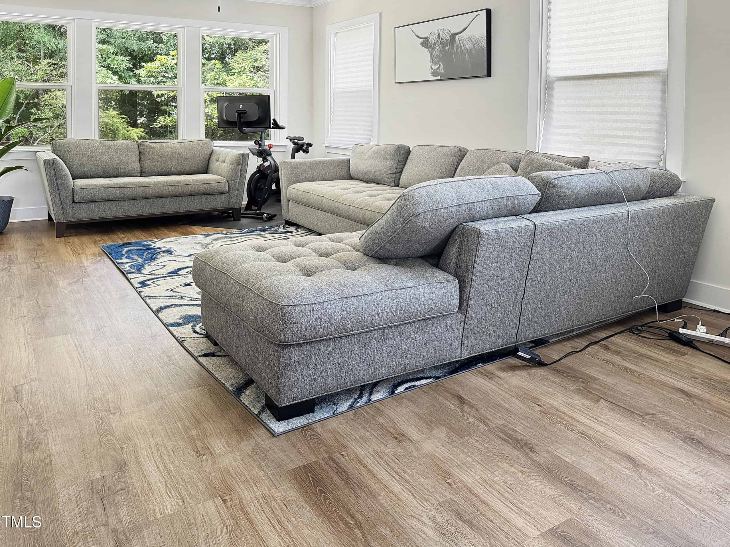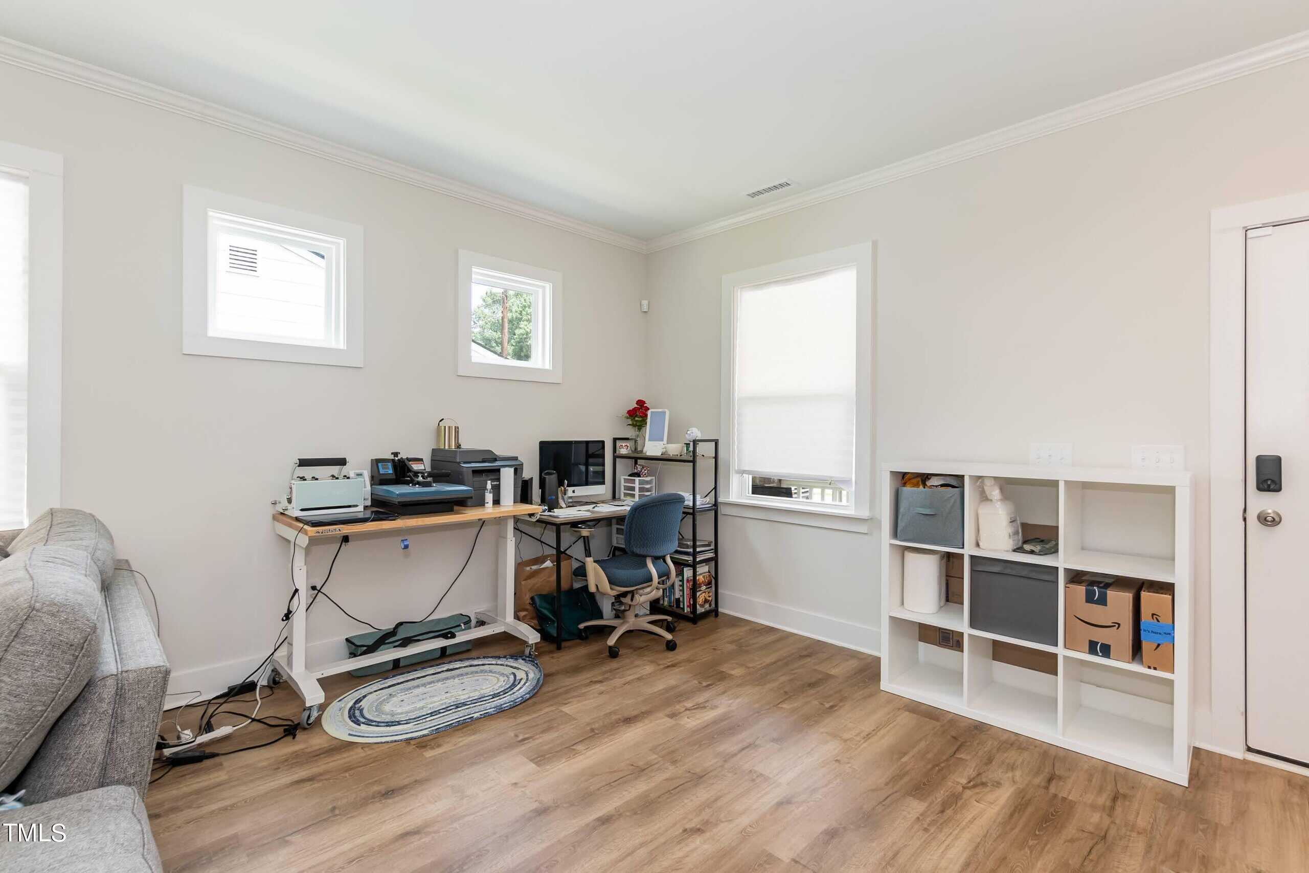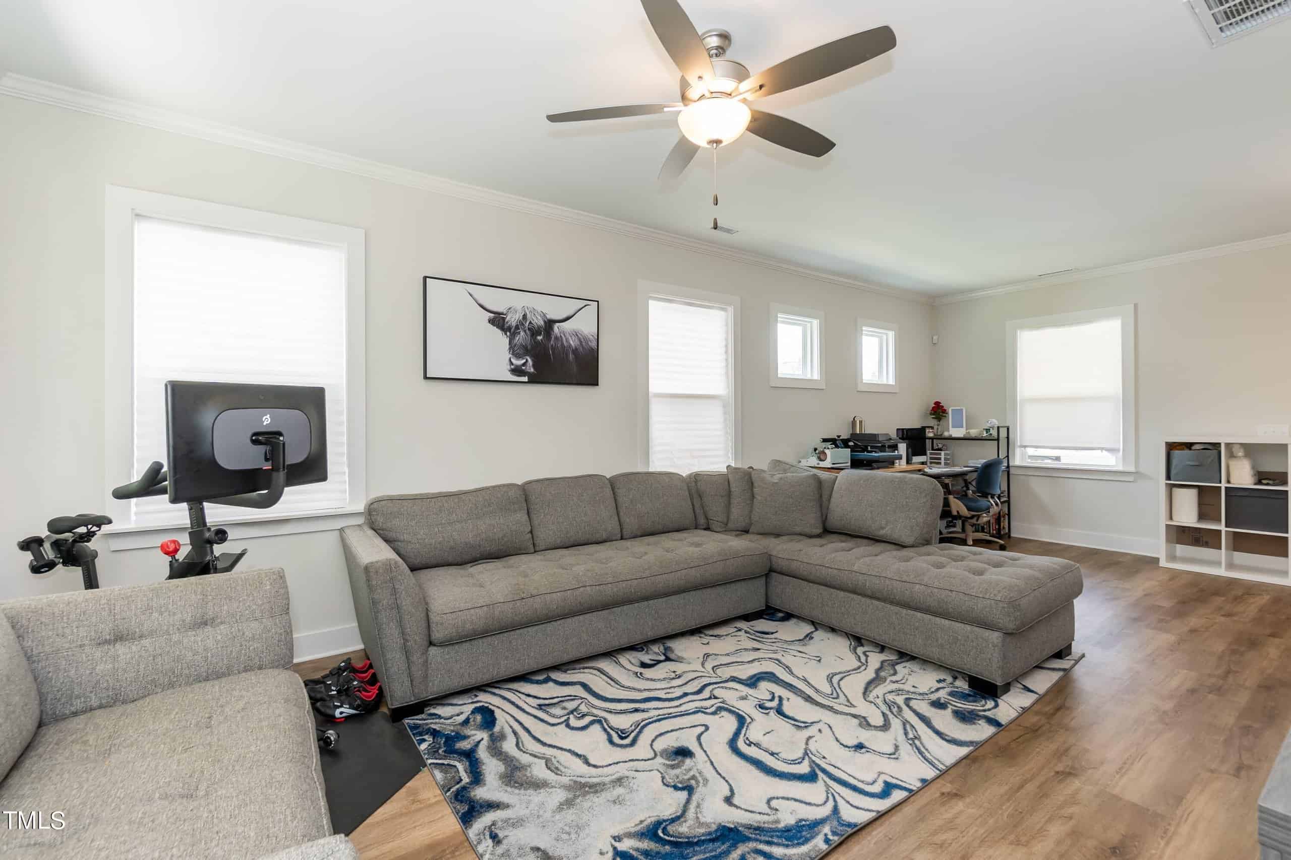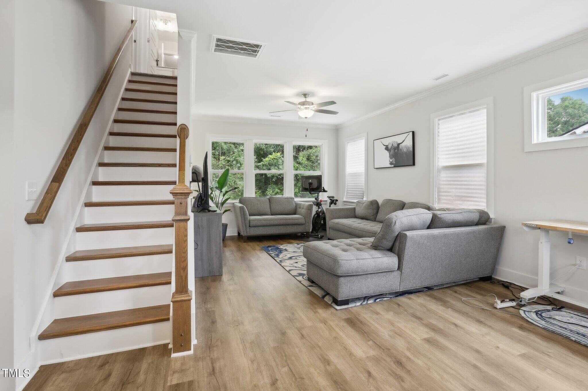 Welcome to this beautifully crafted 2023-built Craftsman-style home, designed with modern elegance and superb curb appeal. Nestled just minutes from dining and shopping in one of the northern Triangle’s most vibrant up-and-coming downtown districts, this home offers both style and convenience. The full rocking chair front porch invites you in, where warm luxury vinyl plank floors and sophisticated crown molding greet you on the main level.