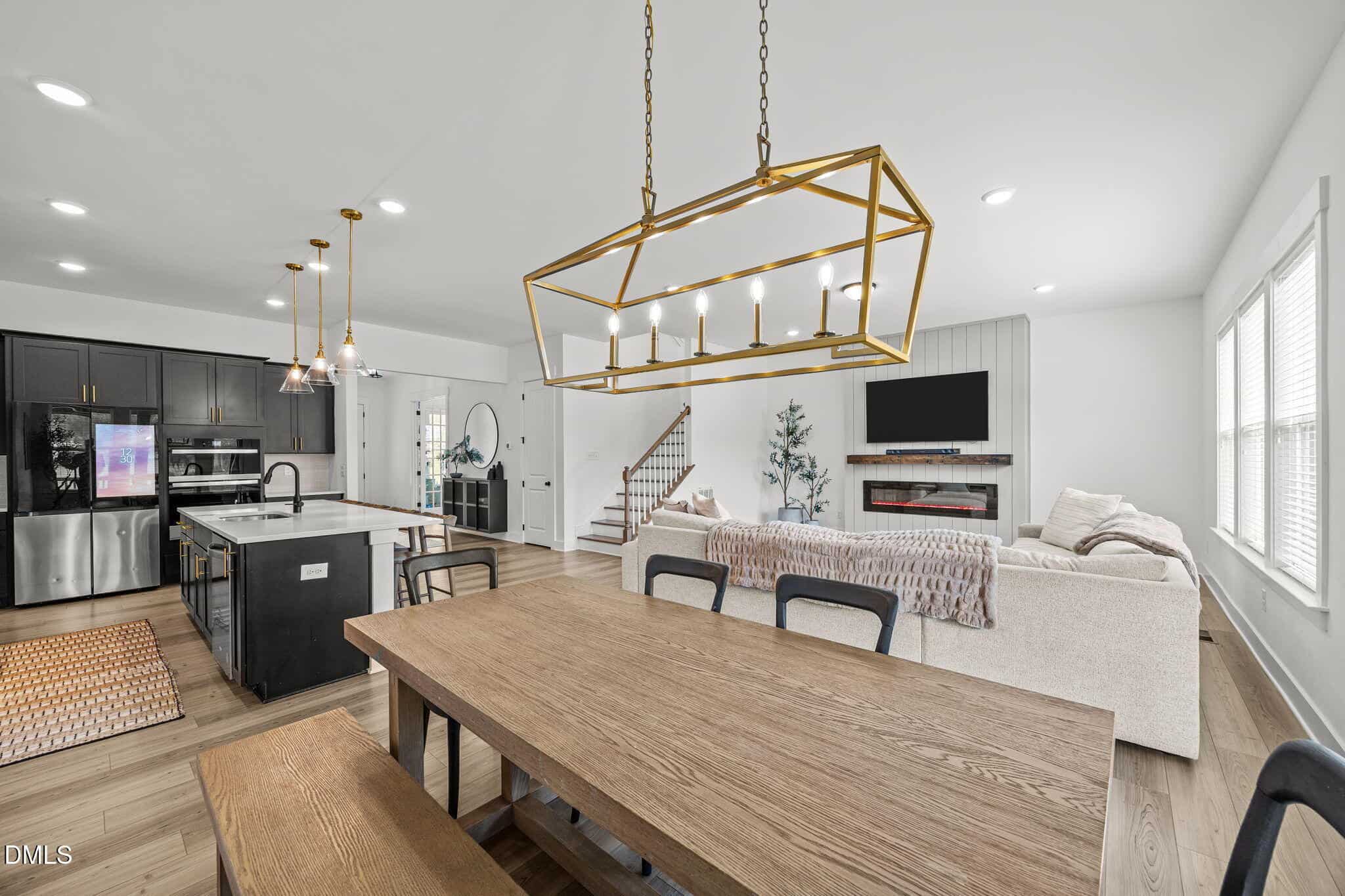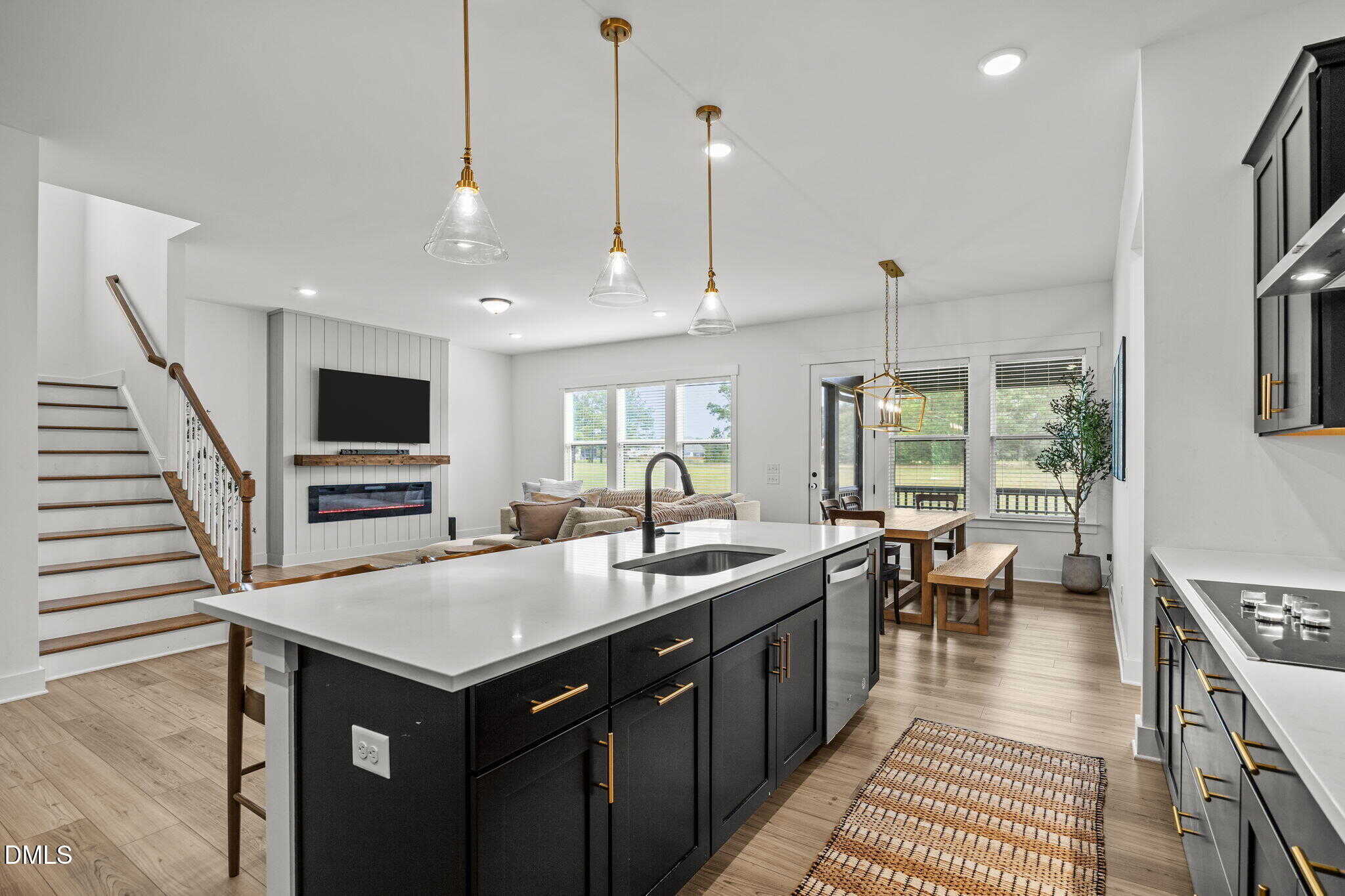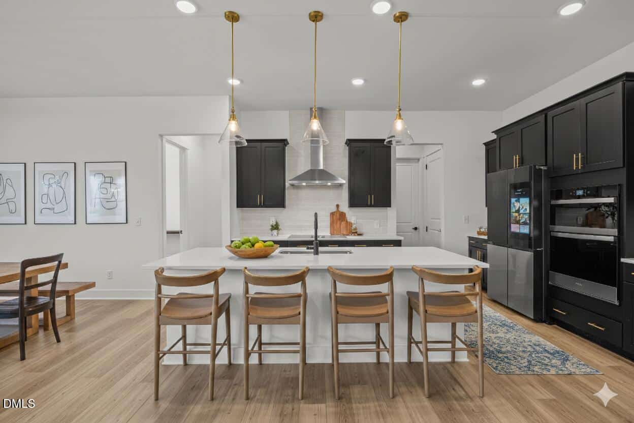 The chef’s kitchen is a showstopper with painted flat-panel cabinetry, brushed gold hardware, quartz countertops, subway tile backsplash, and a center island illuminated by clear glass globe pendants. Stainless Whirlpool appliances include an electric cooktop with a stainless hood. The kitchen flows seamlessly into the casual dining area and the spacious family room, anchored by a modern linear electric fireplace with stained wood mantel and shiplap accent wall.