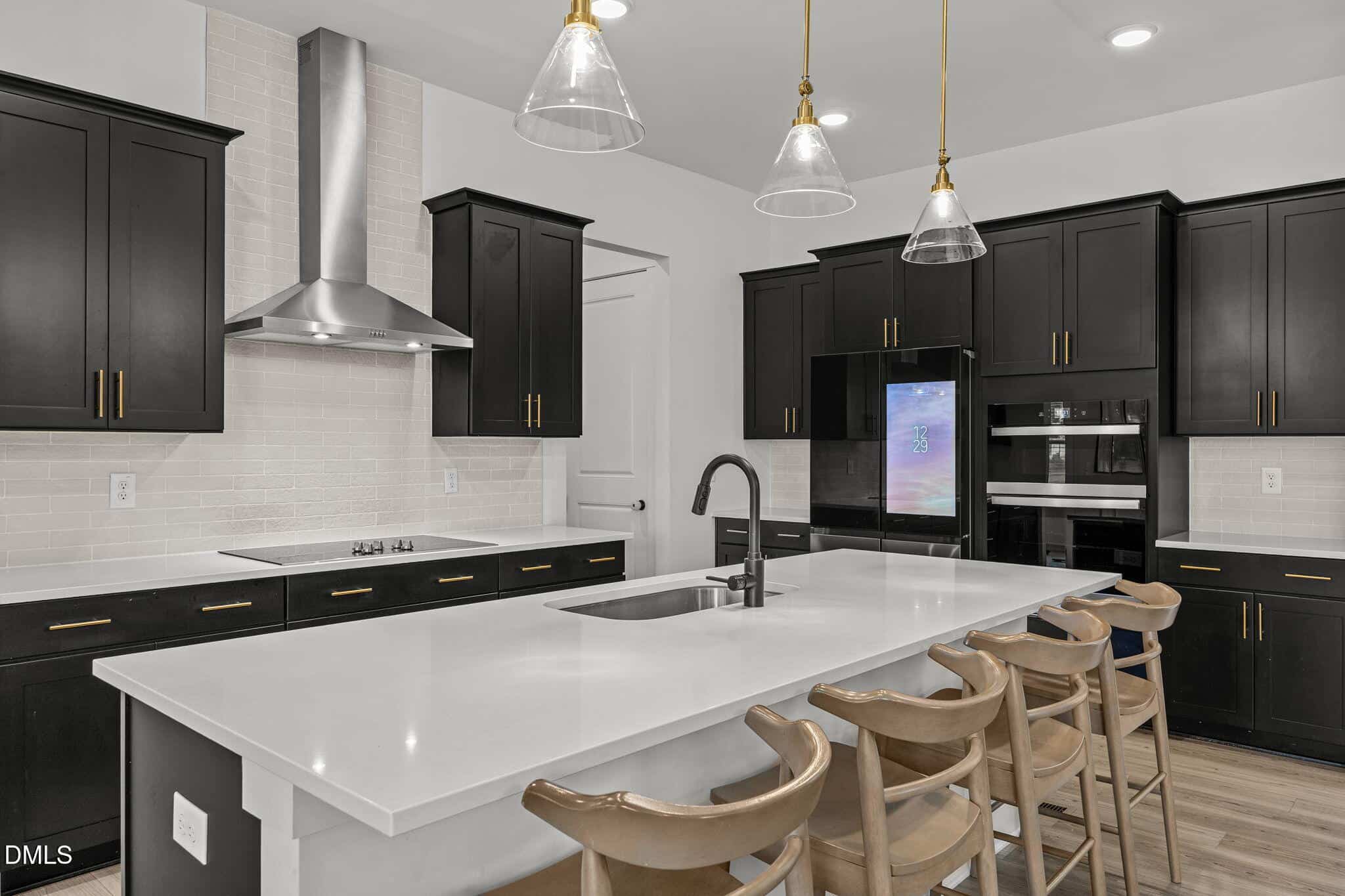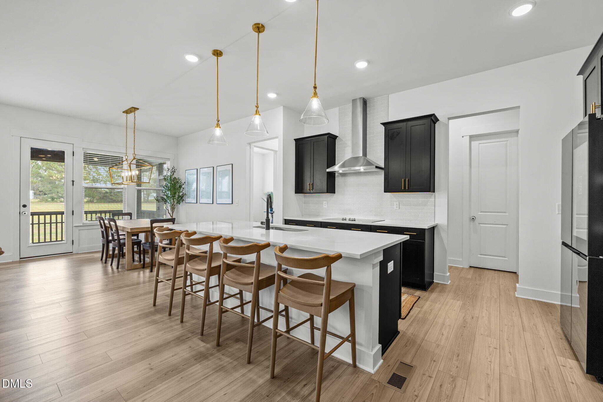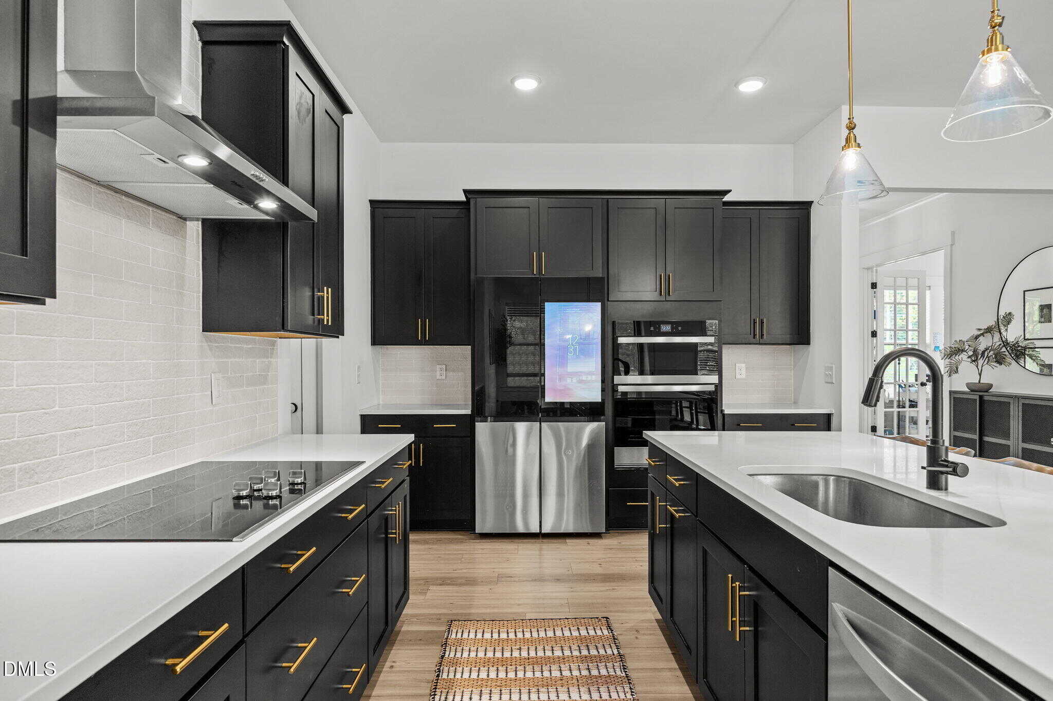 The chef’s kitchen is a showstopper with painted flat-panel cabinetry, brushed gold hardware, quartz countertops, subway tile backsplash, and a center island illuminated by clear glass globe pendants. Stainless Whirlpool appliances include an electric cooktop with a stainless hood. The kitchen flows seamlessly into the casual dining area and the spacious family room, anchored by a modern linear electric fireplace with stained wood mantel and shiplap accent wall.