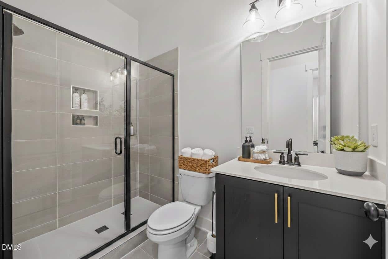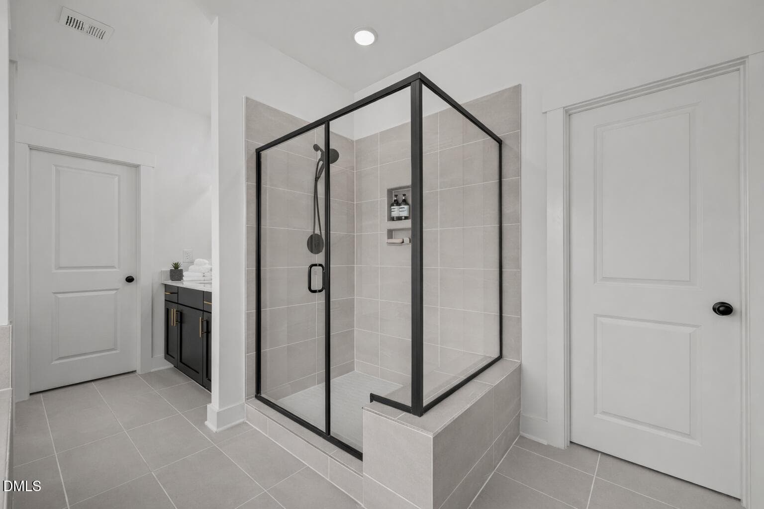 The main floor includes a bright home office/study with glass French doors, plus a private guest/in-law suite with a full bath featuring an oversized walk-in shower and large-format tile surround.