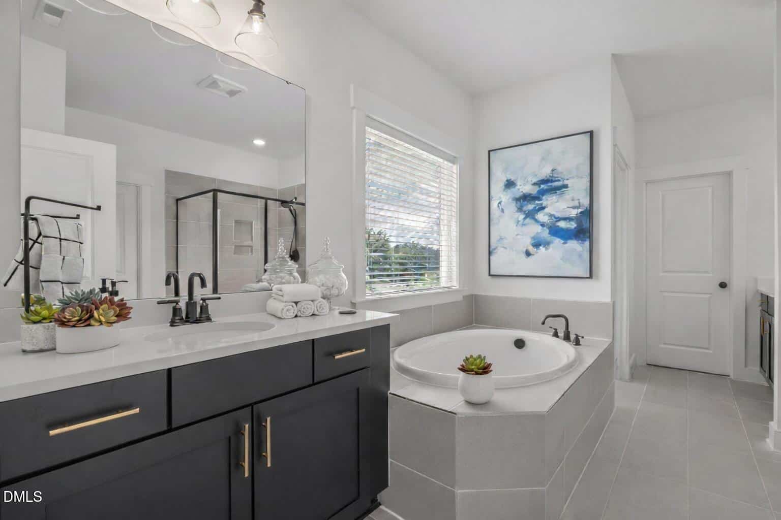 Upstairs, the owner’s suite retreat features dual walk-in closets and a spa-inspired bath with dual quartz-topped vanities, soaking tub, and separate tiled shower. A generous loft area is perfect for a playroom or media space, plus there’s a flex room, two secondary bedrooms, and two additional baths.