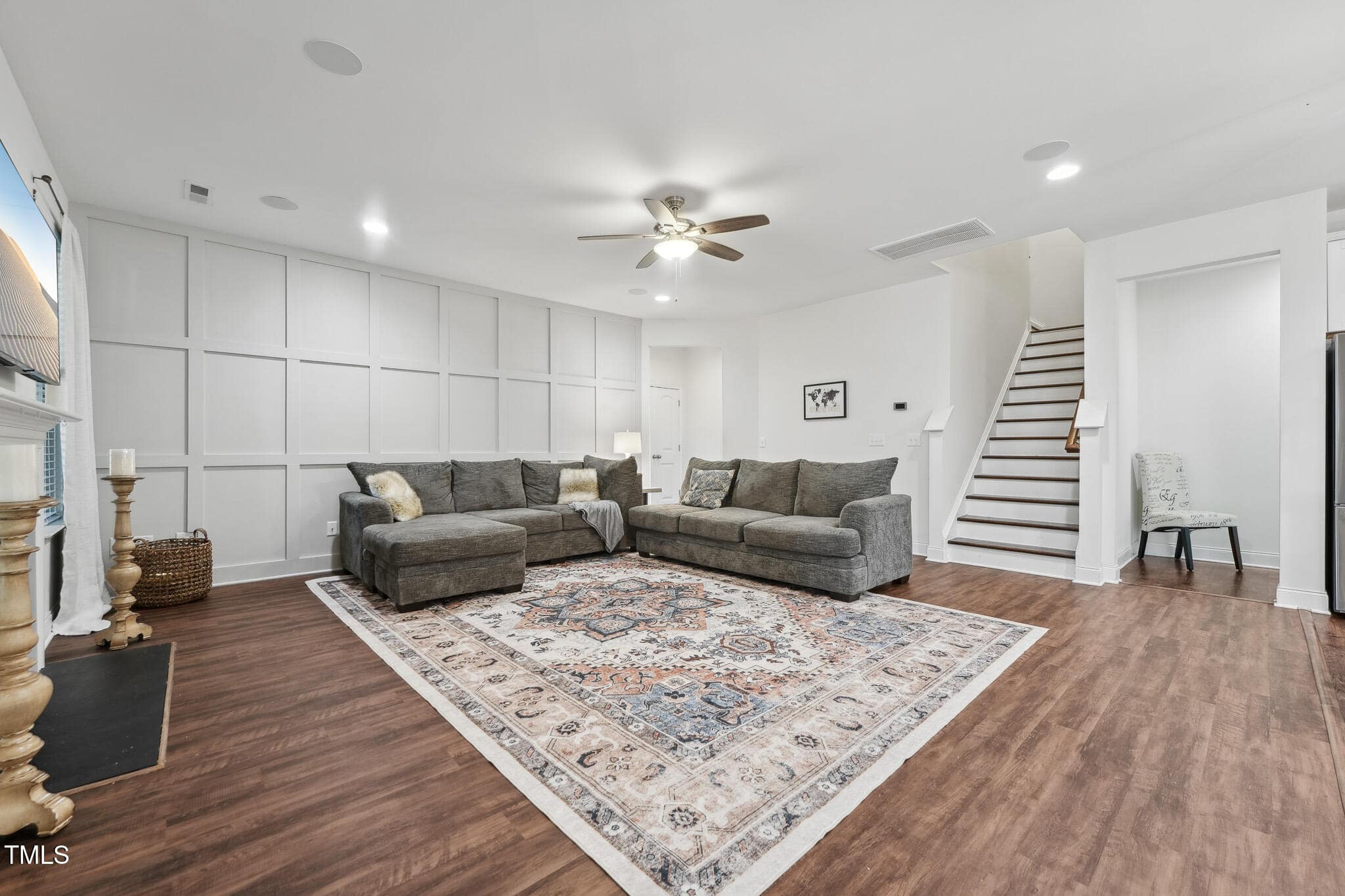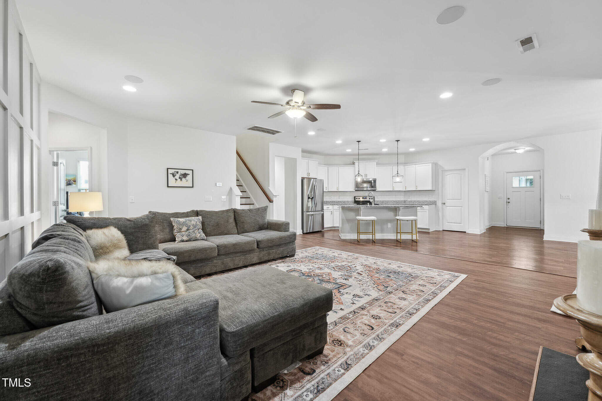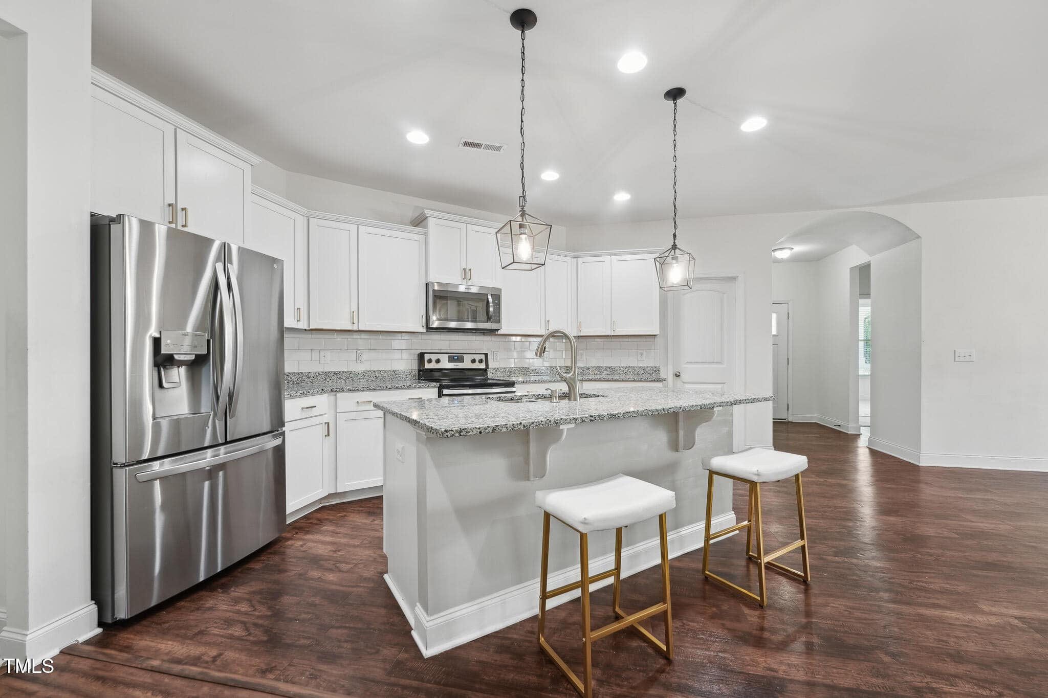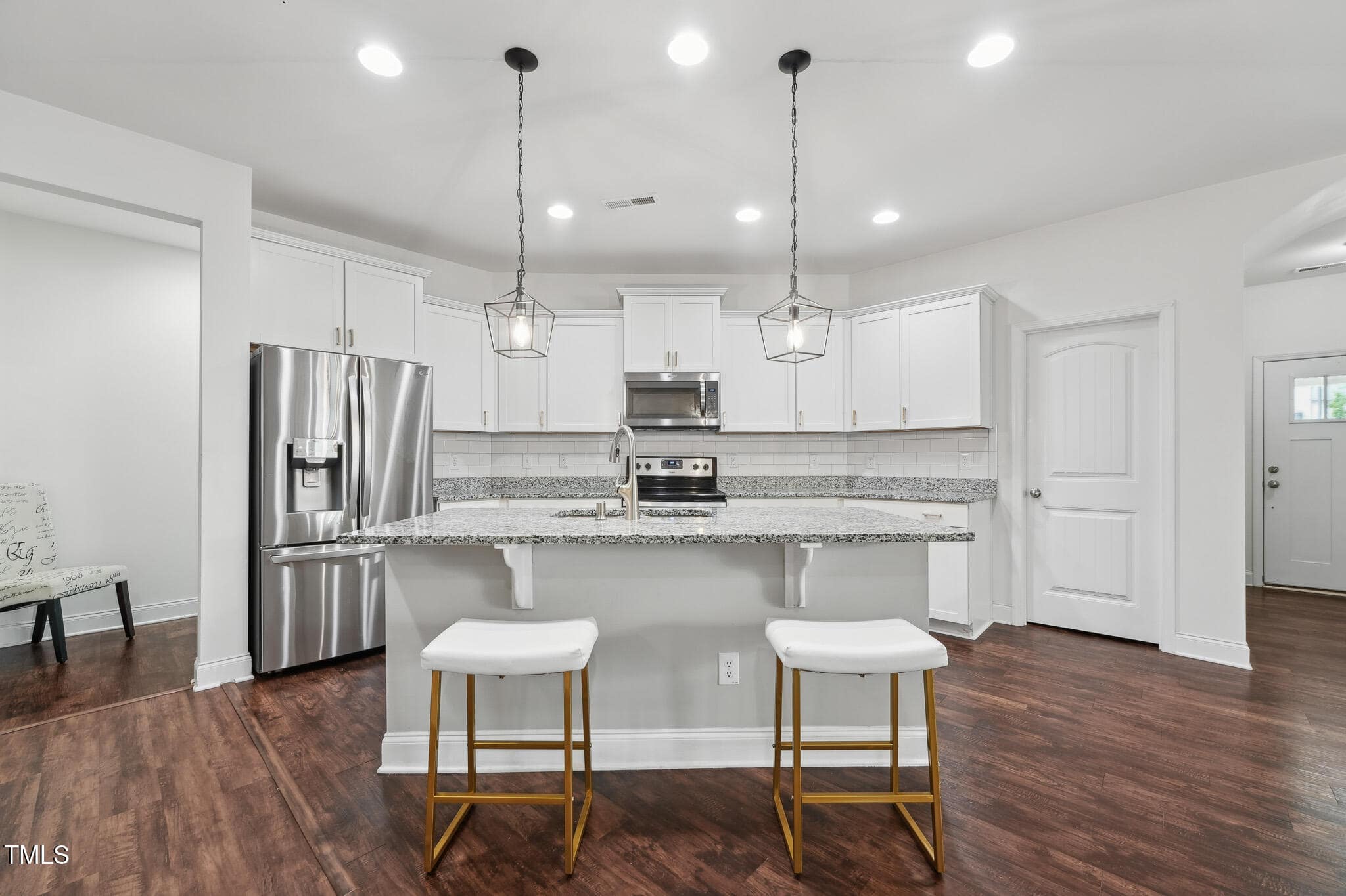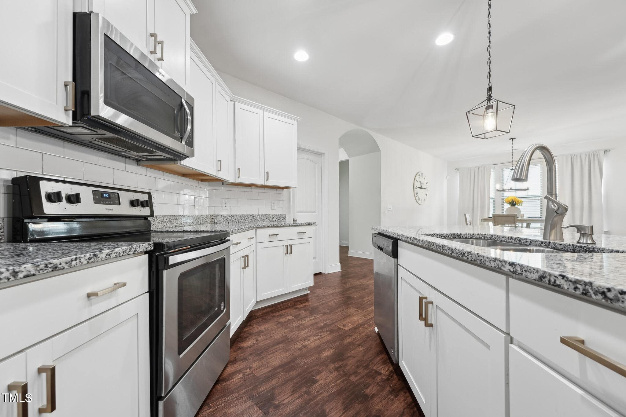 The Family Room showcases a new accent wall, newer LVP flooring, a cozy gas log fireplace, and a wall of windows that enhance the space with natural light. The Kitchen is a chef’s delight, featuring crisp white cabinetry, granite countertops, stainless steel appliances, new subway tile backsplash, updated fixtures, and large center island with bar seating.