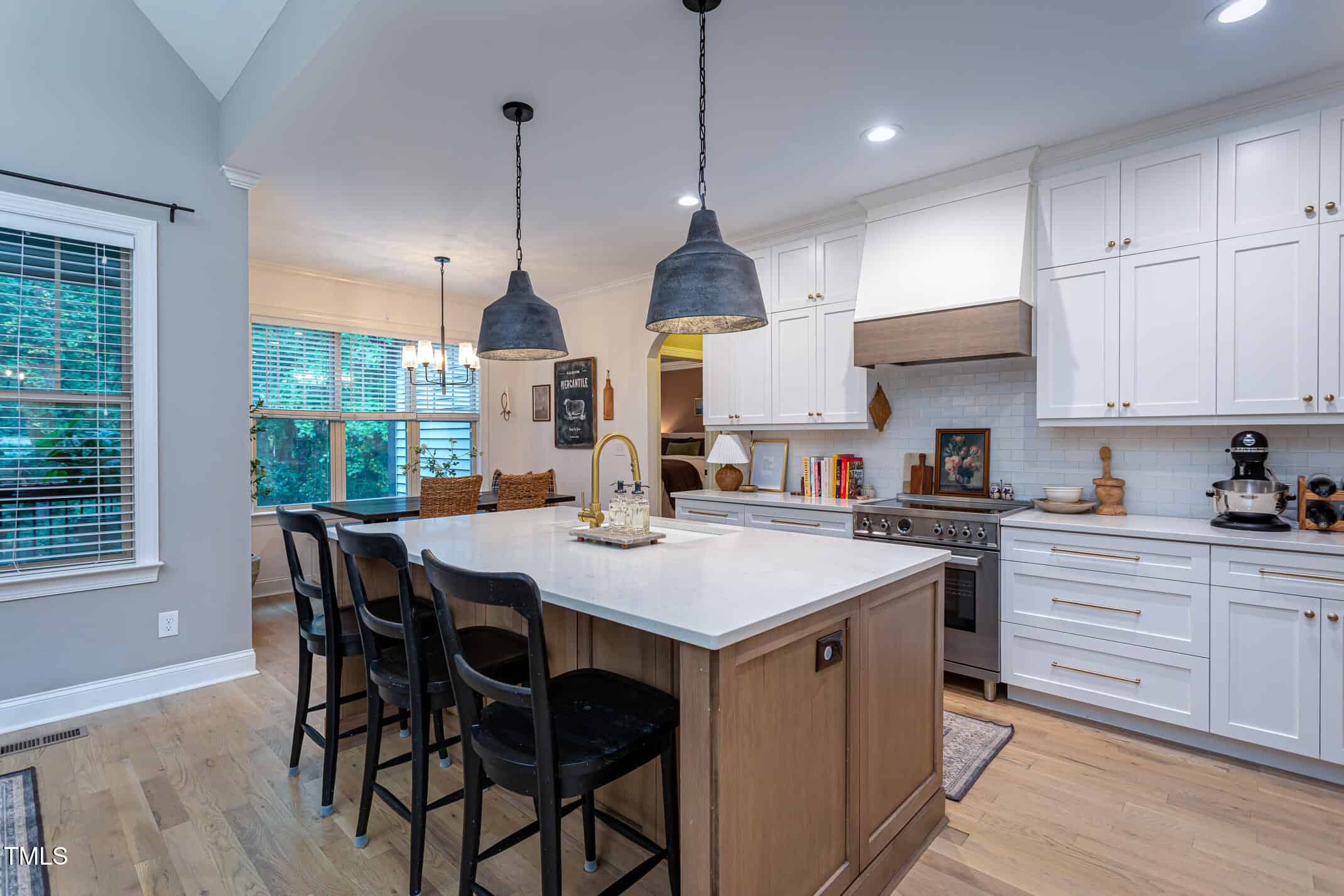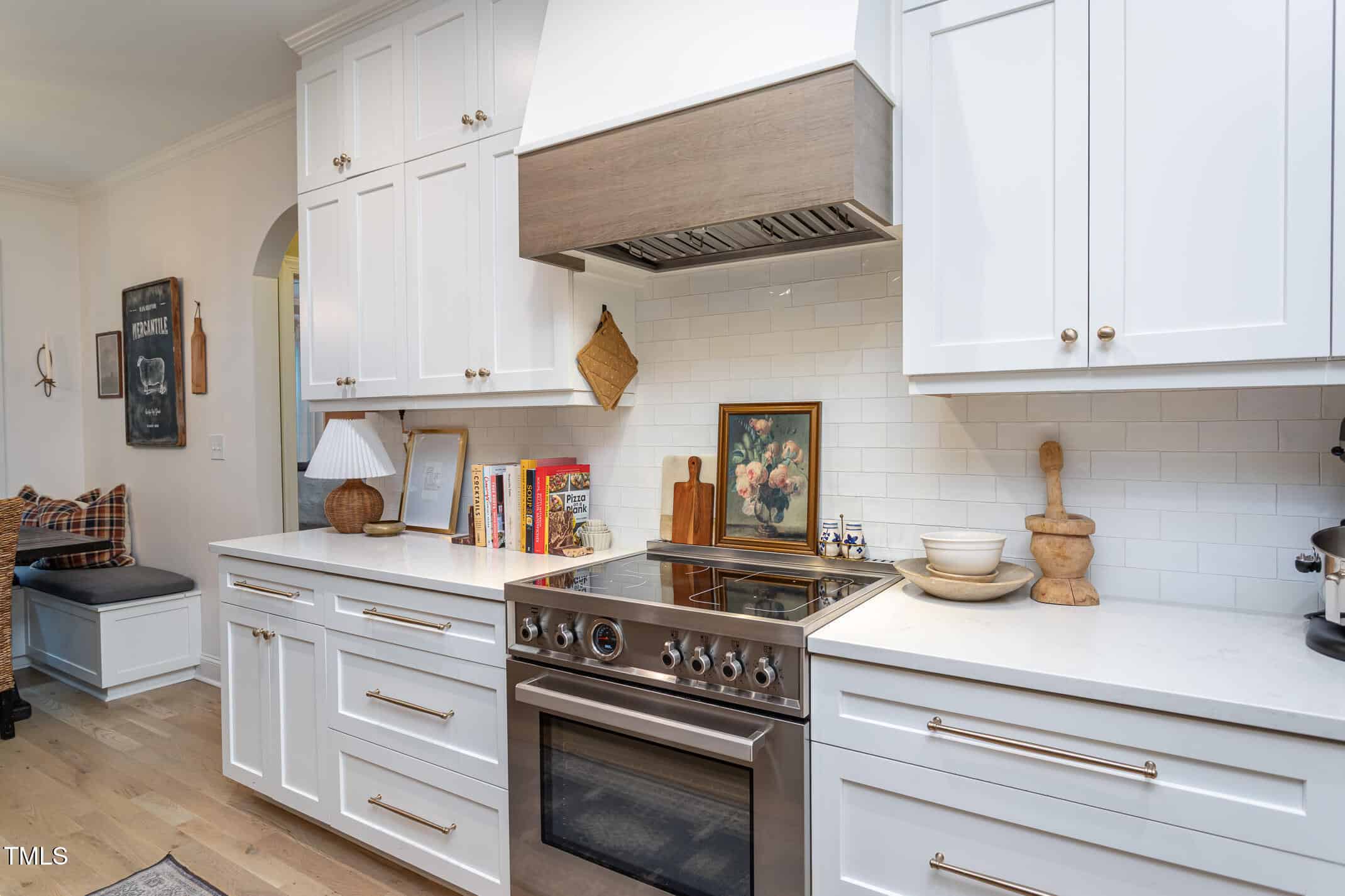 Recent kitchen and primary bath renovations include a professional-series induction range, Level-5 quartz, designer lighting, new custom cabinetry, tile backsplash, under-cabinet lighting, built-in bench seating, range hood, soaking tub, luxe shower, vanities and fixtures.