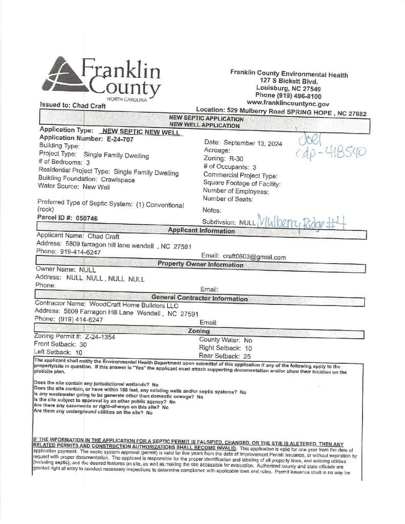 Substantial Price Reduction! New construction on a 1.22 acre unrestricted, road frontage lot in southern Franklin County minutes away from Hwy. 64 and on to Raleigh. This 1953 SF home has an open floor plan with 3 Bedrooms & 2 full Baths on the first level, and a 303 SF Bonus Room and walk-in storage upstairs, plus a two car attached garage. The Family room with vaulted ceilings and fireplace opens to the kitchen and dining area. Kitchen has a island with granite countertop, custom cabinets, stainless steel appliances, and a pantry. Dining area opens to a covered rear porch. Master suite with a trey ceiling and walk-in closet. Master bath has ceramic tile shower, garden tub and a double vanity with granite countertops. Hall bath has a fiber glass tub/shower combo and a single sink vanity with granite countertops. Smooth painted 9-foot ceilings throughout house. Luxury Vinyl Plank (LVP) flooring in foyer, family room, kitchen, and dining area. LVP in laundry room and bathroom. Carpet in bedrooms, stairs, and bonus room. White vinyl, Low-E single hung windows. High efficiency heat pump. Second level has bonus room and walk-in unfinished space for storage. Duke Progress Energy, Well Water and On-site Septic. County Taxes only. Seller’s preferred lender will assist with Buyer’s closing costs or interest rate buy down. Seller will contribute $3,000 toward Buyer’s closing cost with an acceptable offer.