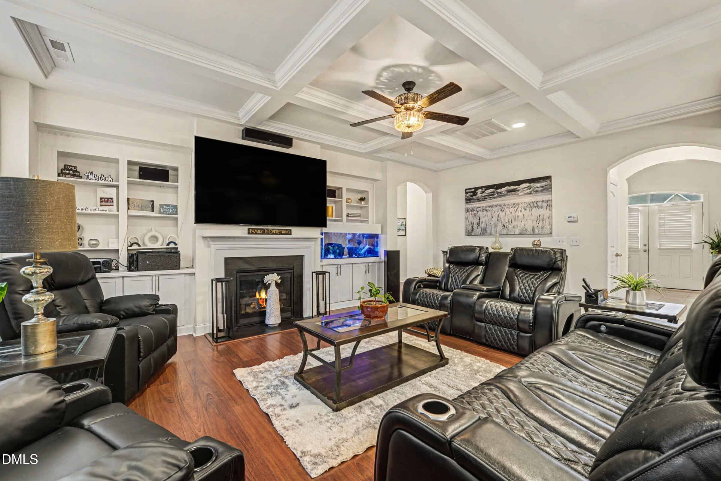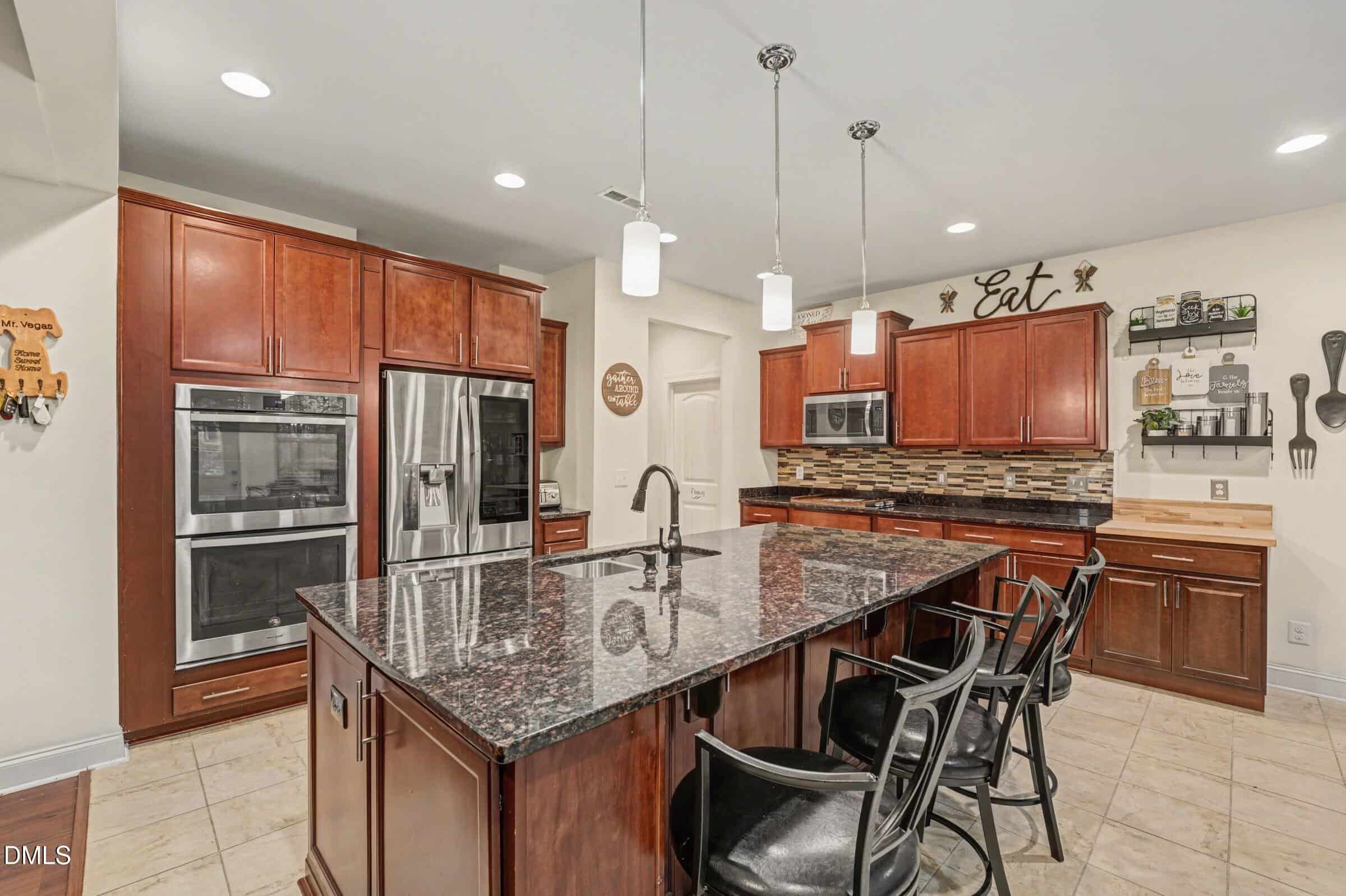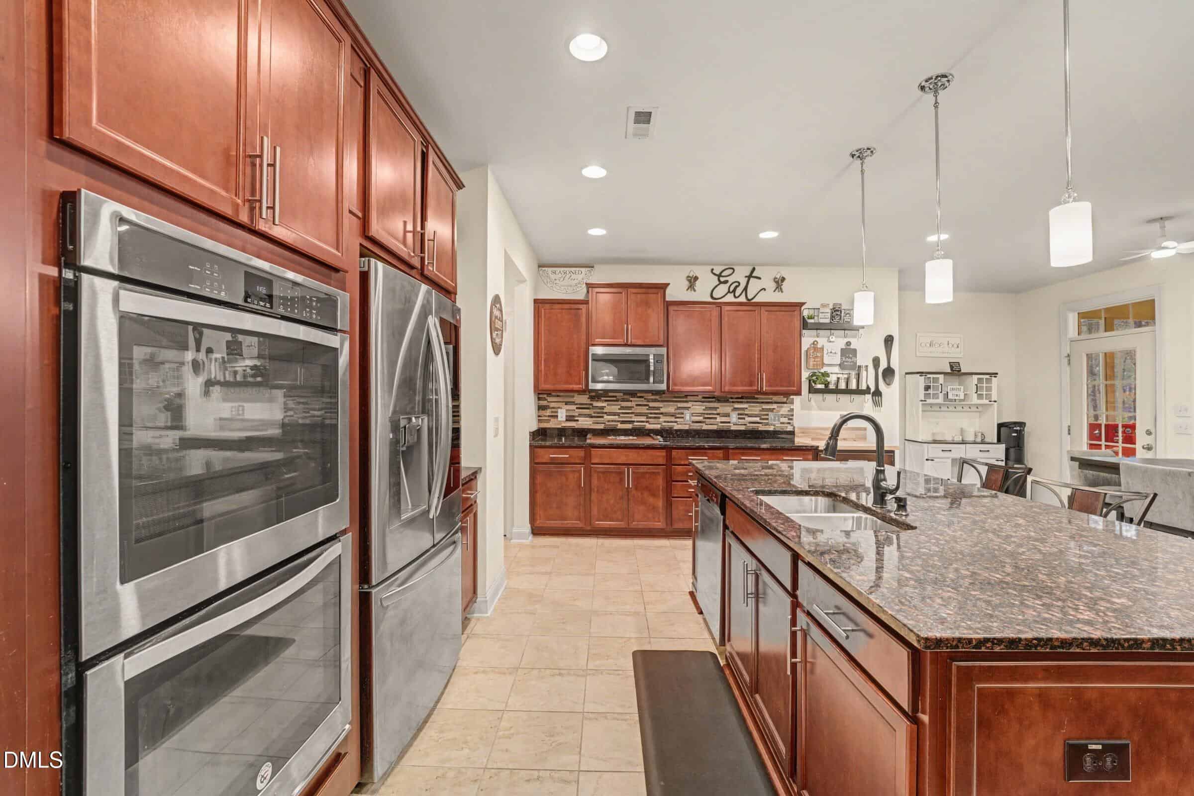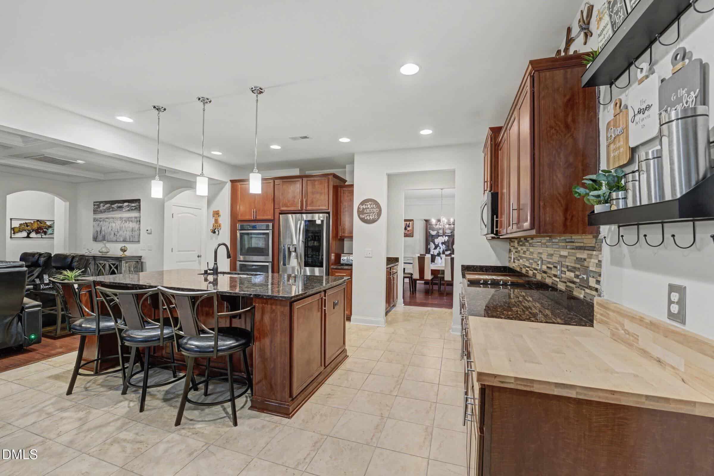 Walk into your GRAND FOYER with CHERRYWOOD stairs and WROUGHT IRON railing which leads to a formal living room and elegant dining room with WAINSCOTING detail. The GOURMET (eat-in) CHEF’S KITCHEN features a double oven, walk-in pantry, butler’s pantry, 8′ ISLAND and GRANITE COUNTER TOPS throughout, which opens to a spacious Family Room with COFFERED CEILING, bay windows, gas fireplace and built-in bookshelves.