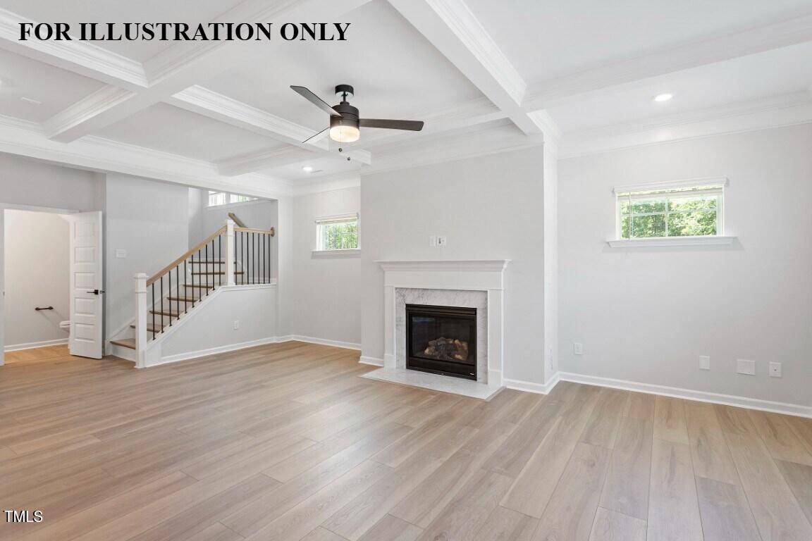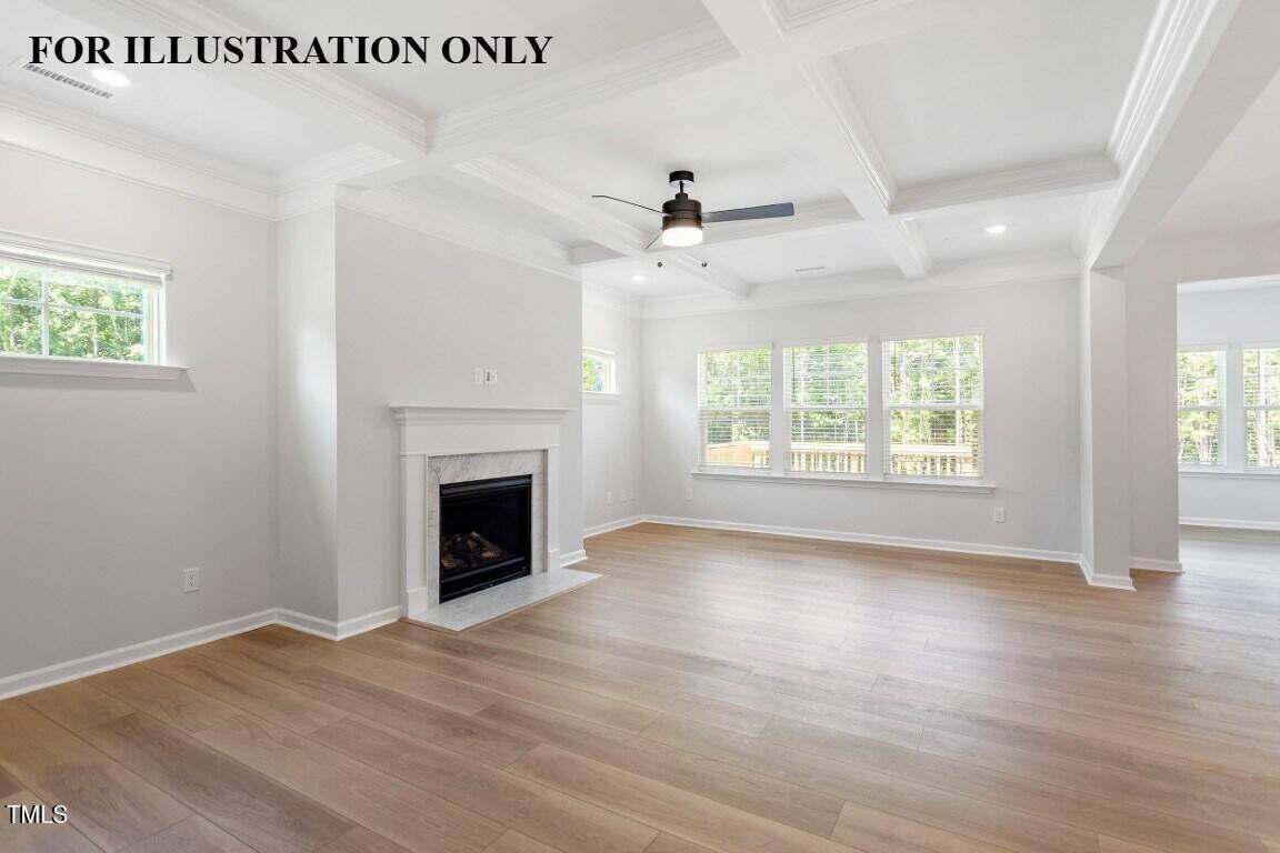 The great room features a coffered ceiling and crown molding, and opens directly into the sunroom, where expansive windows offer serene, private views of mature trees and natural light throughout.