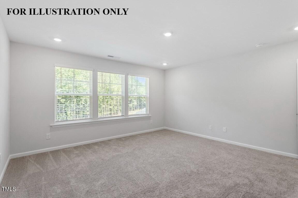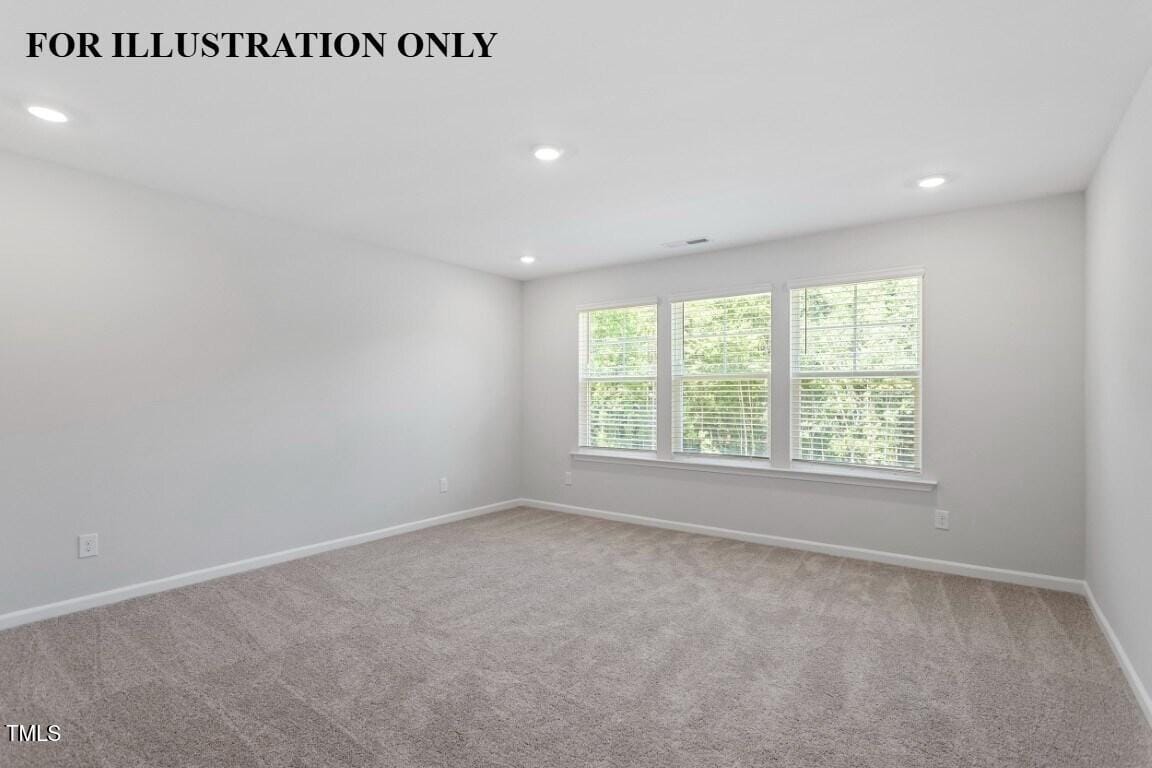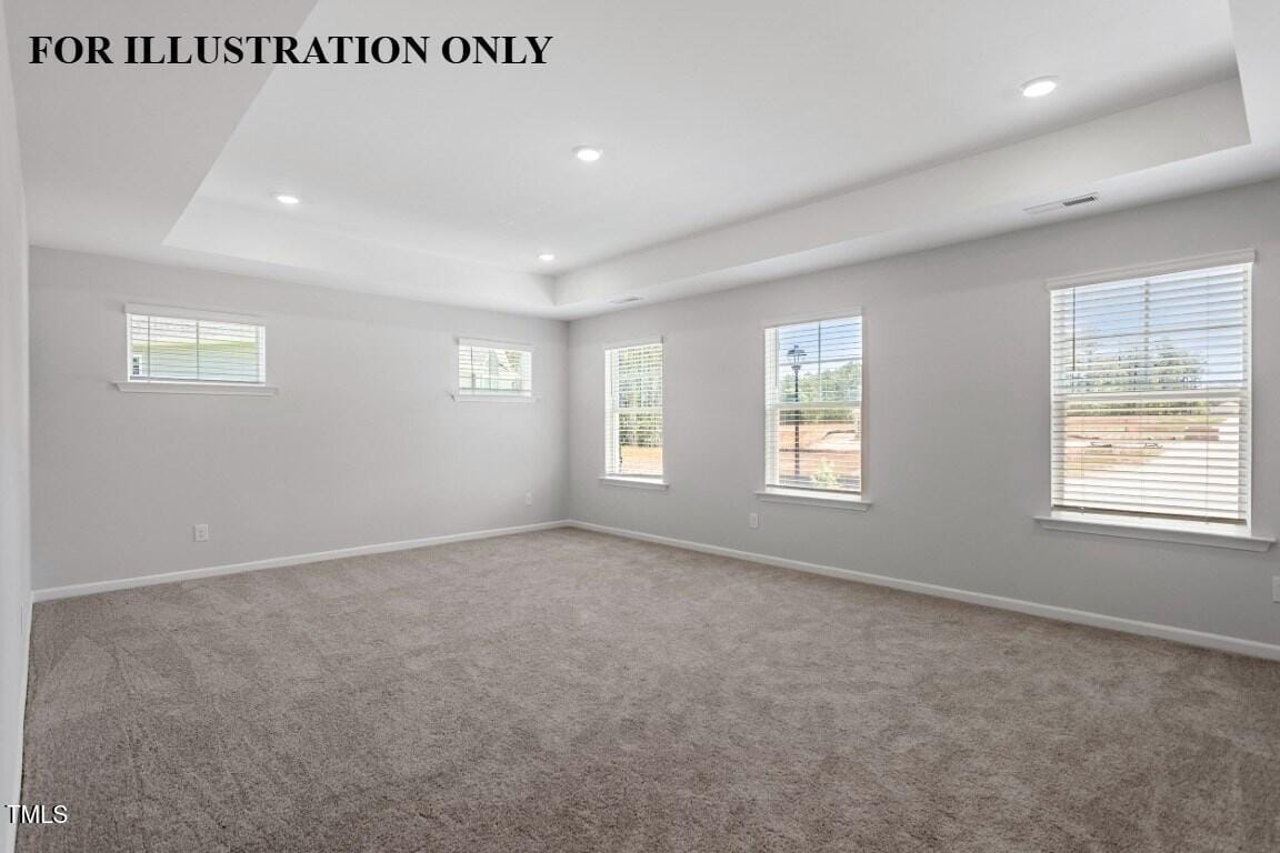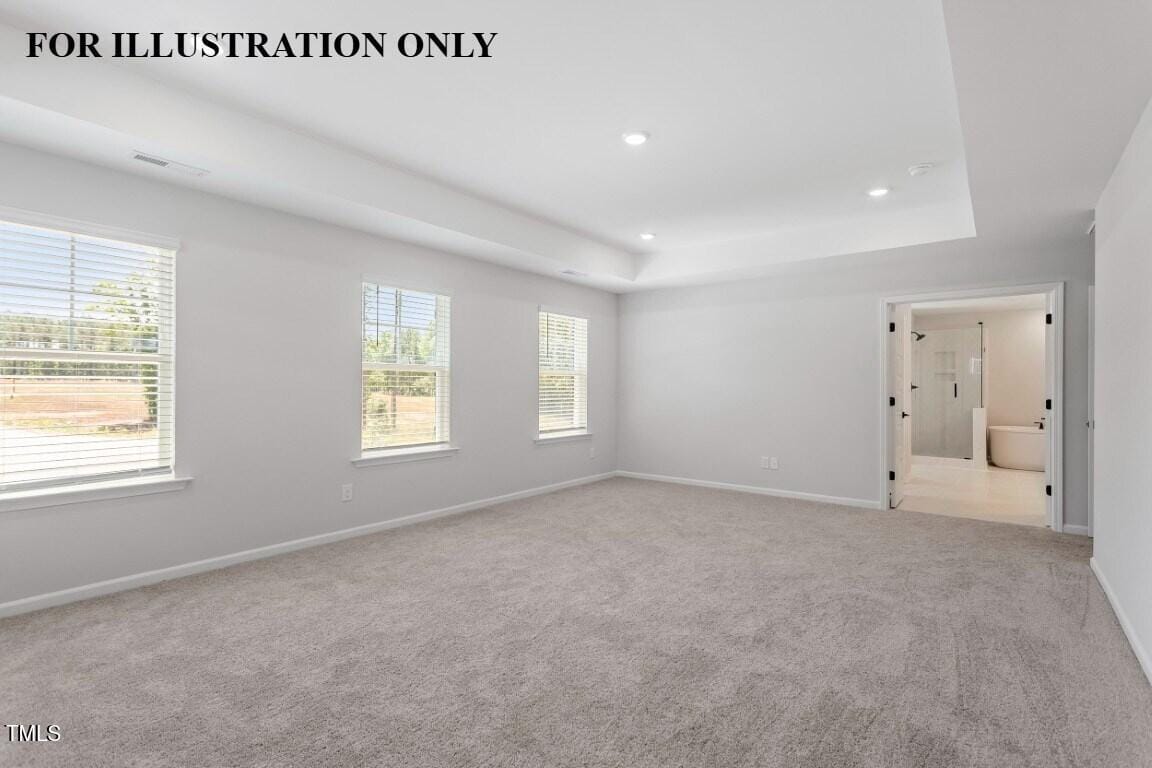 Upstairs, the primary suite is a true retreat—featuring a tray ceiling with crown, plush carpeting, ceiling fan, and multiple windows. The spa-like bath includes a tiled walk-in shower with a sitting ledge, dual quartz vanities, his-and-hers walk-in closets, and two linen closets for exceptional storage.