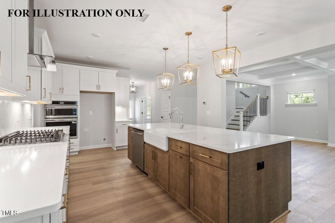The gourmet kitchen is a true centerpiece, showcasing upgraded Brellin PureStyle Greyhound full-overlay soft-close cabinetry, a 5-burner gas cooktop, built-in oven with convection microwave, concealed-control stainless steel dishwasher, and Miami Oro quartz countertops. Finishes include a stunning Mesmerist Hexagon tile backsplash, pendant lighting, a large island with seating, and elegant crown molding.