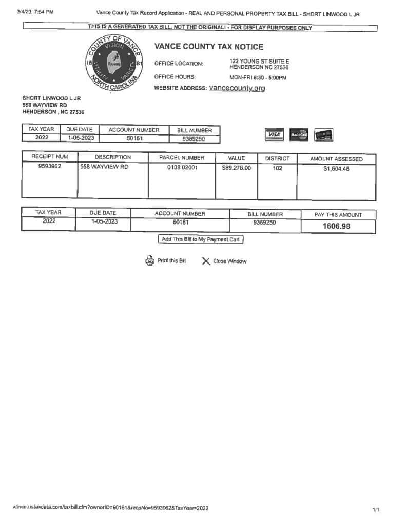 558 Wayview Road shows a higher cost / sq ft ($175) compared with Vance County median ($143.50), which may be tied to the property’s outdoor amenities and recent repairs.