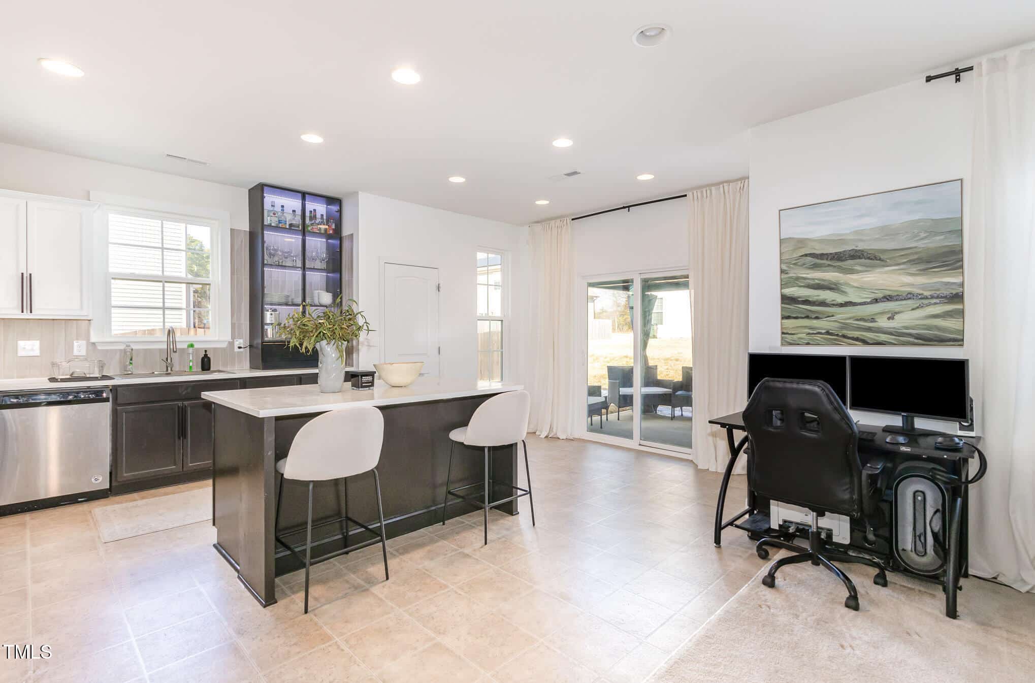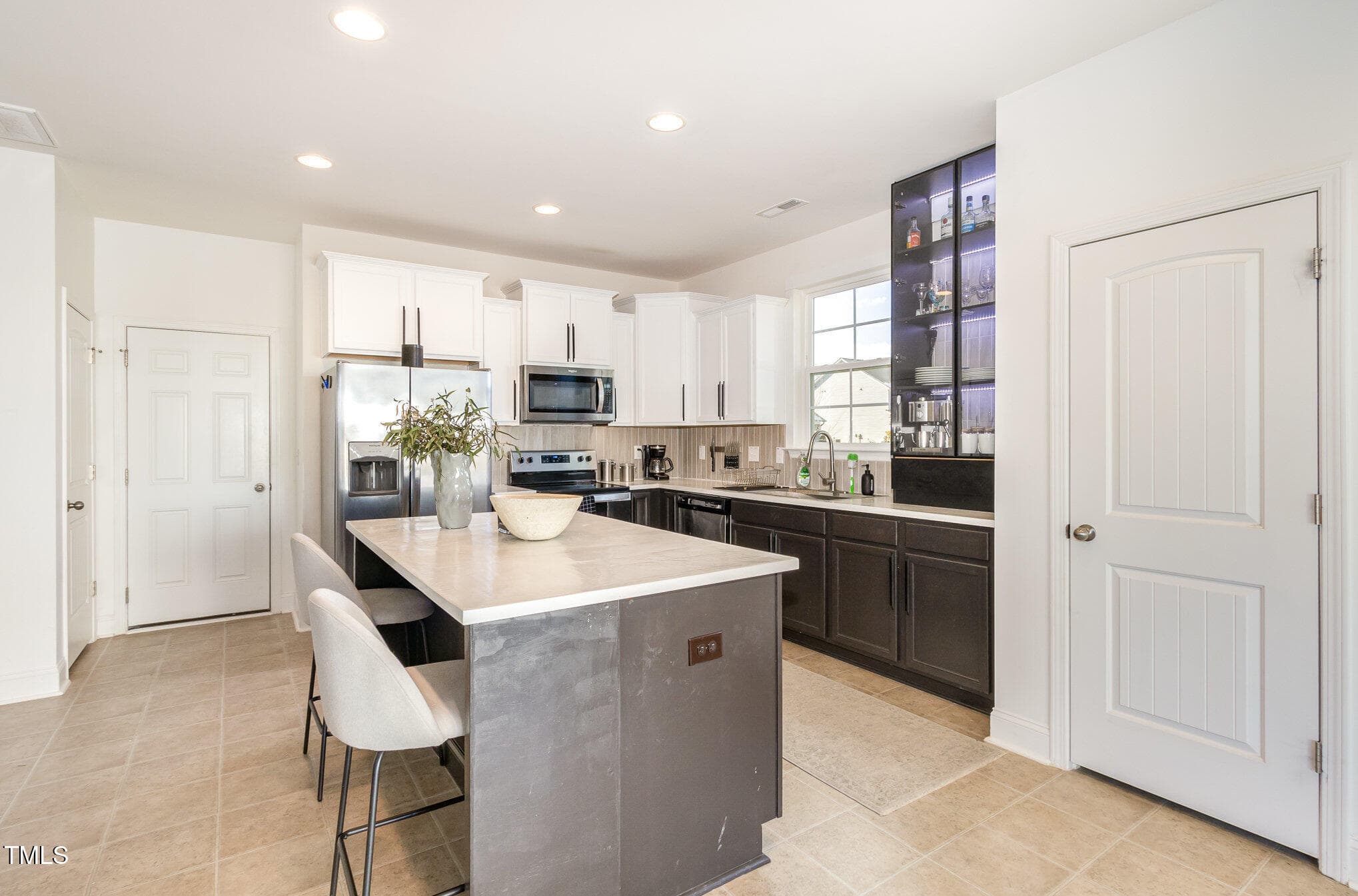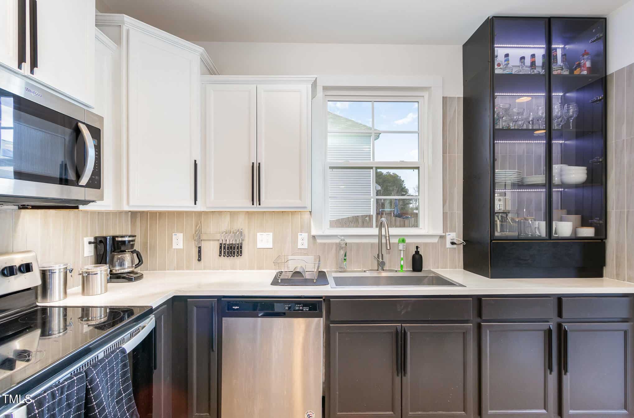 The open-concept living area features a gorgeous, custom black-finished, whole wall built-in, adding an elegant and sophisticated touch. The updated kitchen is designed for both function and style, with sleek and durable concrete countertops, custom backsplash and premium finishes. Stainless steel appliances and a glass front LED cabinet enhance the home’s modern appeal.