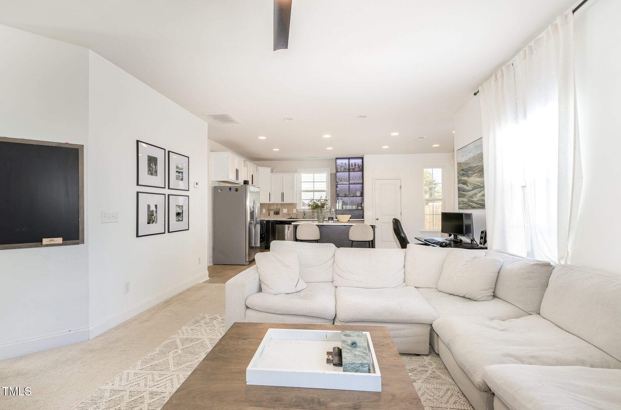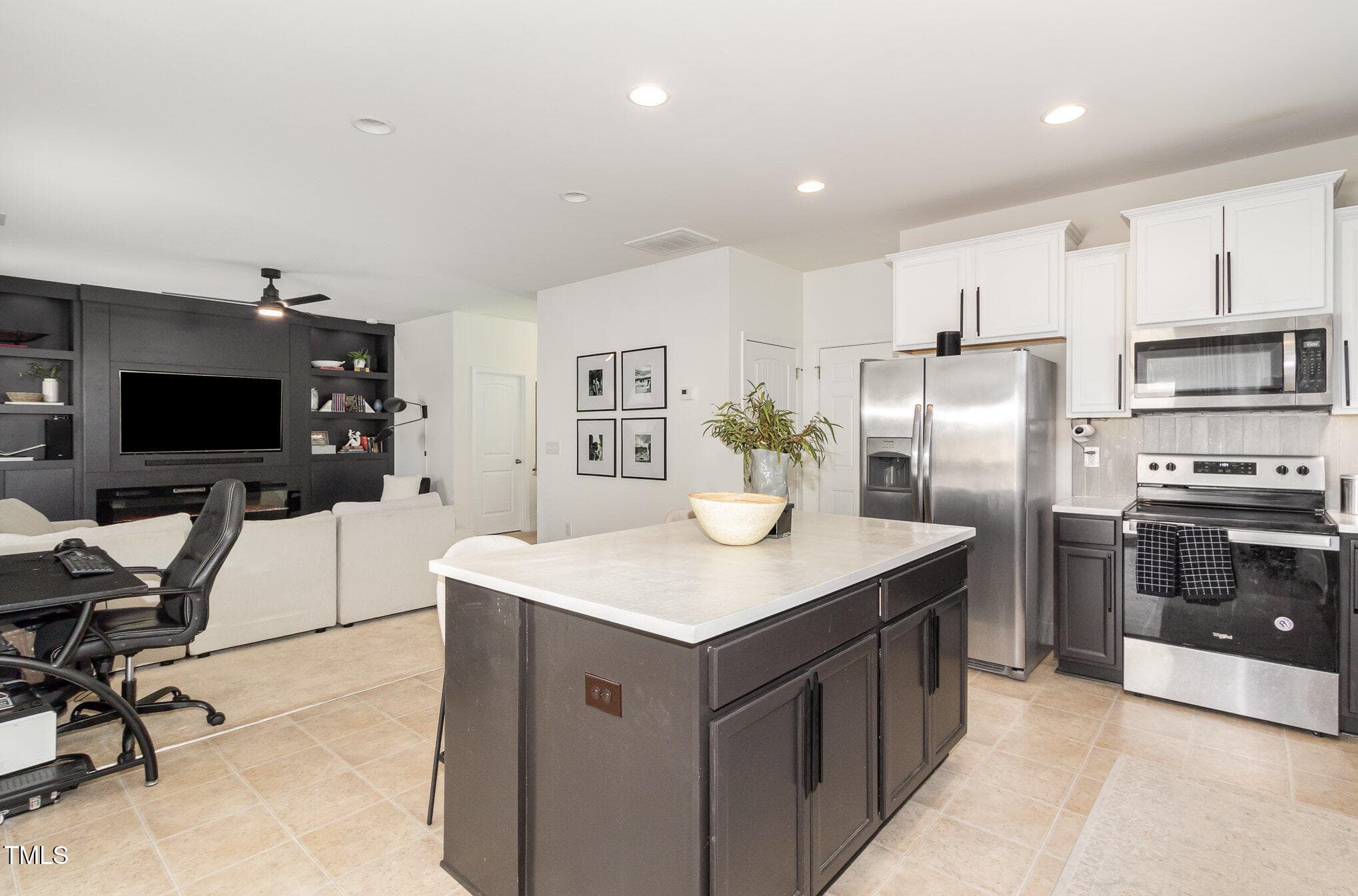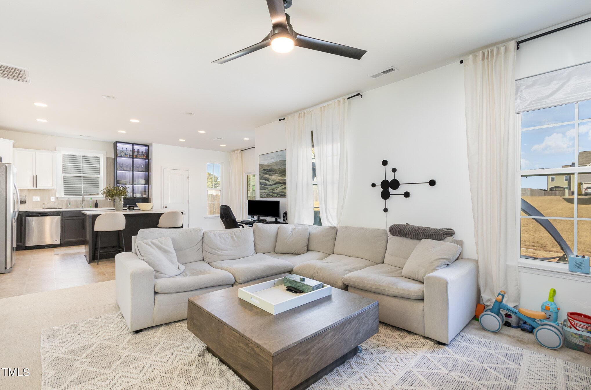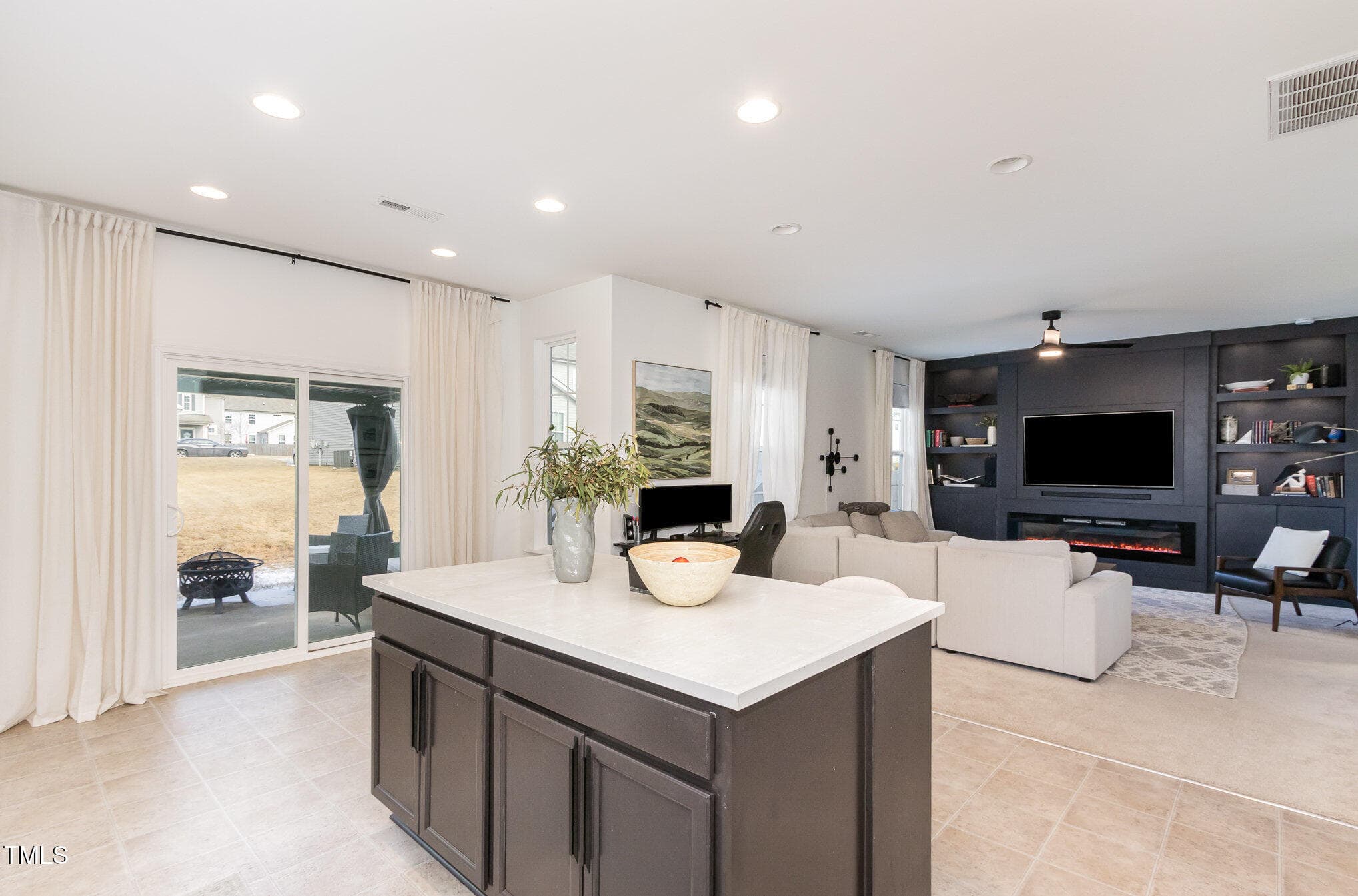 The open-concept living area features a gorgeous, custom black-finished, whole wall built-in, adding an elegant and sophisticated touch. The updated kitchen is designed for both function and style, with sleek and durable concrete countertops, custom backsplash and premium finishes. Stainless steel appliances and a glass front LED cabinet enhance the home’s modern appeal.