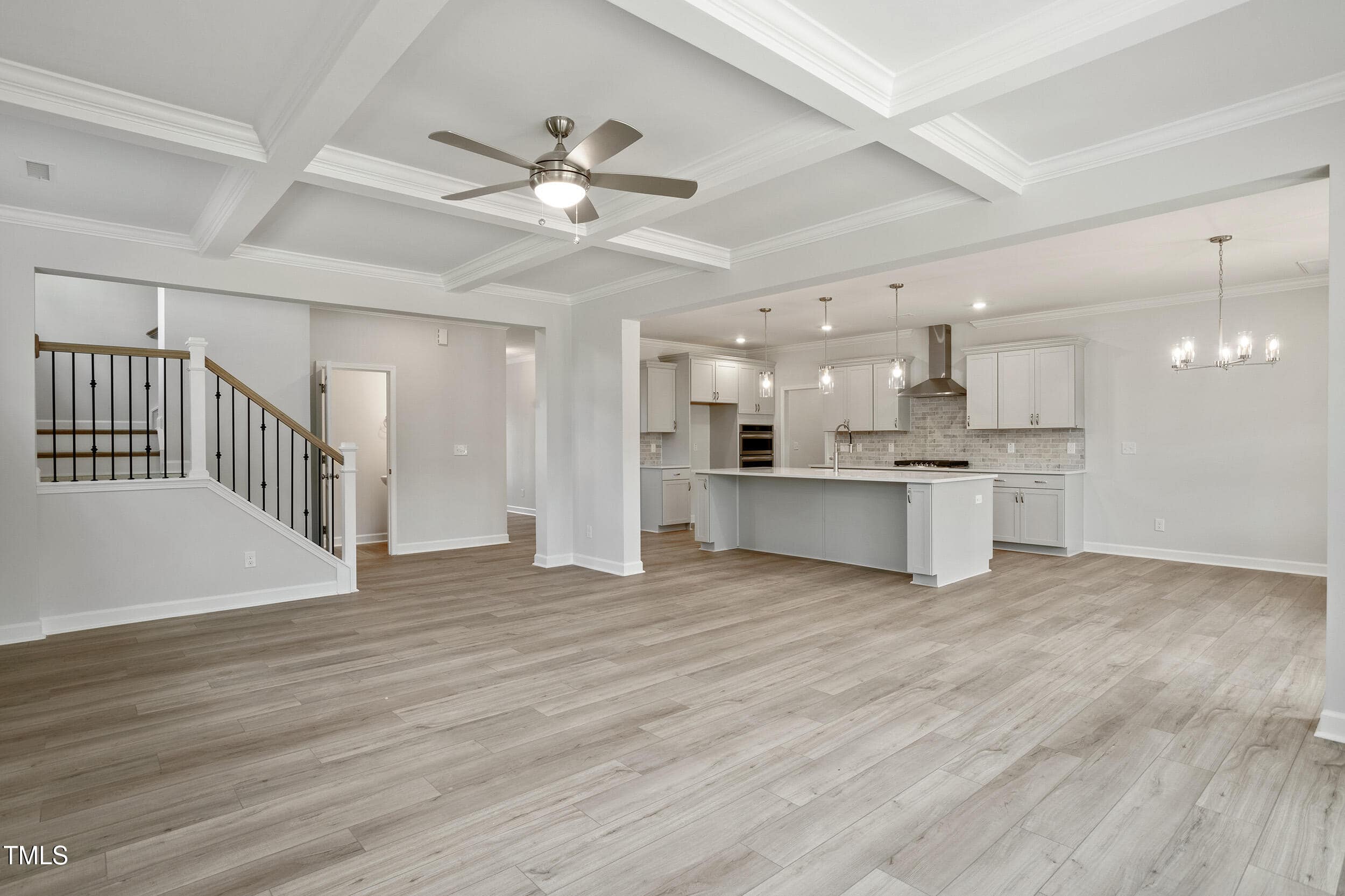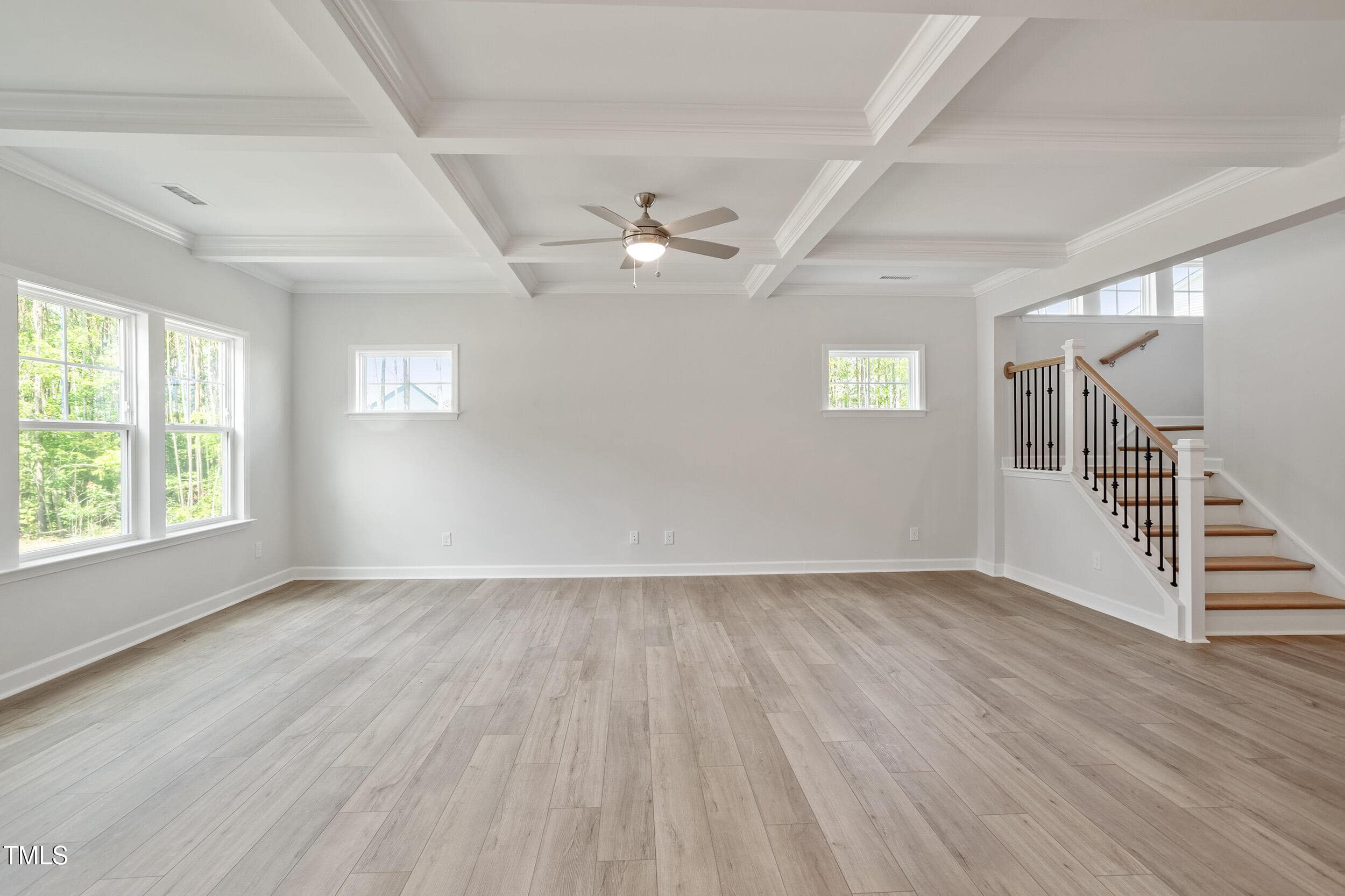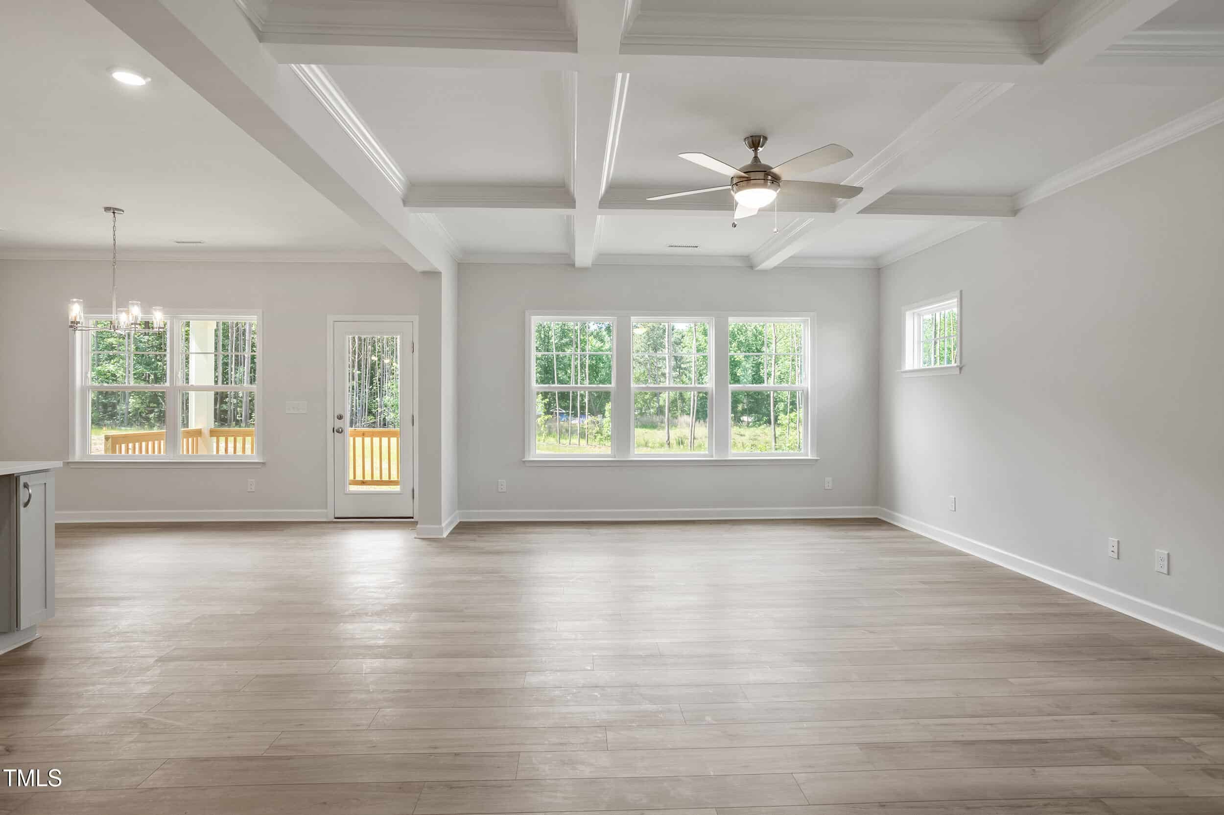Great Room: w/Coffered Ceiling, Crown Molding, Ceiling Fan & Abundant Natural Light!