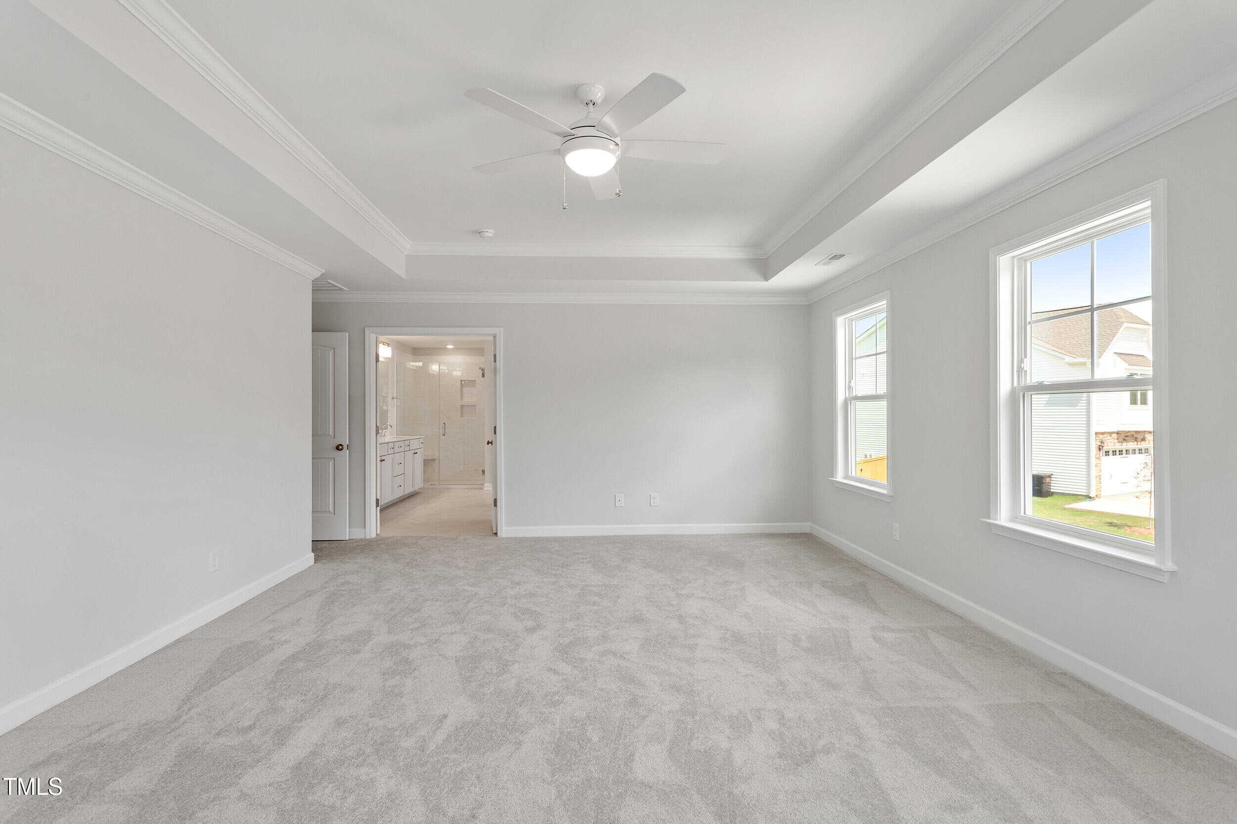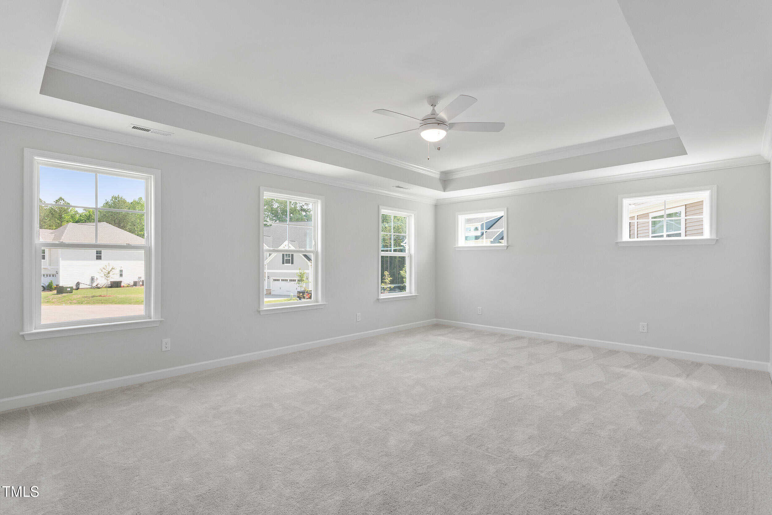 Primary Bed: Tray Ceiling w/Crown, Plush Carpet, Lots of Windows & Ceiling Fan!