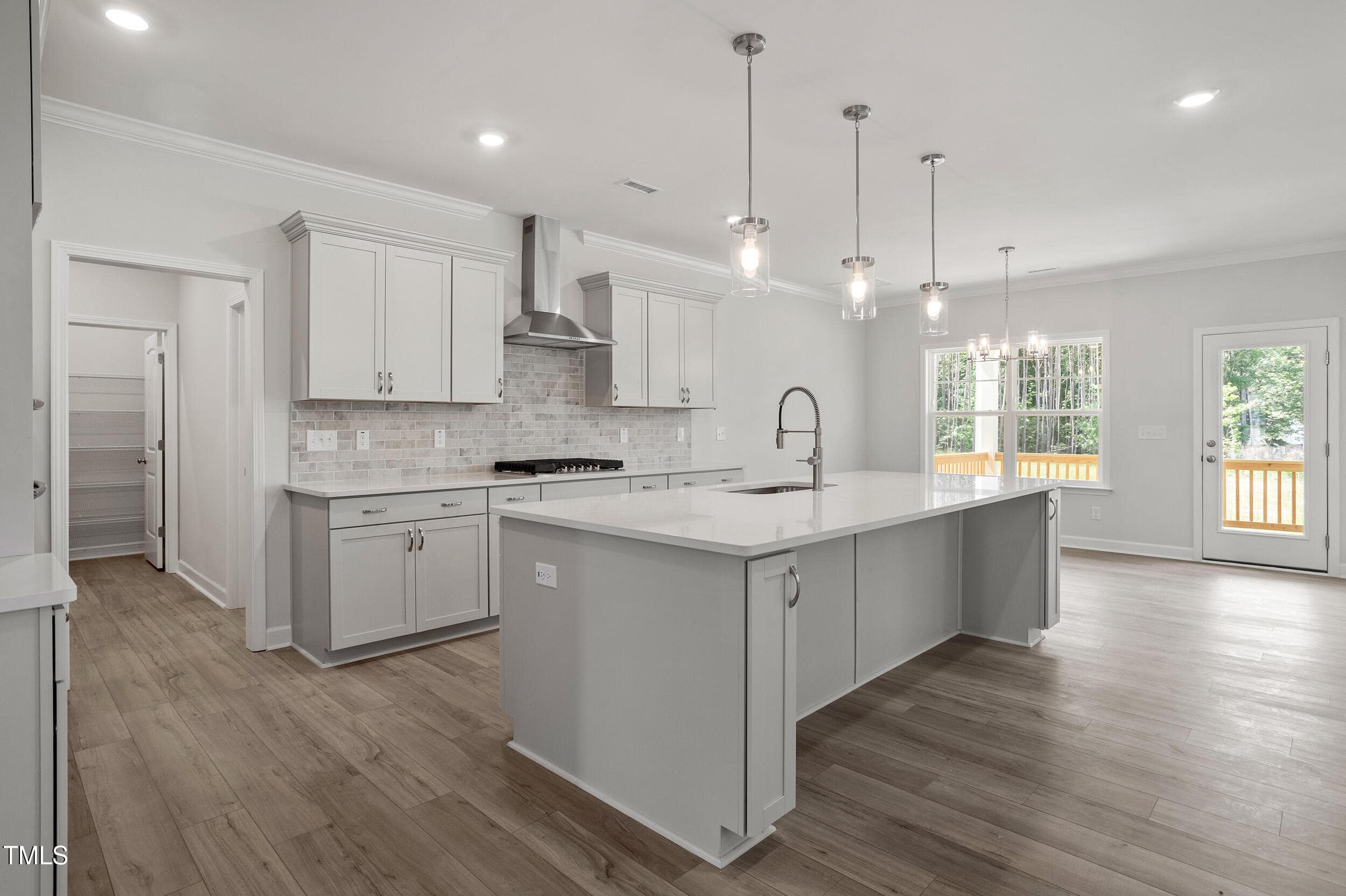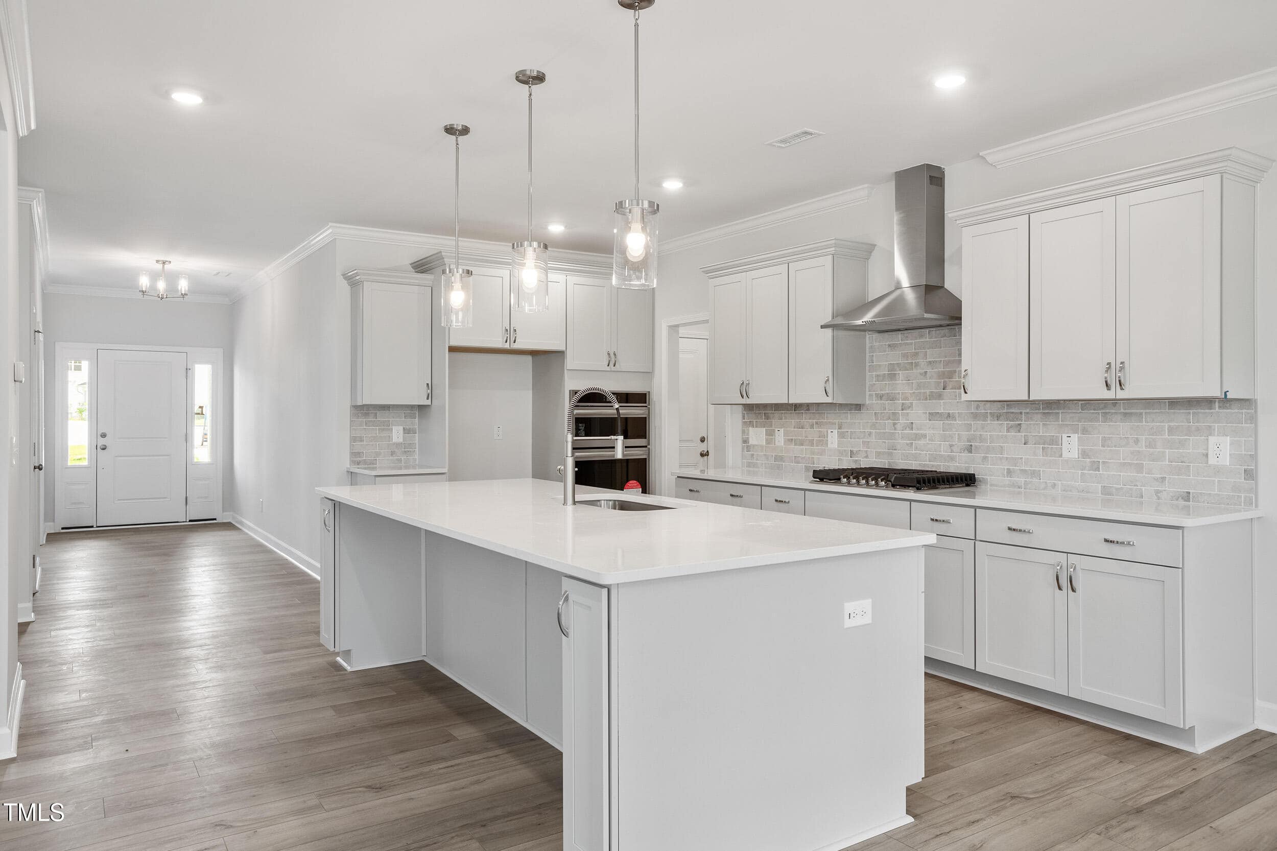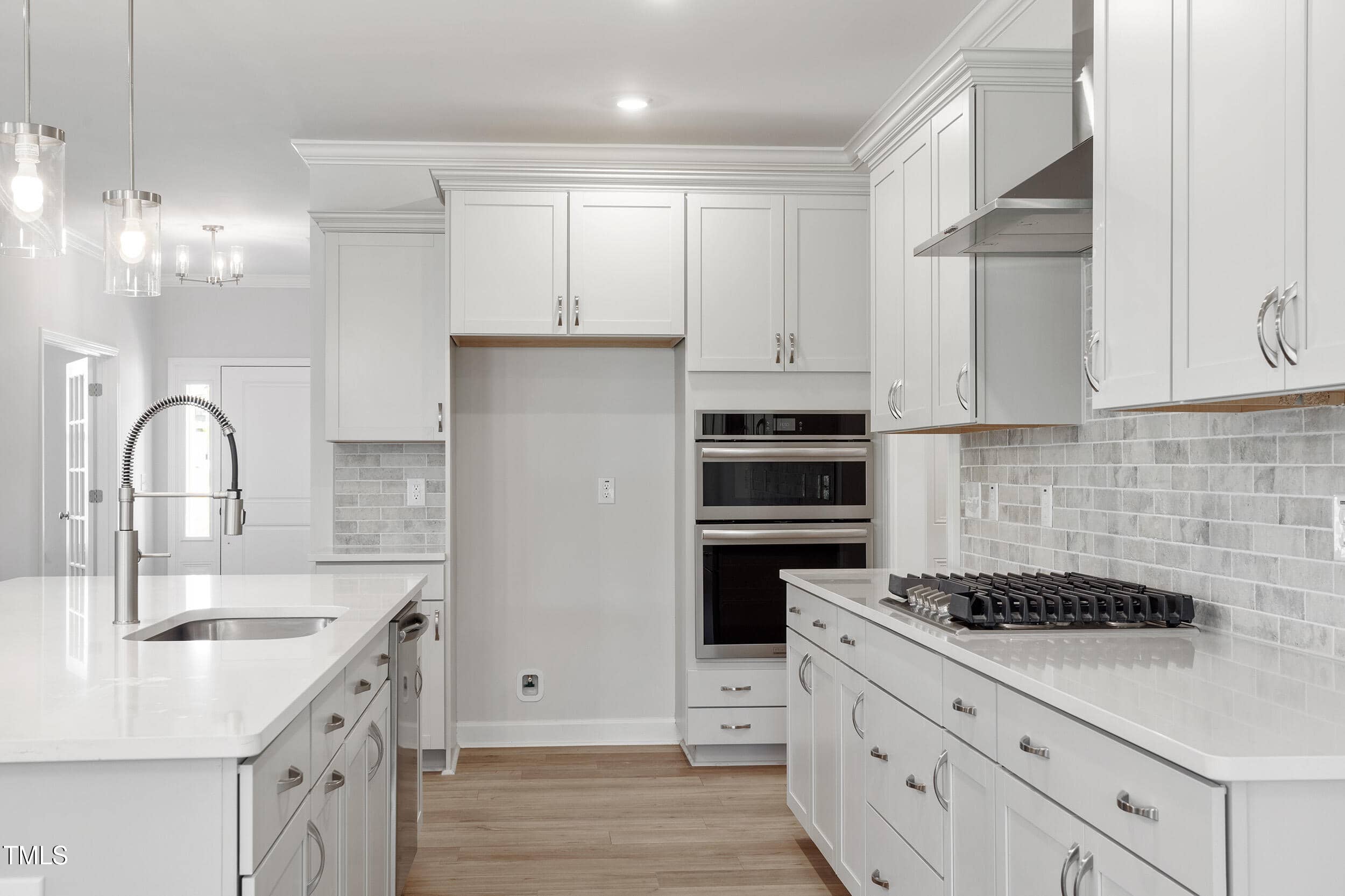 Kitchen: Gas Cooktop & Built-in Oven/Microwave Combo, Custom Cabinets w/Soft Close Feature, Huge Island, ”Miami Vena” Quartz Countertops, Tile Backsplash, Crown Molding & Pendant Lights!