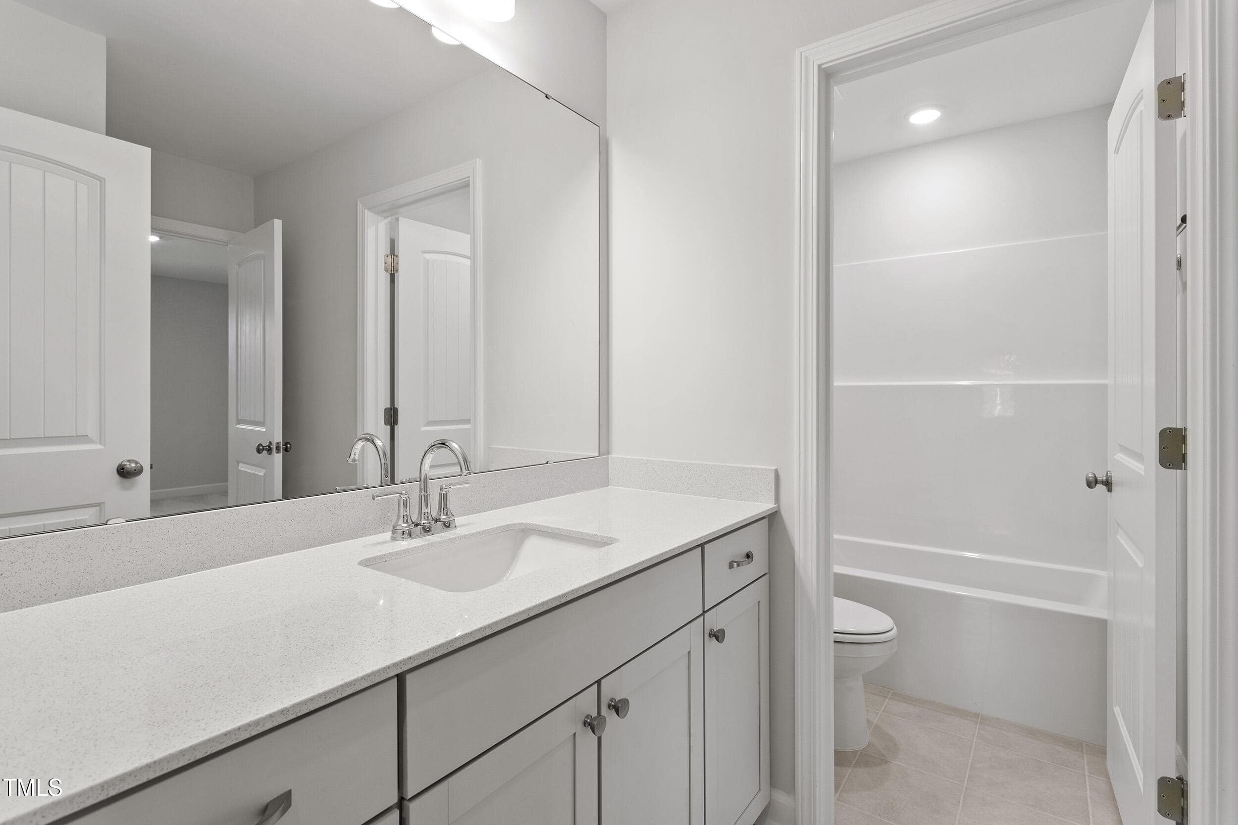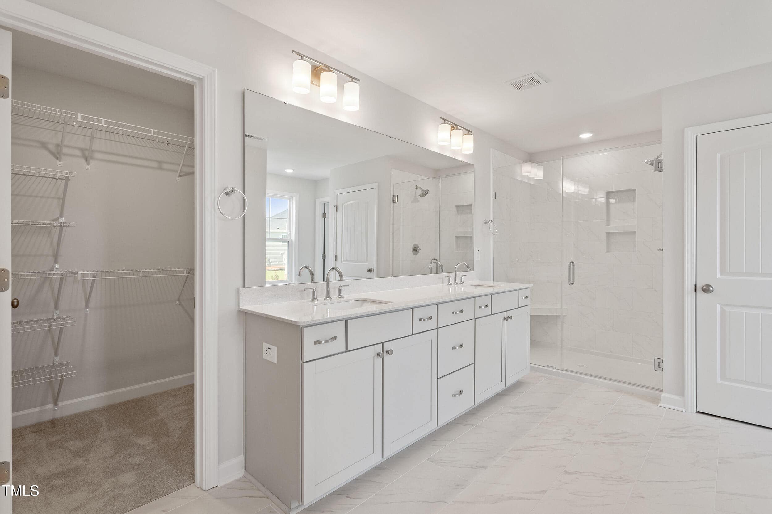 Primary Bath: 5′ Tiled Shower w/Frameless Glass Door, Tile Floor, Quartz Countertops, Dual Walk in Closets & Two Linen Closets!