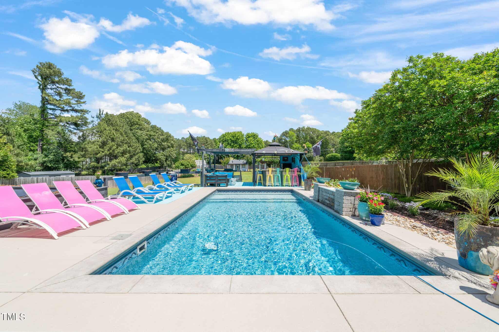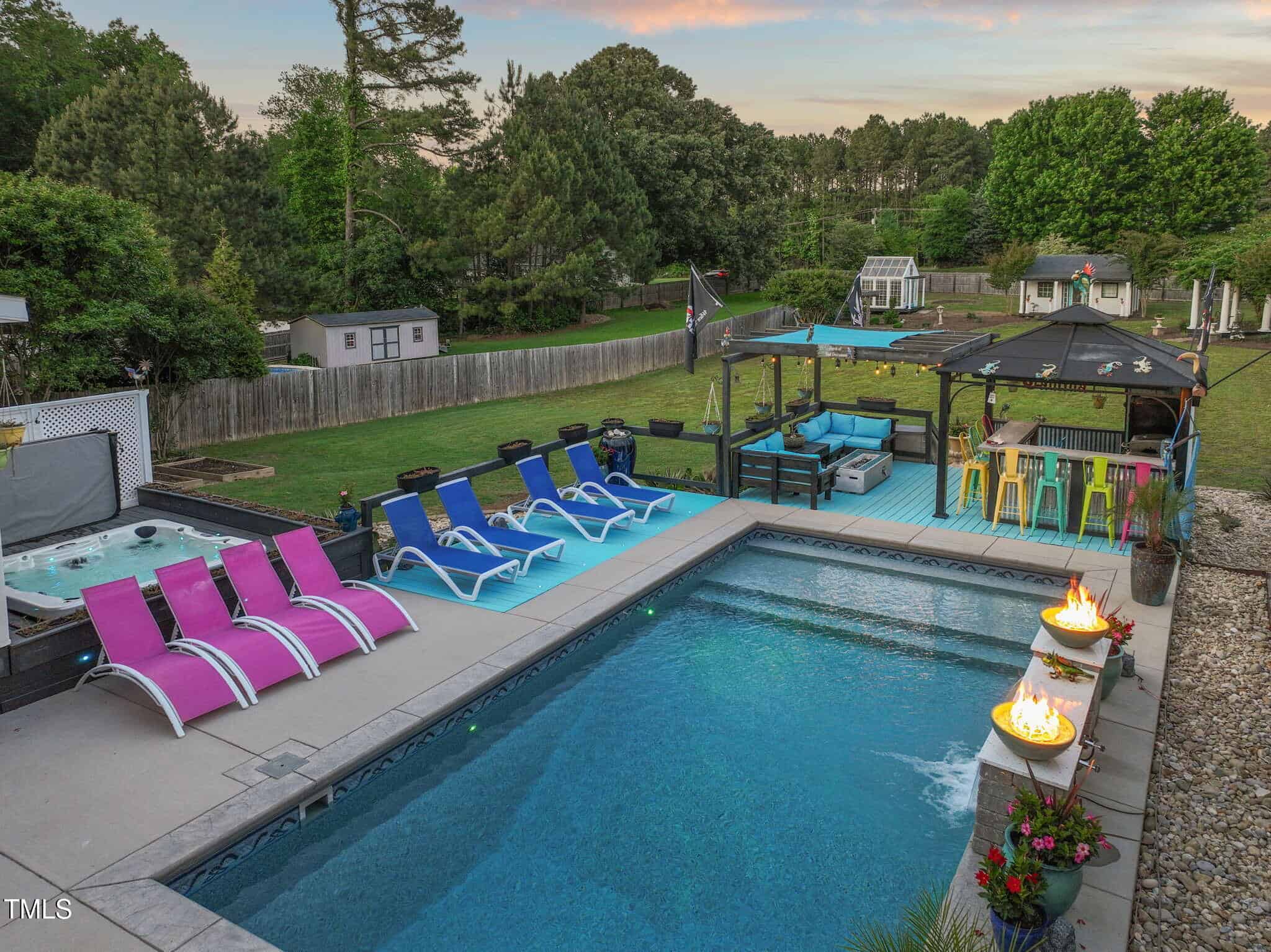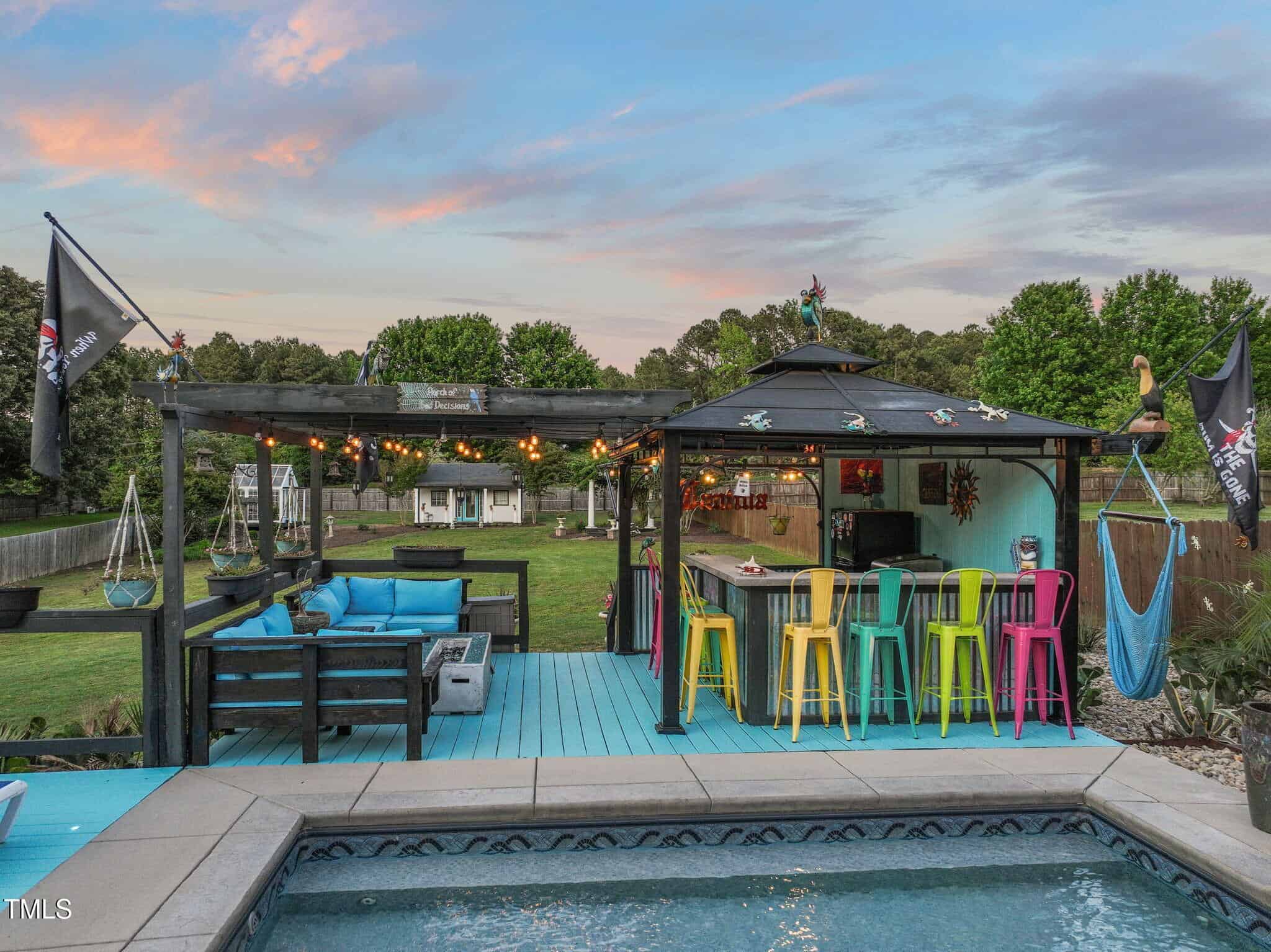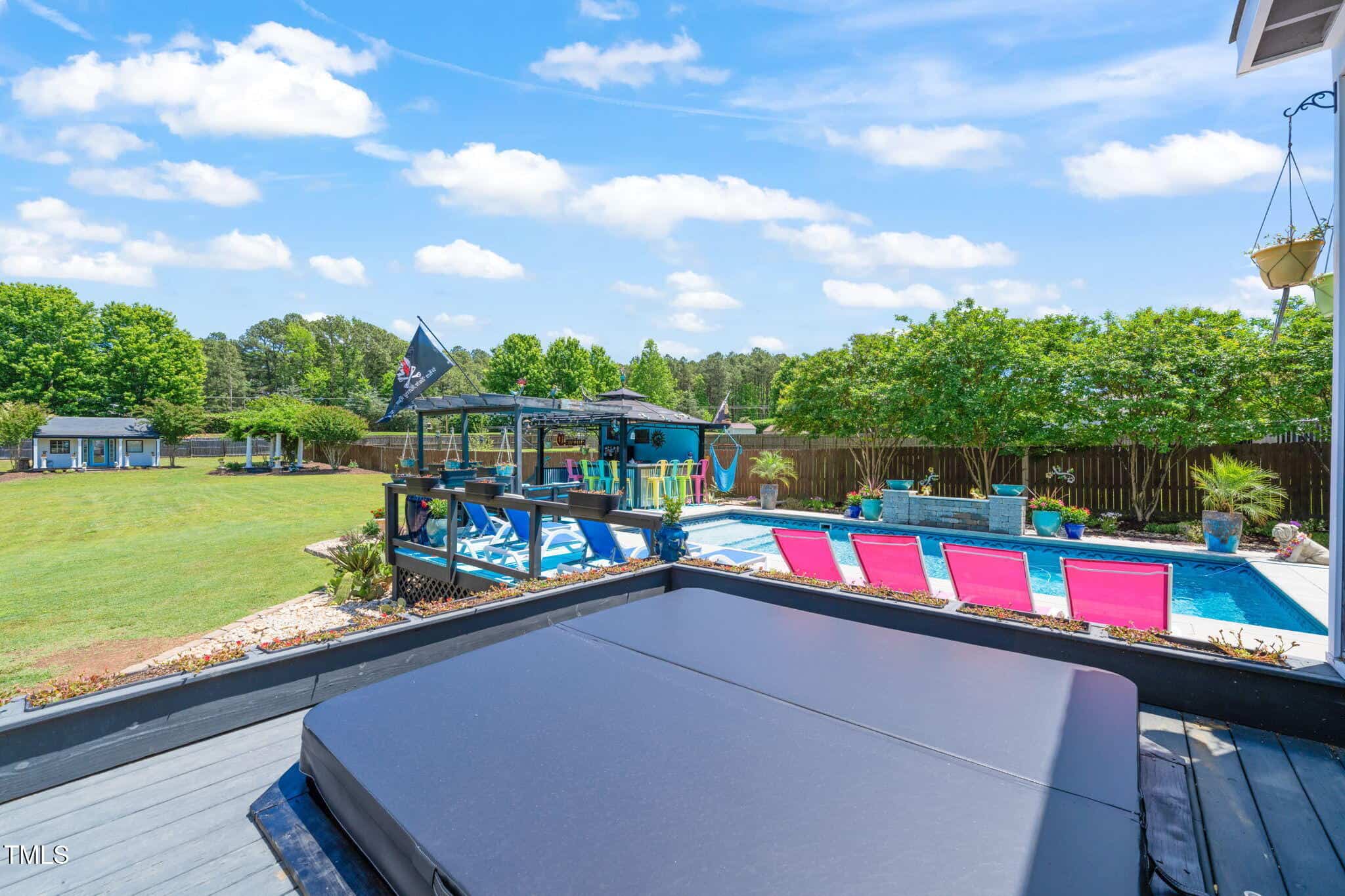 Backyard Oasis with In-Ground Pool, Hot Tub & Tiki Bar – 60 Consella Way, Franklinton, NC. Welcome to your private retreat in the sought-after Windsor Estates community! This beautifully maintained 4-bedroom, 2.5-bathroom, 2353 sf home offers the perfect blend of indoor comfort and resort-style outdoor living on a spacious 0.79 acre lot.