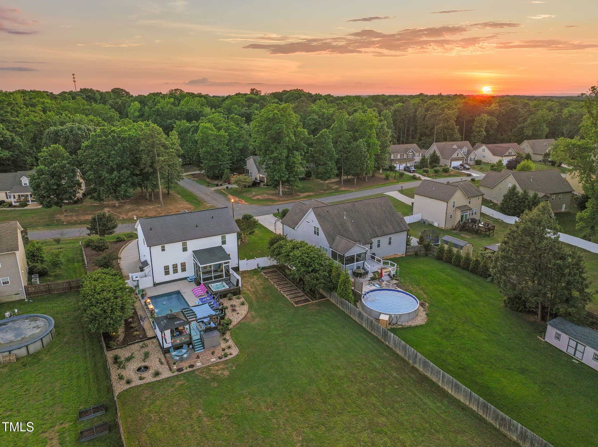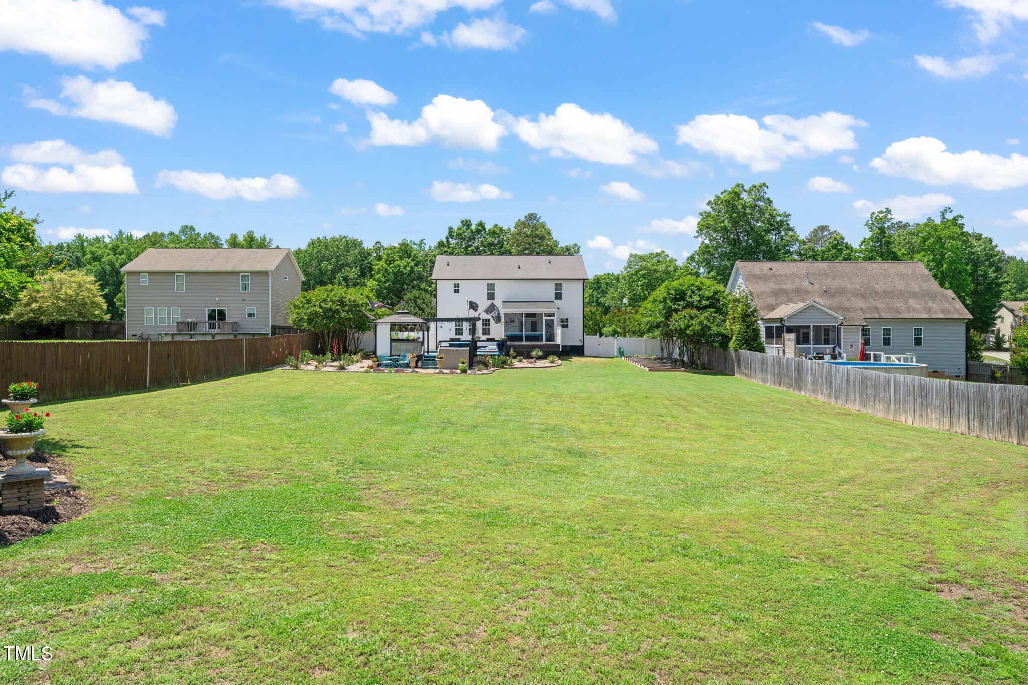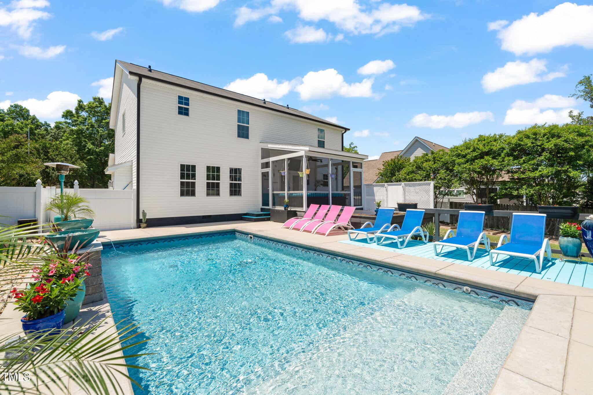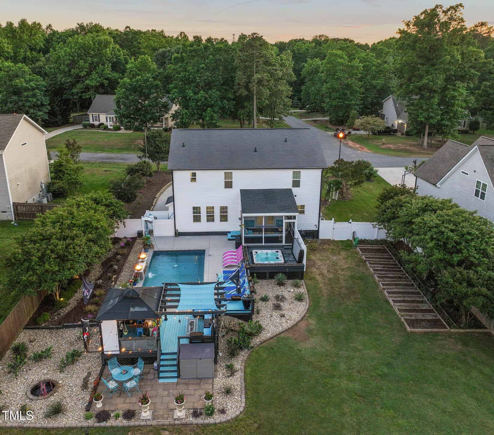 Backyard Oasis with In-Ground Pool, Hot Tub & Tiki Bar – 60 Consella Way, Franklinton, NC. Welcome to your private retreat in the sought-after Windsor Estates community! This beautifully maintained 4-bedroom, 2.5-bathroom, 2353 sf home offers the perfect blend of indoor comfort and resort-style outdoor living on a spacious 0.79 acre lot. Step outside into a backyard paradise featuring a custom in-ground pool, relaxing hot tub, and a fully equipped tiki bar—ideal for summer entertaining or quiet evenings under the stars. Green thumbs will love the irrigated garden beds and greenhouse, offering year-round opportunities for growing fresh produce and flowers. And one bonus with the high costs of eggs, you can raise your own chickens! Inside, the open-concept layout includes remote home office, a stylish kitchen with granite countertops, new stainless steel appliances, custom butler pantry, and a center island that flows into the spacious living area with a cozy gas fireplace and custom built-in shelves. Upstairs, enjoy spacious primary suite and 3 additional bedrooms, fully upgraded bathrooms, and upgraded recess lighting; fresh interior paint. With its vibrant outdoor amenities and thoughtfully updated interior, this home truly offers the best of both worlds. Located just minutes from downtown Franklinton and Youngsville, with easy access to Wake Forest and Raleigh. Don’t miss this rare backyard oasis—schedule your private showing today!