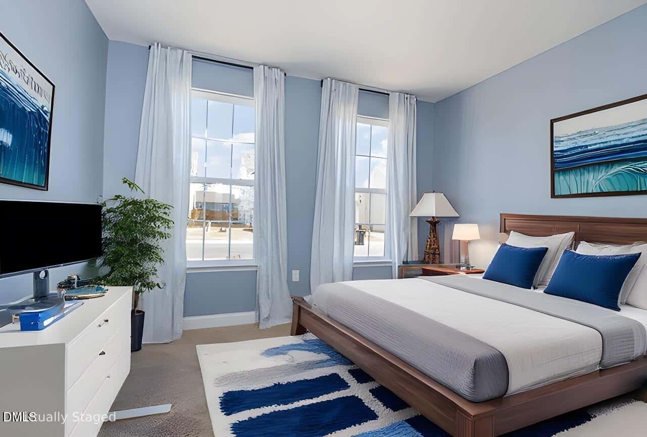 On the main level, you’ll find a flexible bedroom that can serve as a guest room, home office, or additional living space, accommodating a variety of needs. The living room, with its high ceilings and large windows, overlooks a well-maintained backyard, offering a comfortable space for relaxation or entertaining.