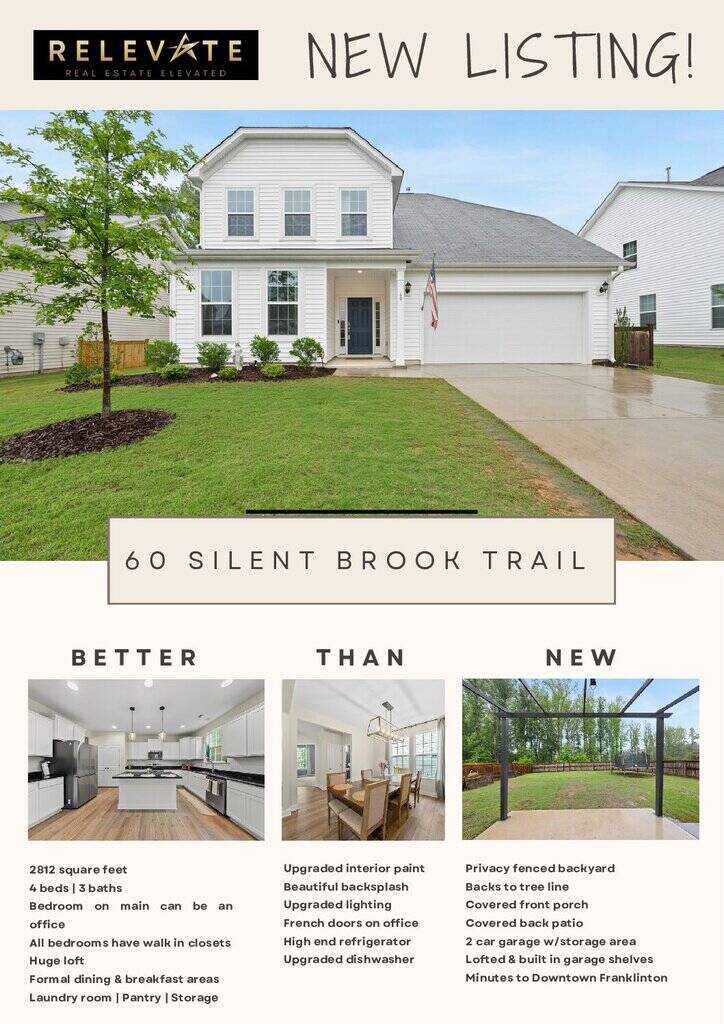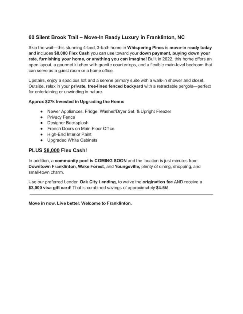 SELLER IS OFFERING FLEX CASH FOR THE BUYER OF THIS BEAUTIFUL HOME! Buy down the interest rate, use for closing costs or whatever your heart desires. See document in attachments for details. Located in the welcoming Whispering Pines neighborhood of Franklinton, 60 Silent Brook Trail is a well-designed, move-in-ready home that offers comfort, functionality, LOTS of natural light and LARGE SPACES. This home lives like new, built in 2022, and provides a practical layout for everyday living, ideal for families or those seeking a modern, low-maintenance home. The home features an open floor plan with a bright and airy feel. The kitchen is equipped with granite countertops, tile backsplash, a large island, a walk-in pantry, and stainless steel appliances, making meal prep and storage a dream. It connects seamlessly to a bright breakfast nook and a formal dining area, suitable for both casual meals and larger gatherings. On the main level, you’ll find a flexible bedroom that can serve as a guest room, home office, or additional living space, accommodating a variety of needs. The living room, with its high ceilings and large windows, overlooks a well-maintained backyard, offering a comfortable space for relaxation or entertaining. Upstairs, where all carpets have just been professionally cleaned, you’ll find a versatile loft area, perfect for a playroom, media space, or extra lounge area. The primary bedroom features a dual-sink vanity, a walk-in shower, and a spacious walk-in closet. Additional bedrooms are well-sized, with walk in closets and easy access to a shared bathroom. All systems have been maintained on a prepaid Weathermaster service plan, so the new owners get continued service for a year, paid for by the sellers. The fenced backyard offers a private, low-maintenance space for outdoor activities or quiet evenings. The garage provides extra storage room to meet your needs. Situated in a beautiful, walkable community, with a new pool currently under construction, the home is just a short drive from the quaint downtown areas of Youngsville and Wake Forest, providing easy access to schools, shopping, dining, and recreational options. 60 Silent Brook Trail is a practical, modern home that balances functionality with comfort, ready to meet the needs of its next owners. Don’t miss the list of upgraded features. With all appliances included, you can simply unpack and enjoy!