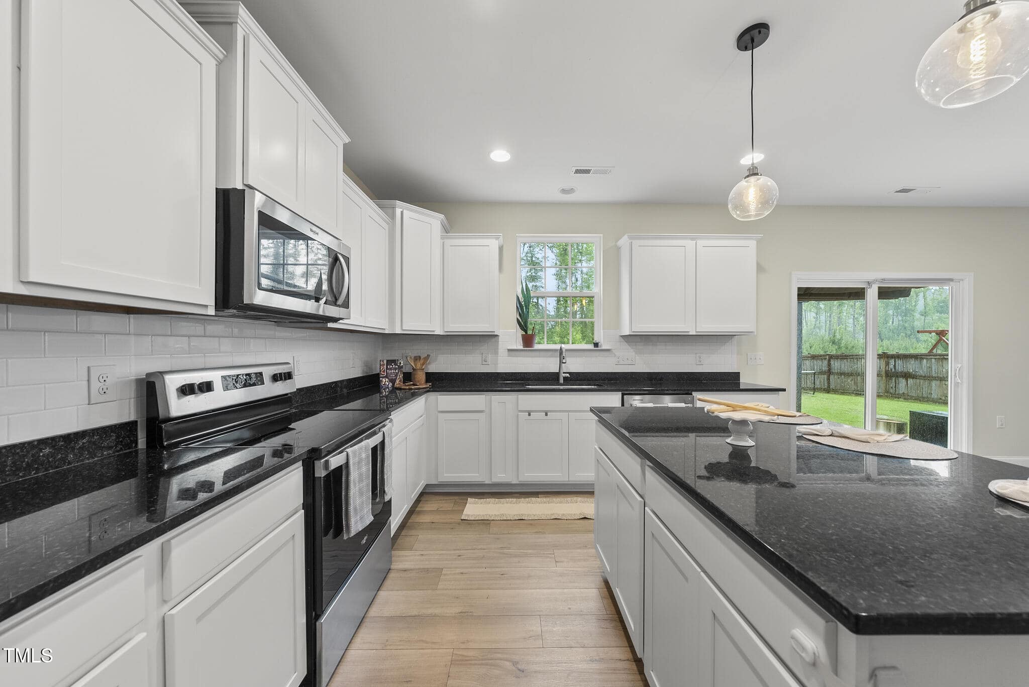 The home features an open floor plan with a bright and airy feel. The kitchen is equipped with granite countertops, tile backsplash, a large island, a walk-in pantry, and stainless steel appliances, making meal prep and storage a dream. It connects seamlessly to a bright breakfast nook and a formal dining area, suitable for both casual meals and larger gatherings.