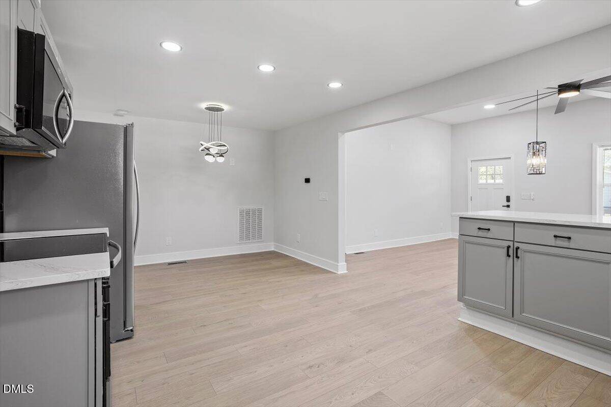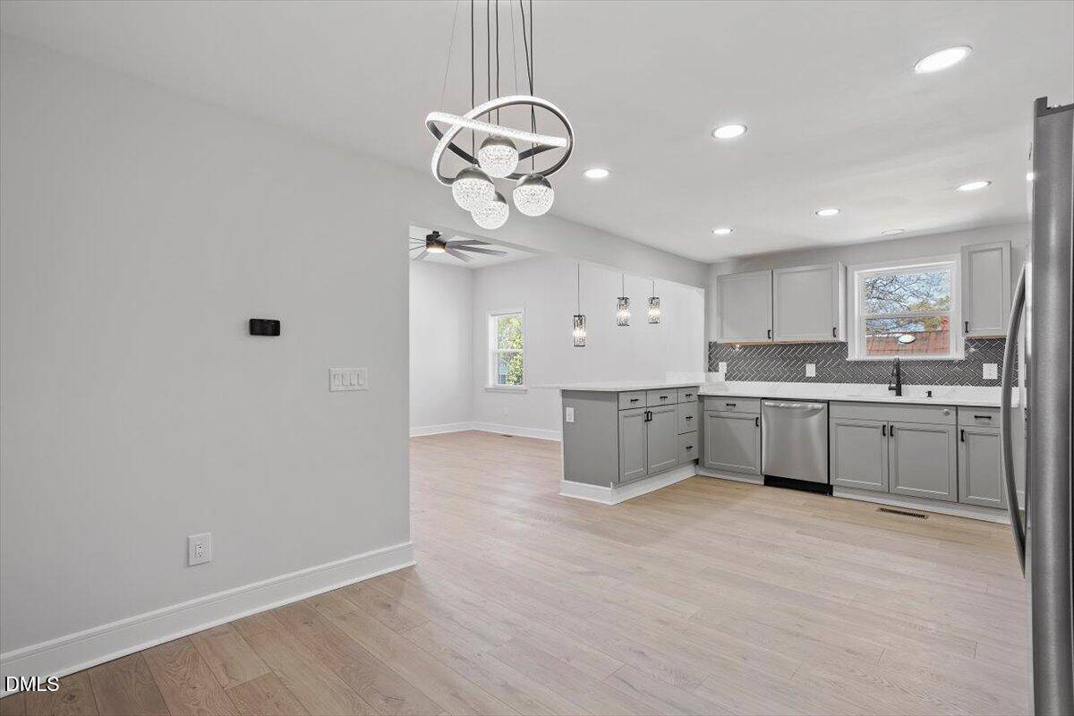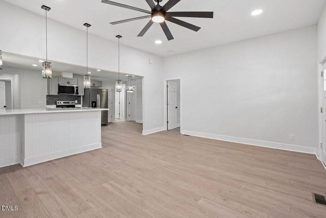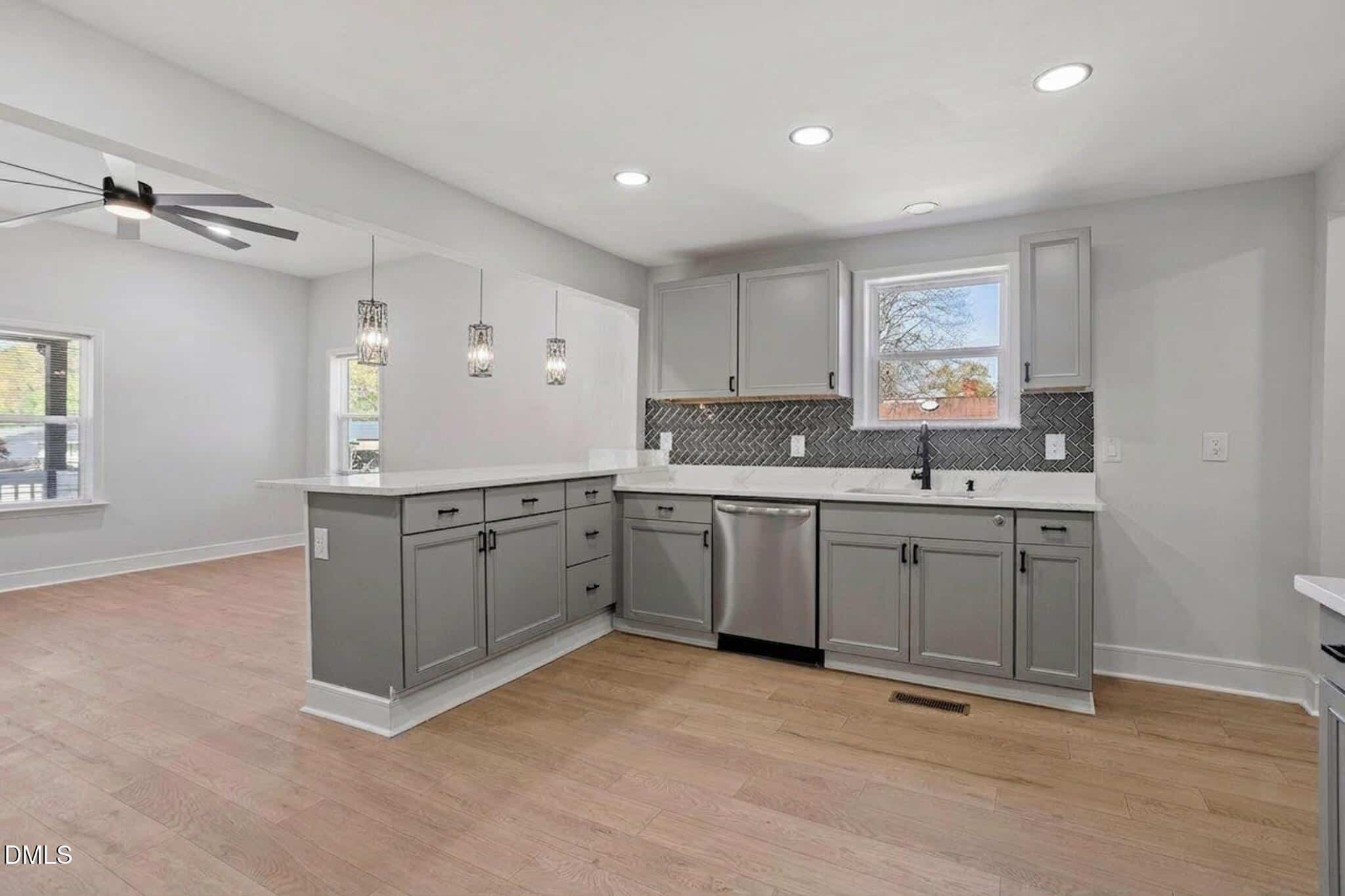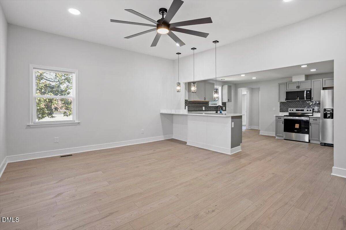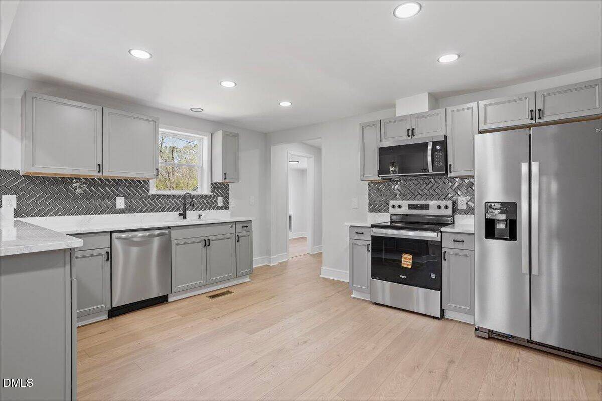 The expansive main living area offers a wealth of natural light that highlights the seamless luxury vinyl plank flooring. The chef-inspired kitchen serves as the home’s focal point, featuring expansive granite countertops, a custom chevron tile backsplash, and a premium suite of brand-new stainless steel appliances. Ample cabinetry and thoughtful prep space make this an ideal environment for both daily living and high-end entertaining.