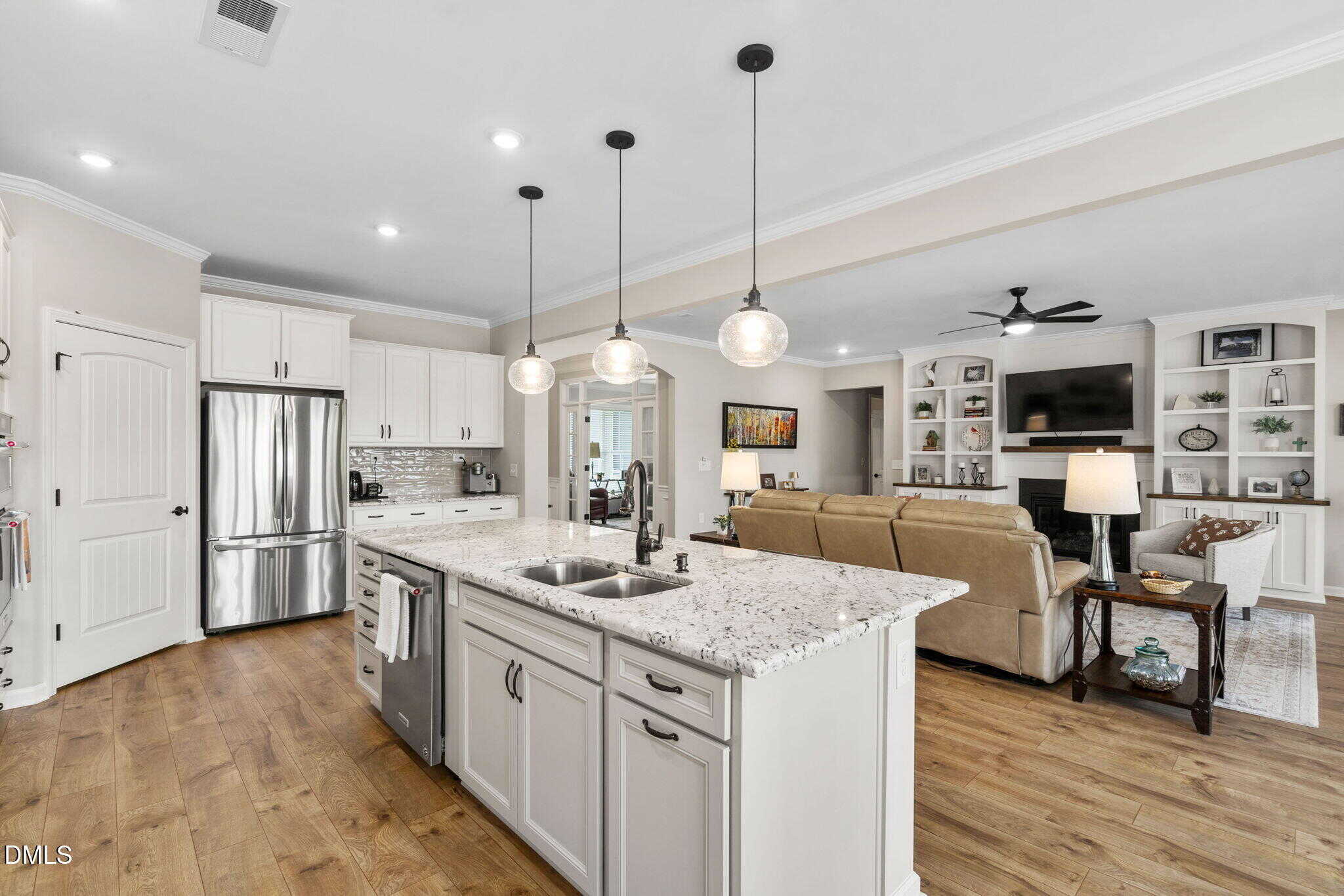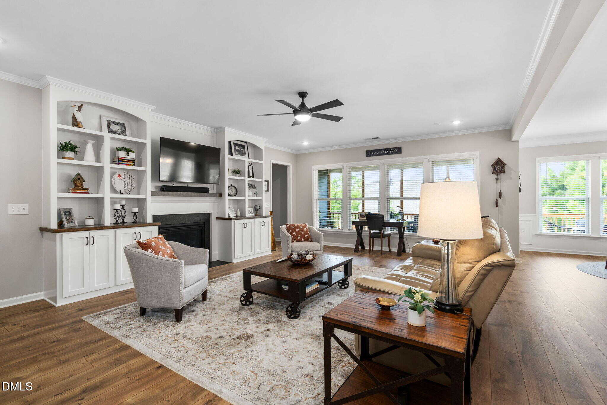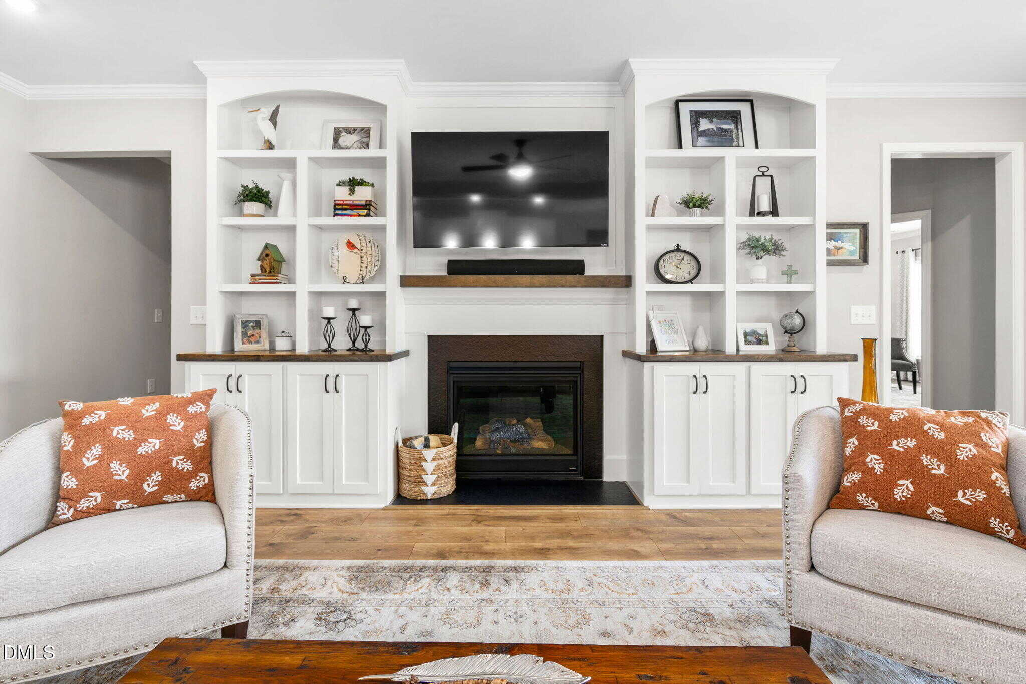 The gourmet kitchen is a showstopper with an oversized center island, quartz countertops, gas cooktop, wall oven, and generous cabinet space. It flows effortlessly into the open dining area and family room, where a gas fireplace framed by custom built-in bookcases creates a warm focal point for gatherings.