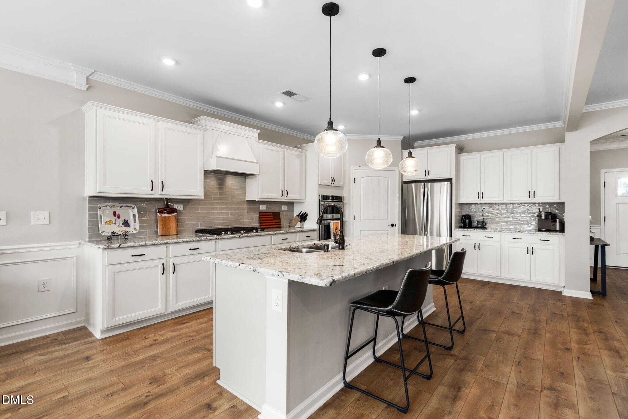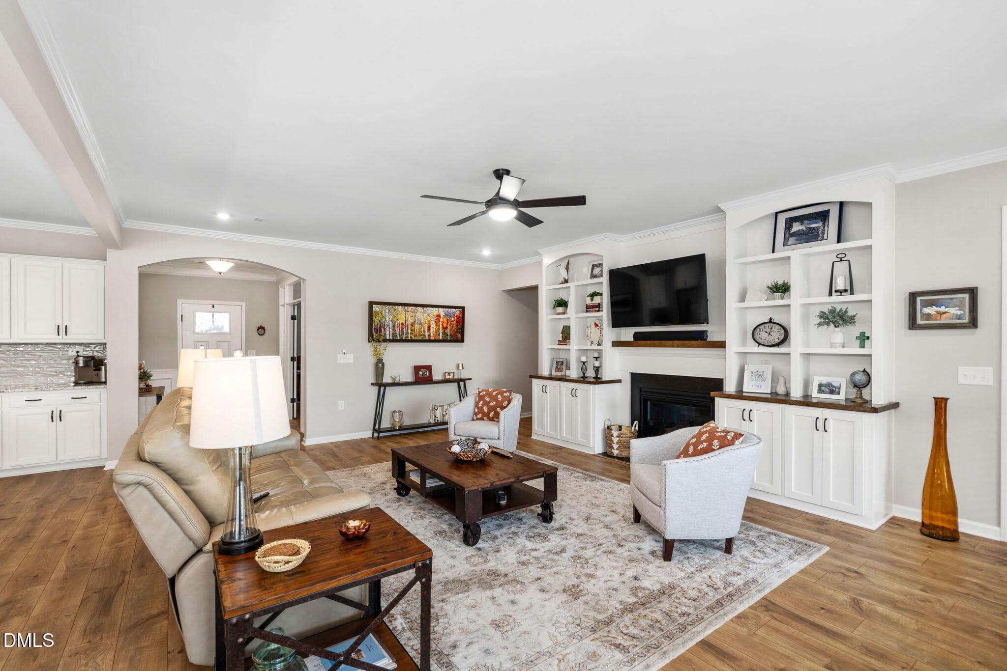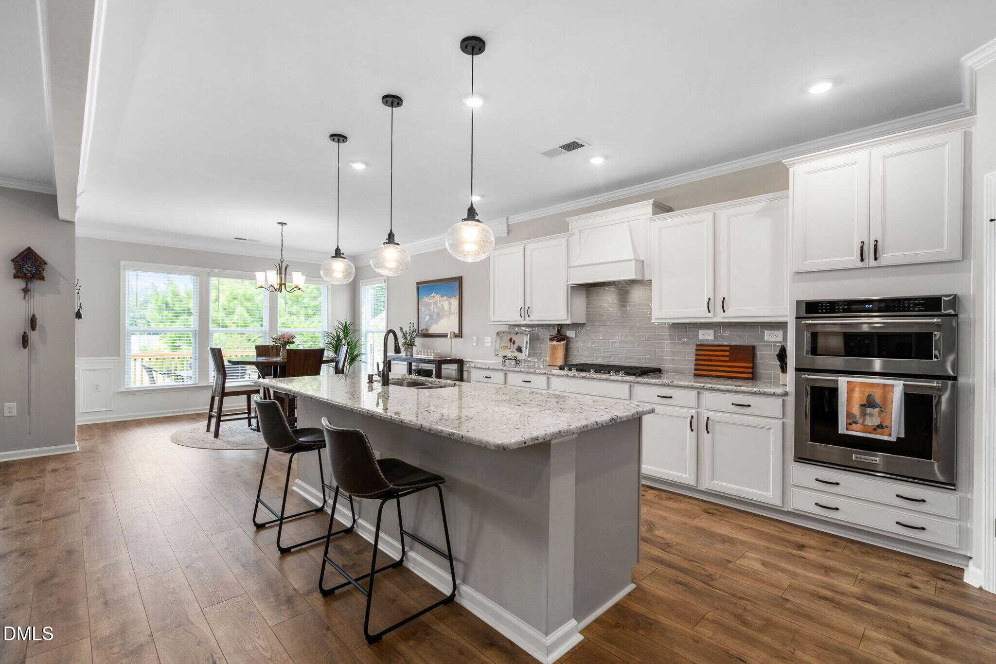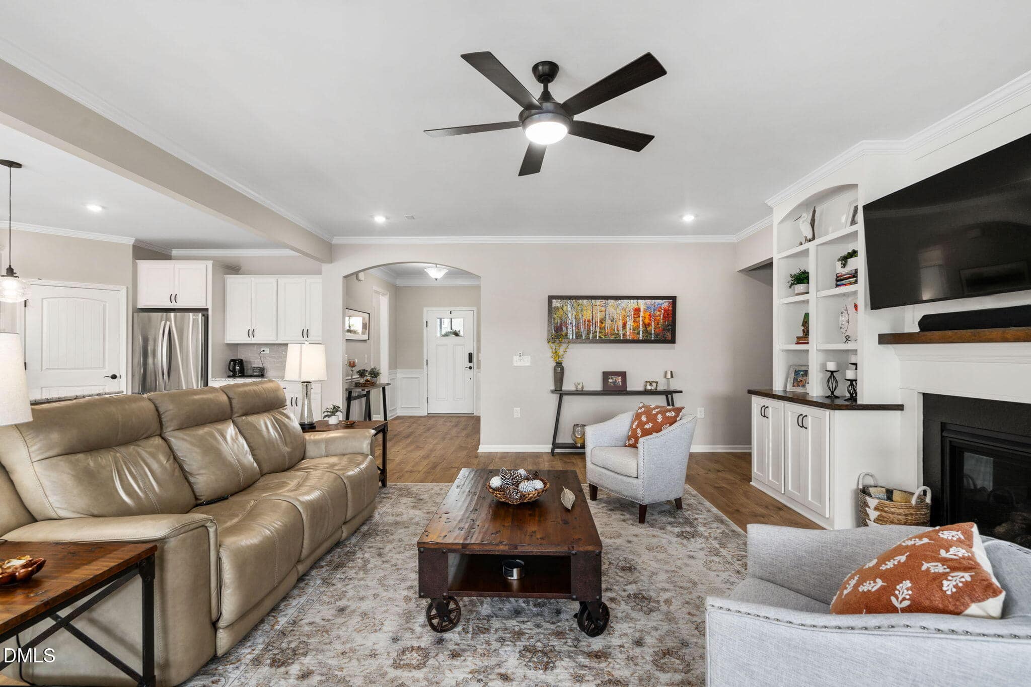 The gourmet kitchen is a showstopper with an oversized center island, quartz countertops, gas cooktop, wall oven, and generous cabinet space. It flows effortlessly into the open dining area and family room, where a gas fireplace framed by custom built-in bookcases creates a warm focal point for gatherings.